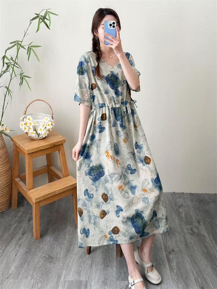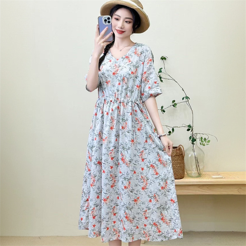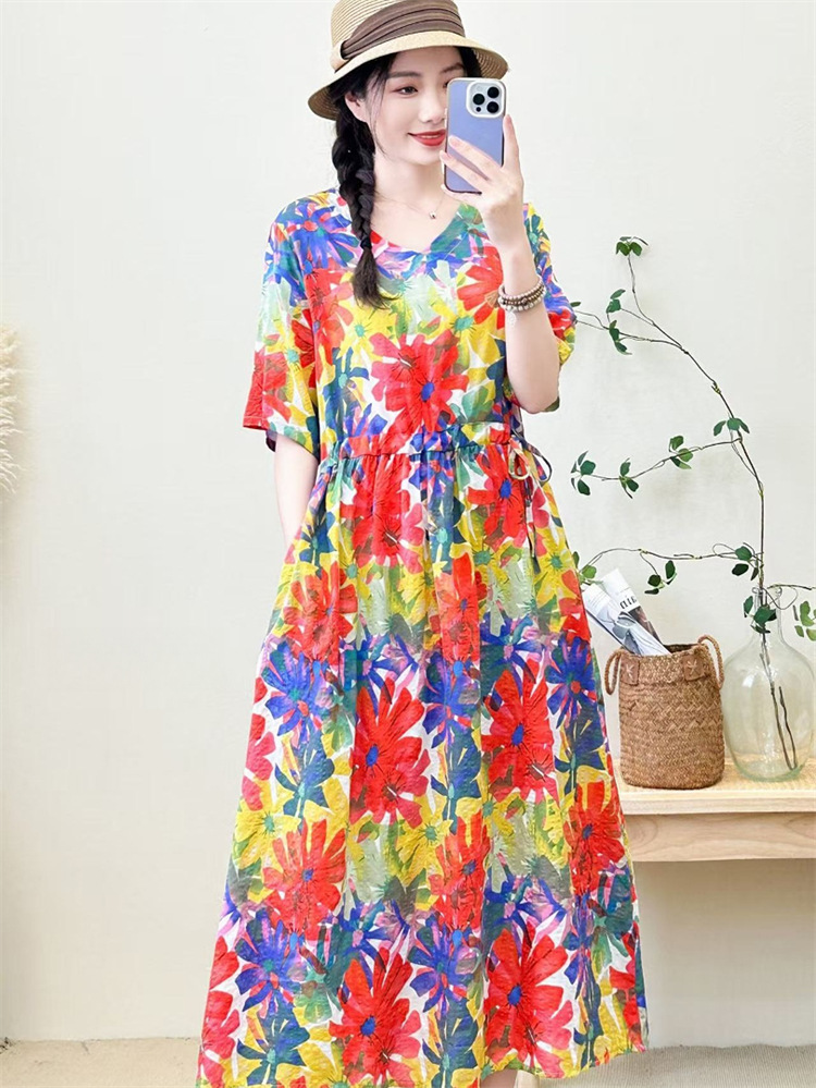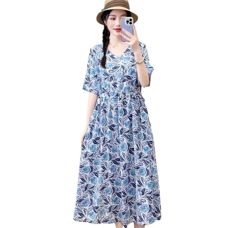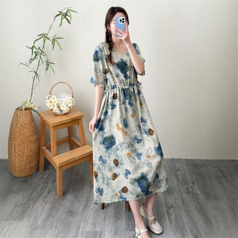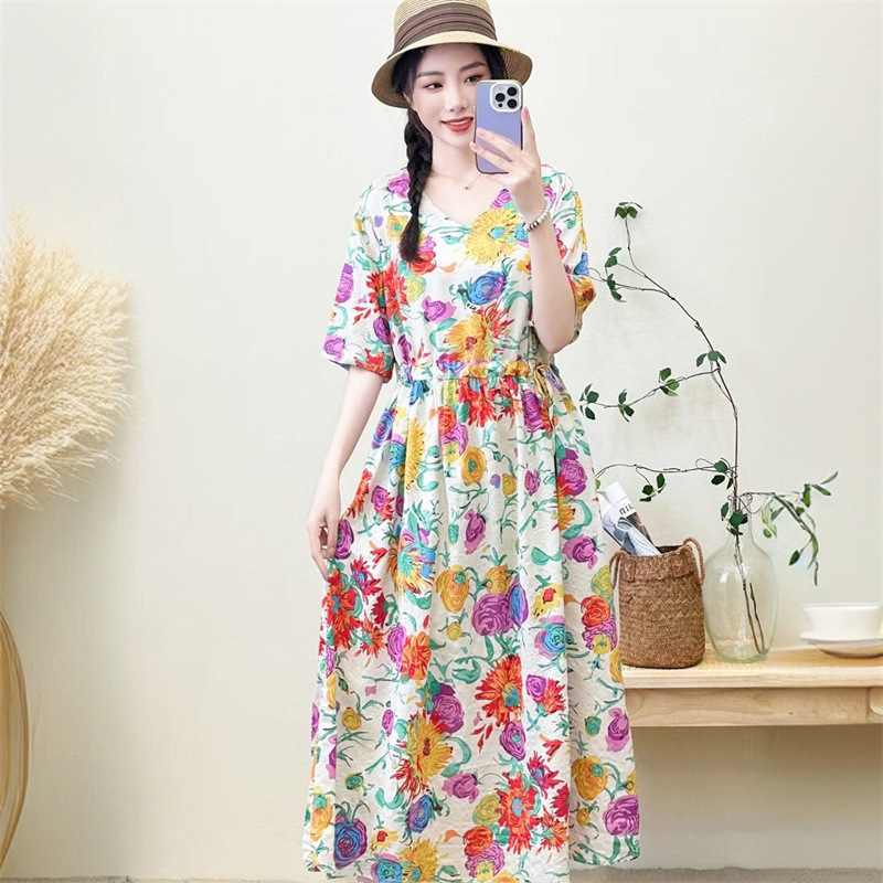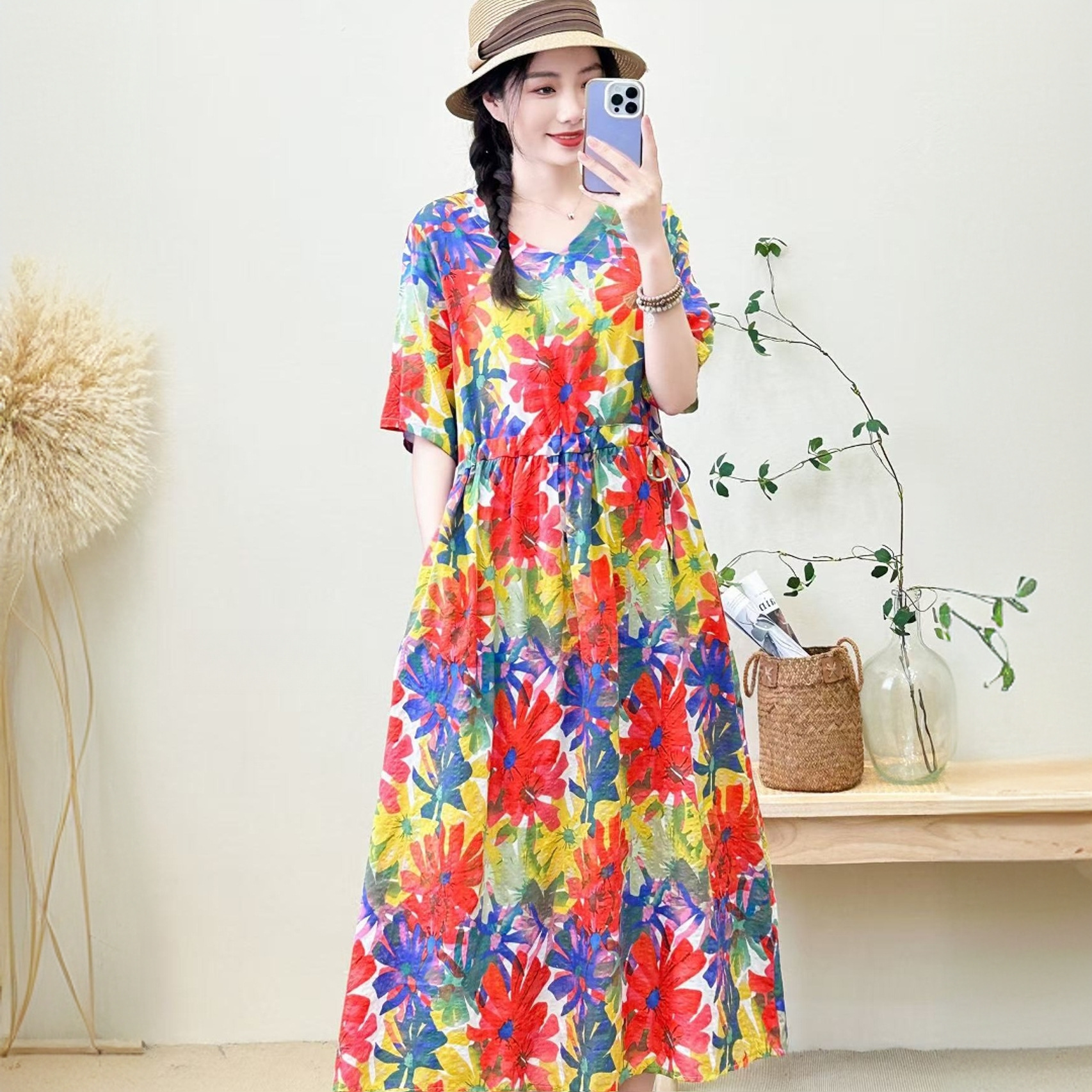 Летнее платье в ретро-стиле с мелким цветочным принтом для женщин 2025 года, свободного кроя, больших размеров, с эффектом стройности, на завязках на талии, длинная юбка.