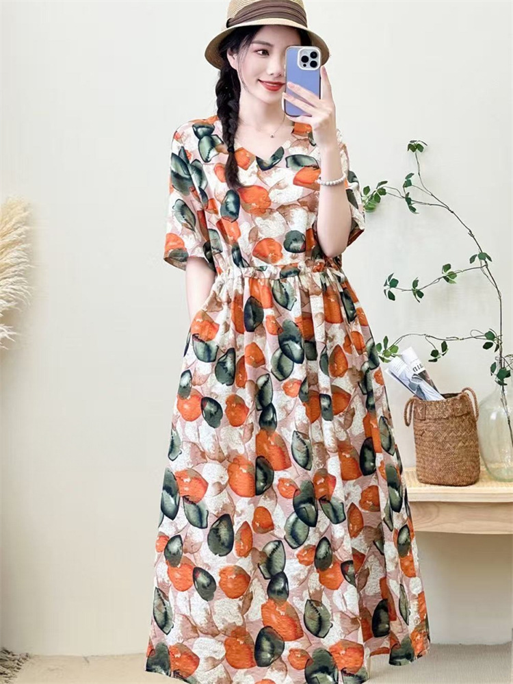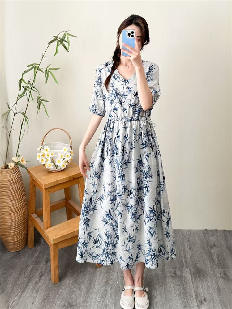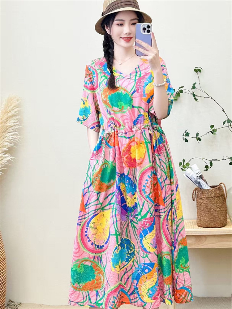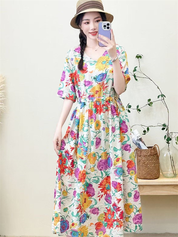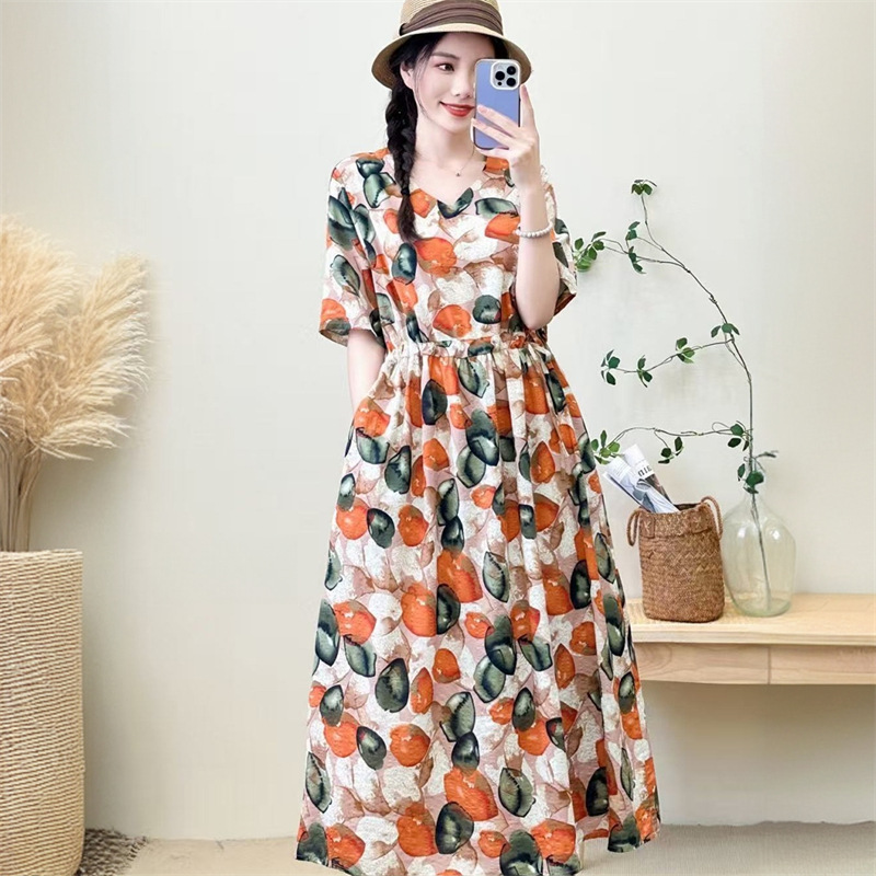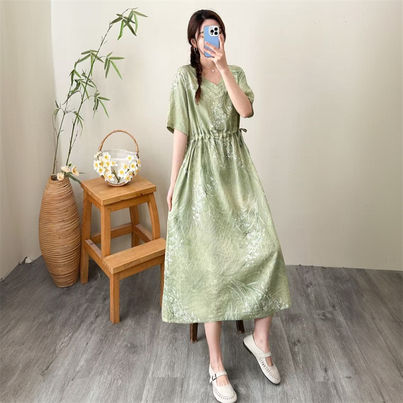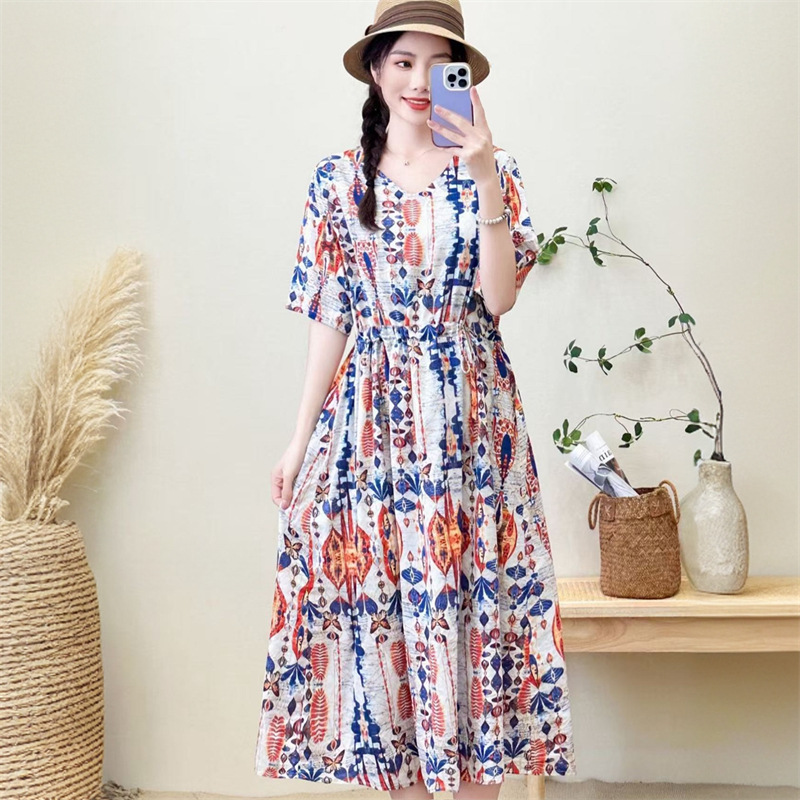 Летнее платье в ретро-стиле с мелким цветочным принтом для женщин 2025 года, свободного кроя, больших размеров, с эффектом стройности, на завязках на талии, длинная юбка.