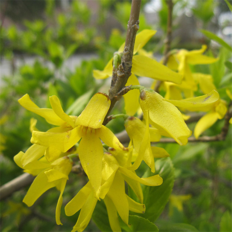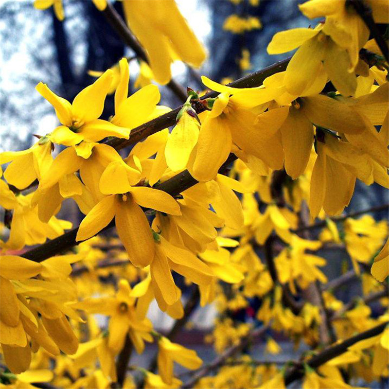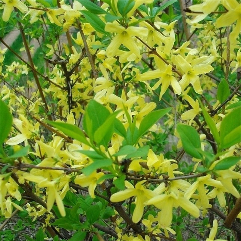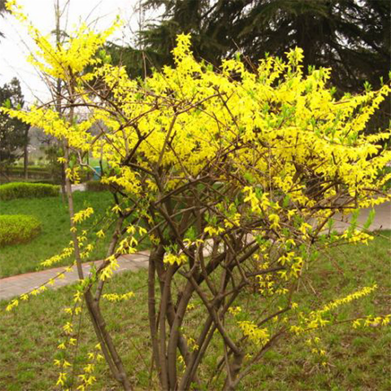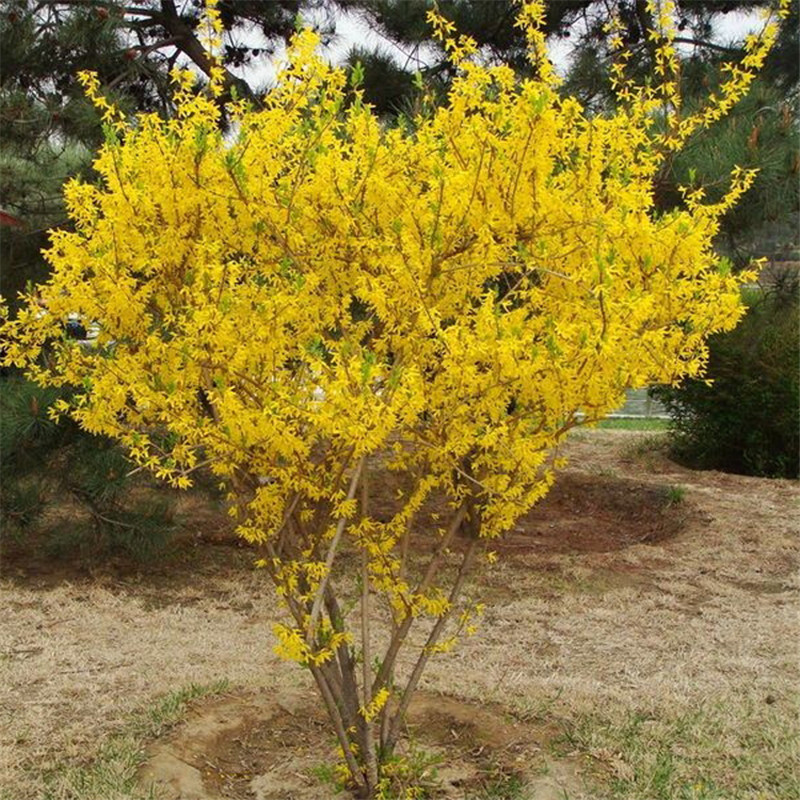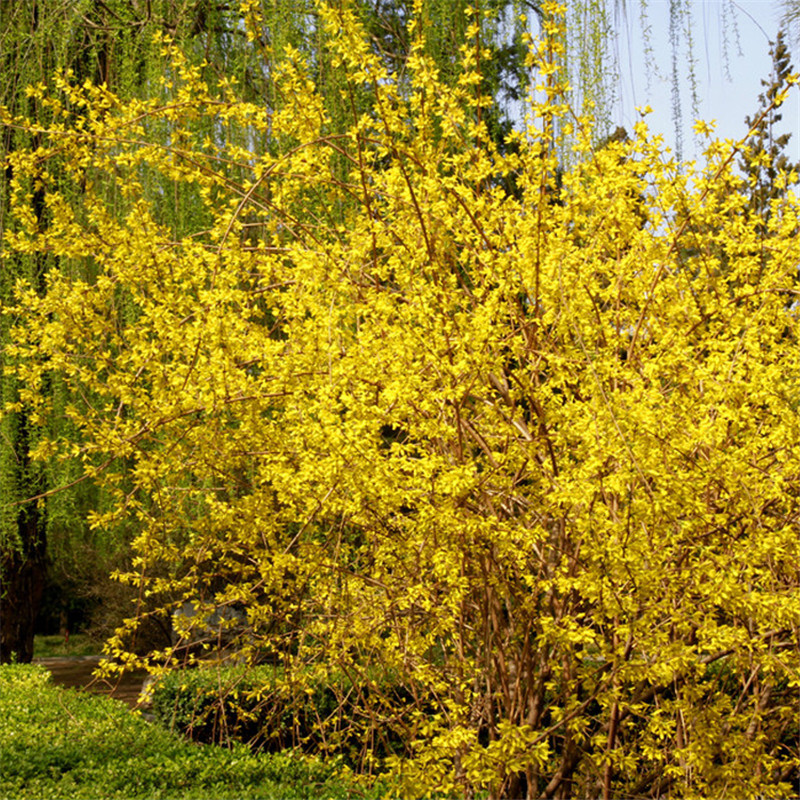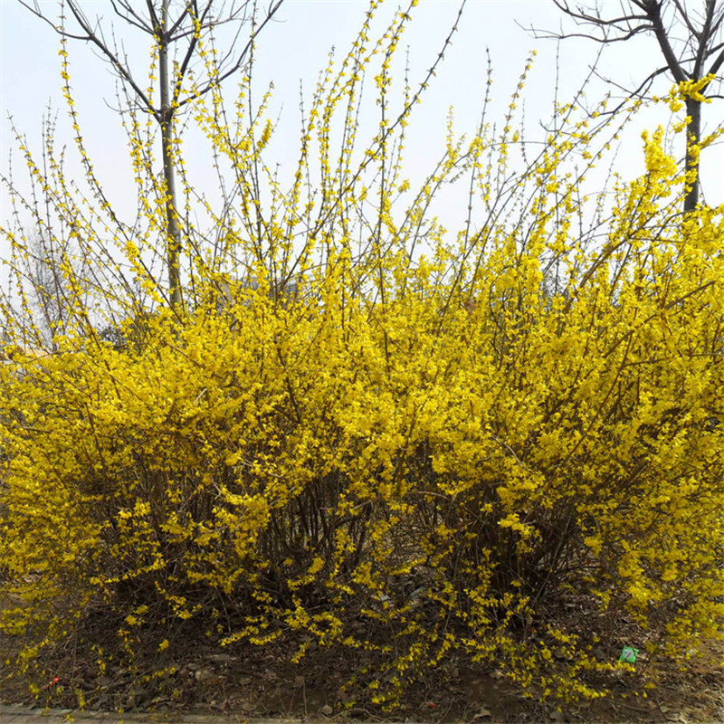 Саженцы жимолости, стебли желтых цветов, желтая долговечность, саженцы желтого тигра, золотой колокольчик, зеленеющие кустарники во дворе и саженцы дорожно-строительных работ.