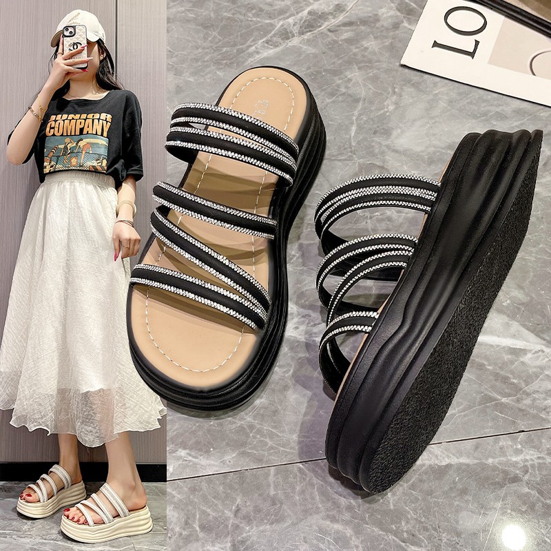 Женские летние сандалии больших размеров в корейском стиле, оптовая торговля, 2025, новые, пляжные, на толстой подошве, с тонкими ремешками и стразами, плоские.