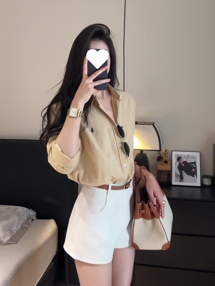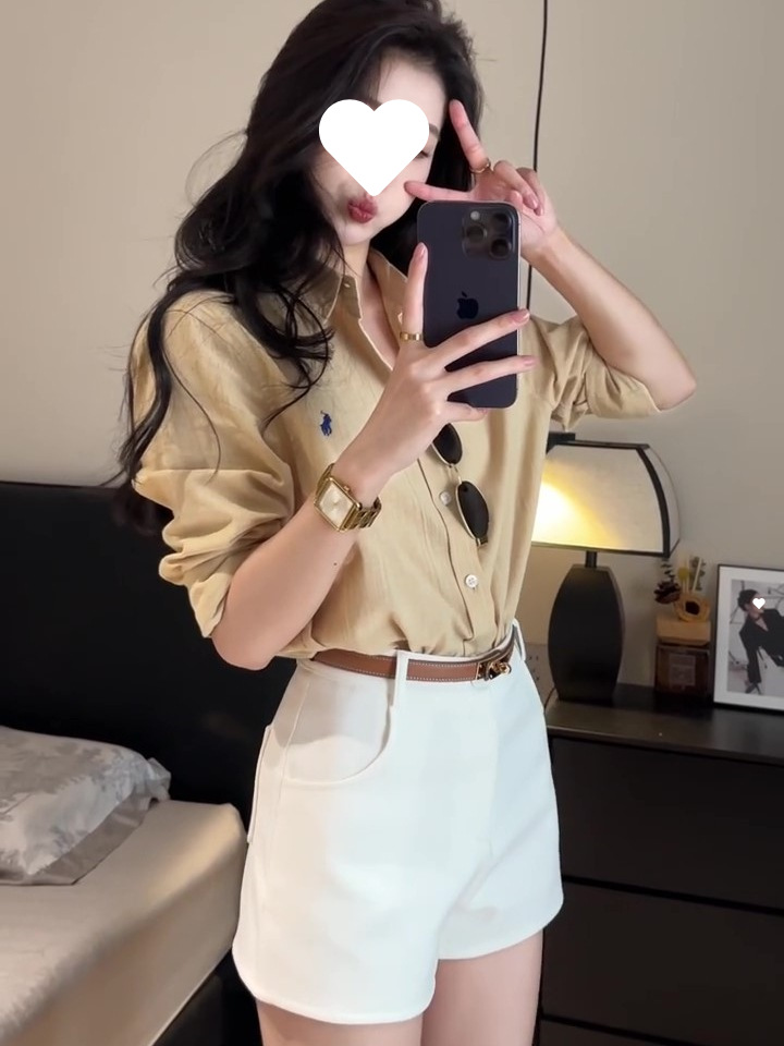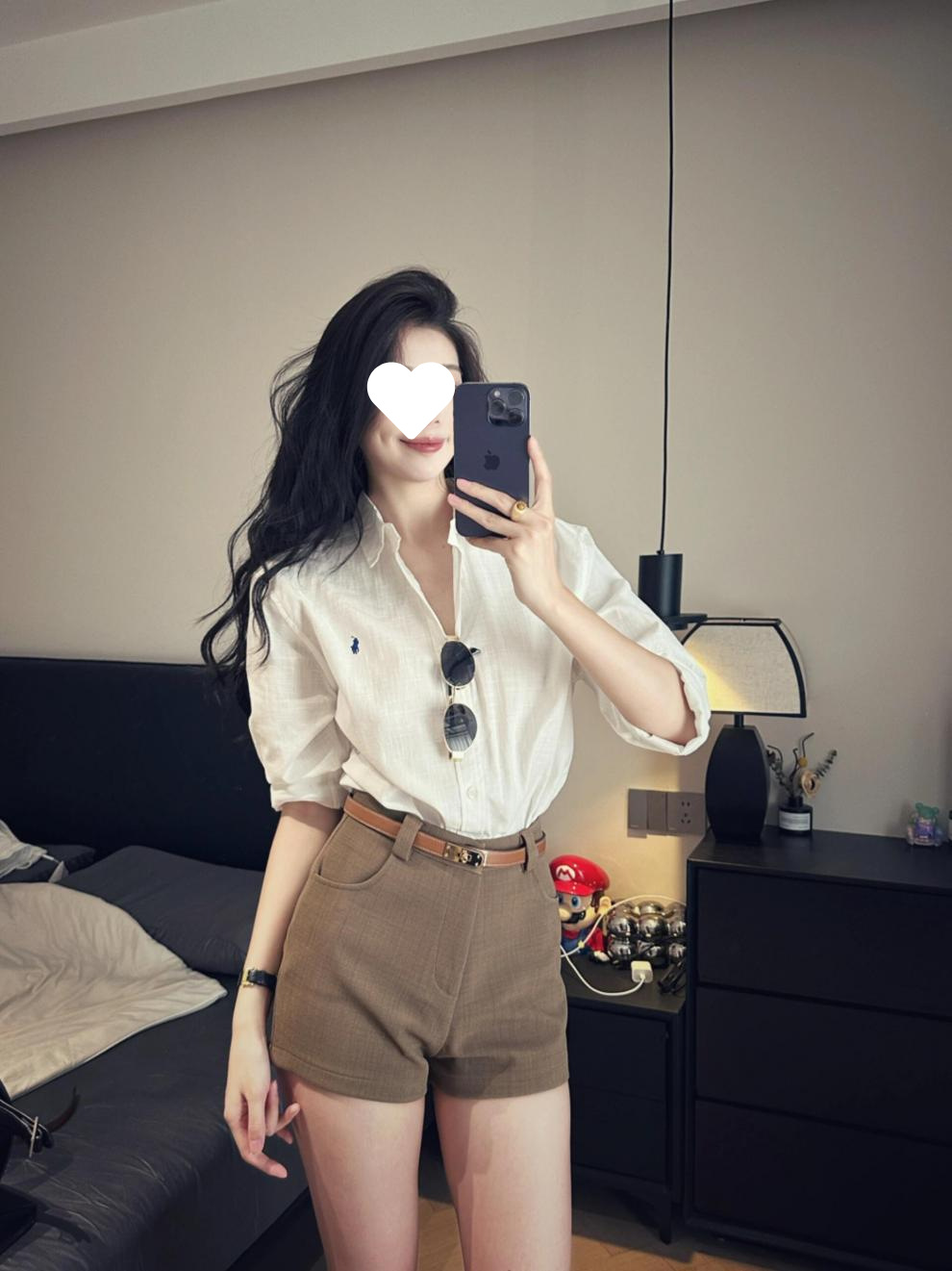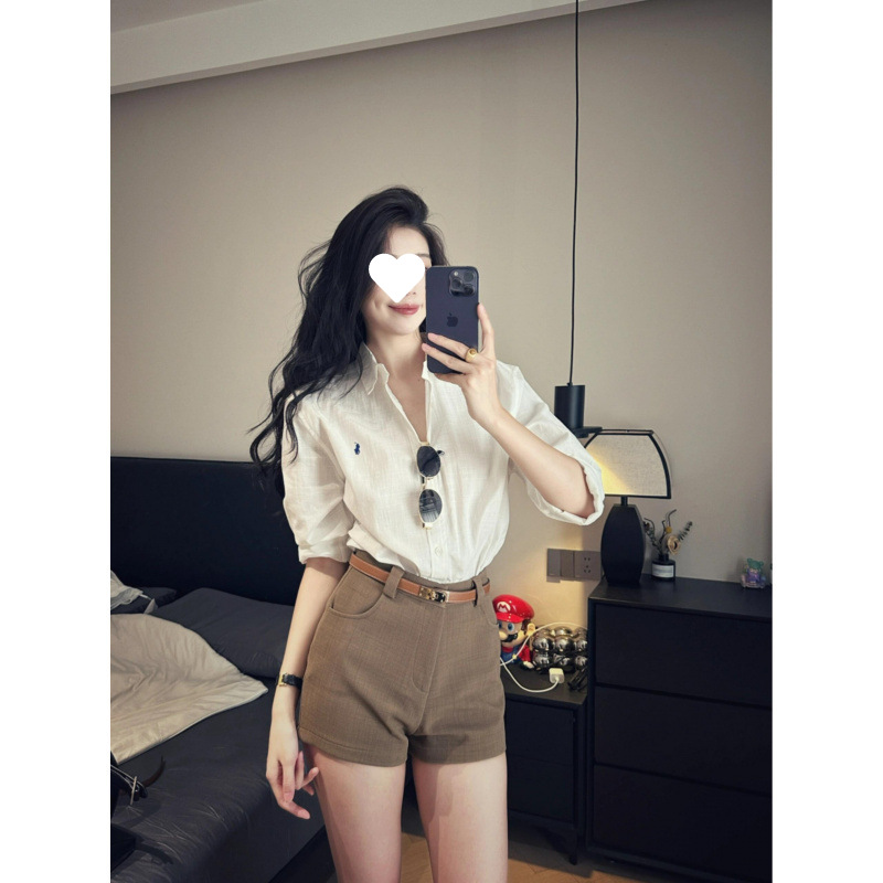 Американский комплект в стиле "старые деньги": свободная льняная рубашка с вышивкой пони + элегантные универсальные шорты с высокой талией, подчеркивающие фигуру