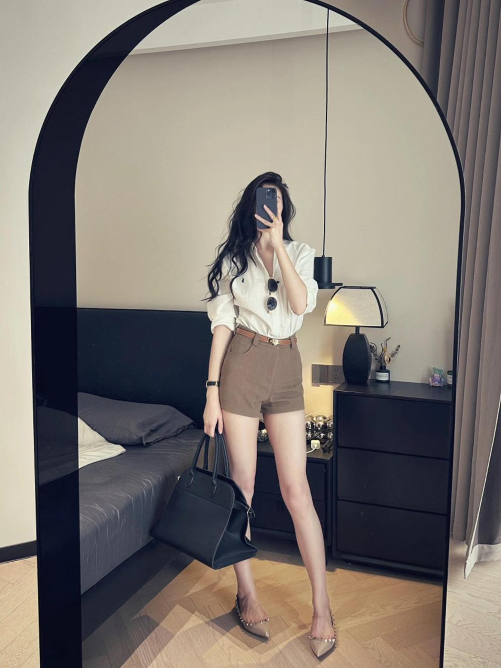 Белые шорты (с поясом); Шорты хаки (с поясом); светлая абрикосовая рубашка; рубашка цвета хаки; Легкая абрикосовая рубашка + шорты цвета хаки.; Рубашка хаки + белые шорты