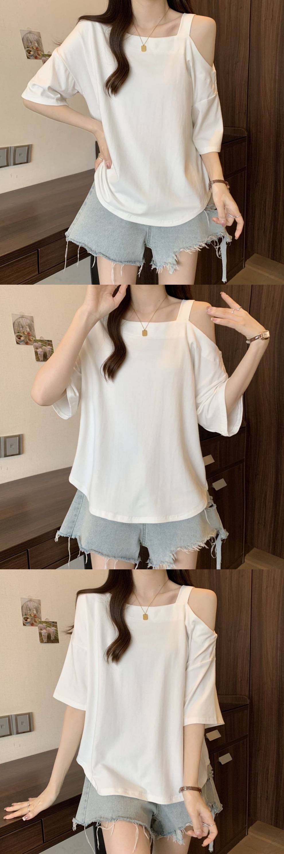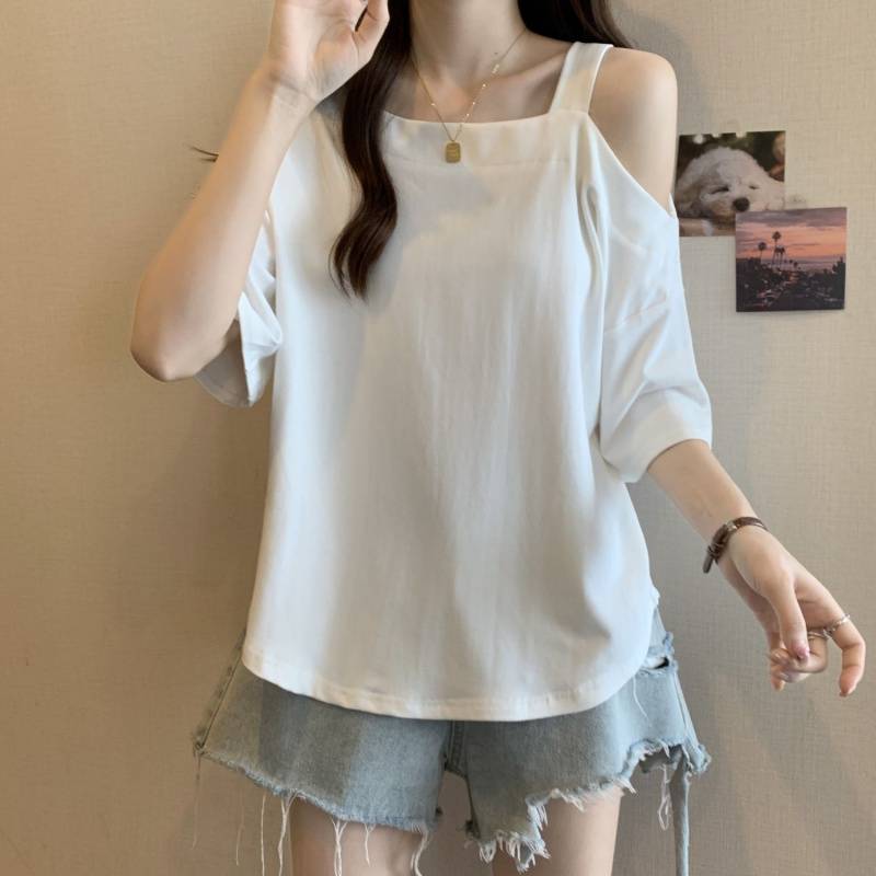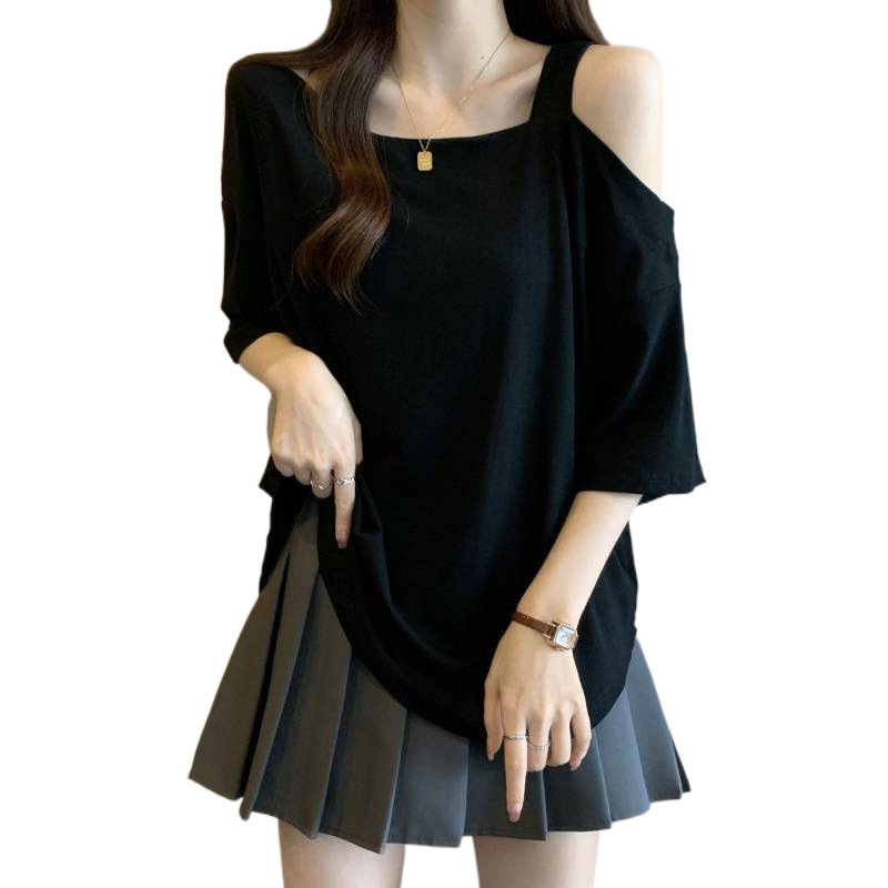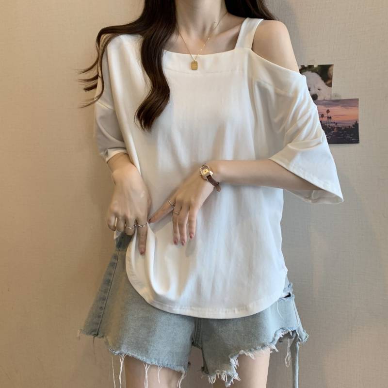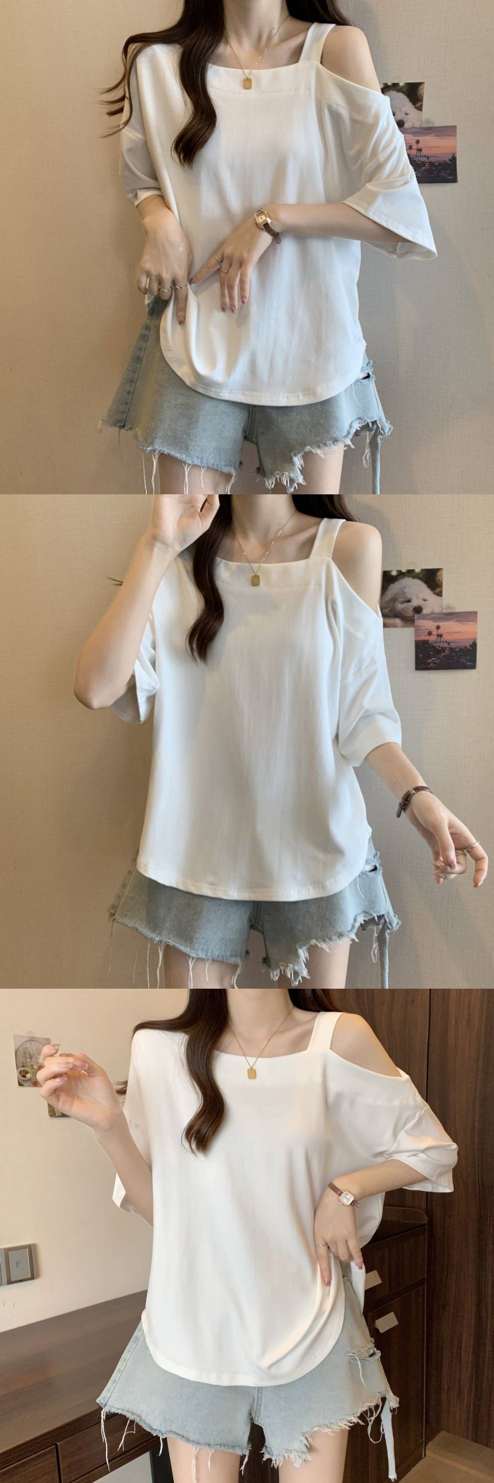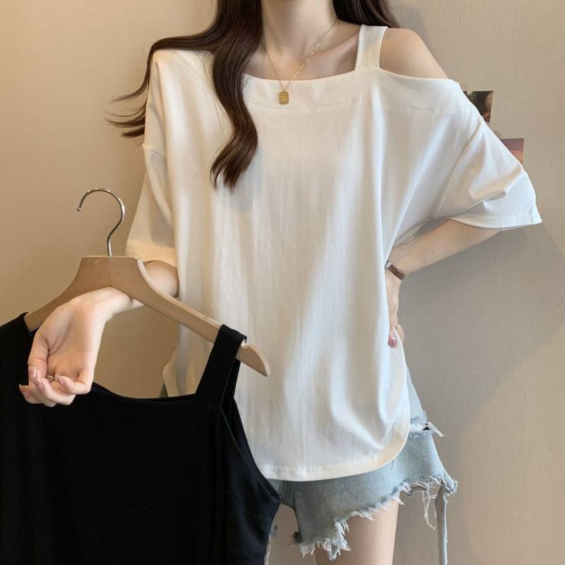 Женская рубашка больших размеров с короткими рукавами нестандартной формы, лето 2025, новый свободный утягивающий топ, закрывающий тело, уменьшающий возраст, однотонный топ с открытыми плечами