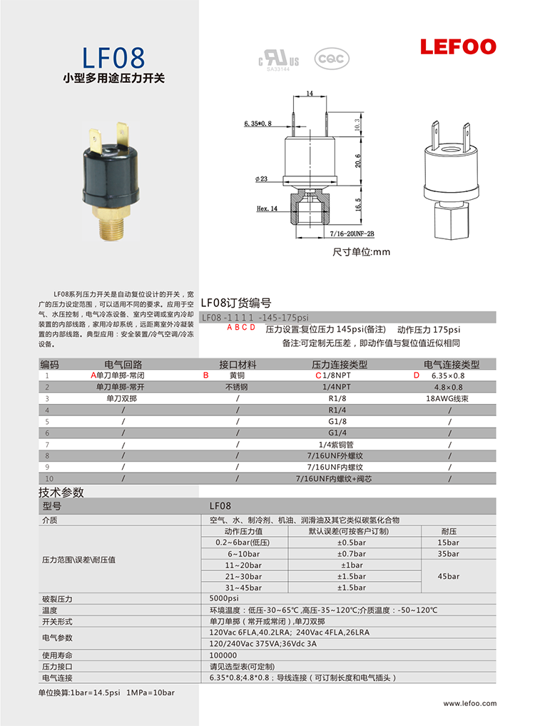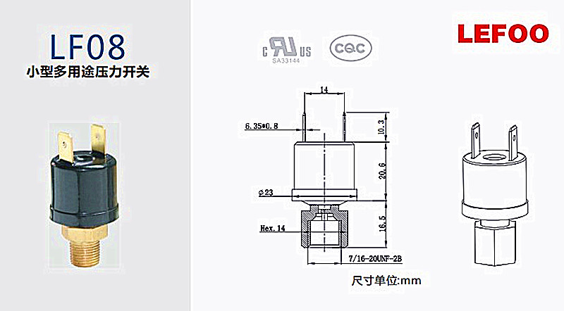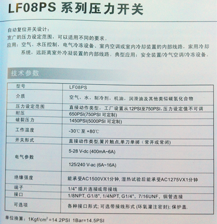 1.LF08系列压力开关是一款具有自动复位功能,体积小,使用范围广的机械式开关。适用于空气,水,润滑油,制冷剂,或者无腐蚀性气体等,比如改装小型气泵,压缩机,水泵控制压力大小达到自动启停功能,或者用于检测设备管道中的压力大小,达到保护设备功能(比如油泵油压的高低压保护,水泵缺水水压保护,用气设备缺气保护)