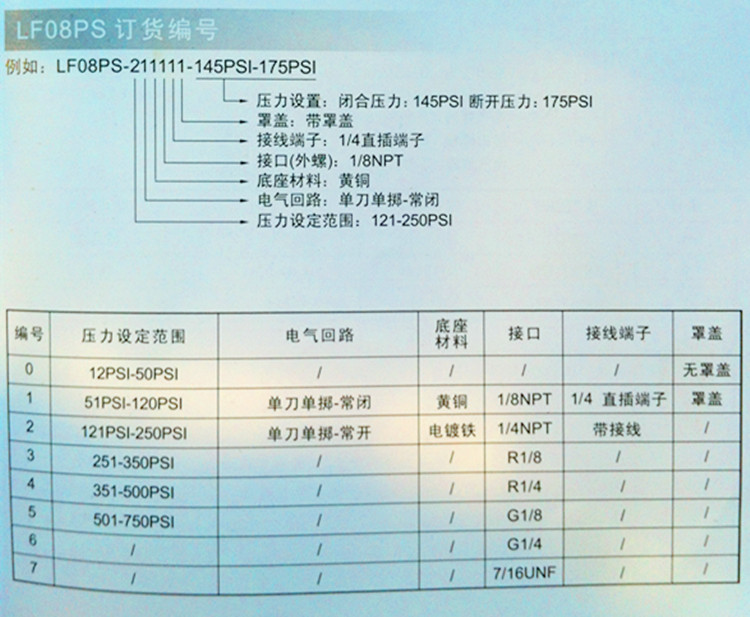 6.如何选着正确开关注意几个方面:1.提供开关样品图片,2.确定压力参数和螺纹尺寸(不懂联系客服)3.比如0.1-0.2MPA常开型的开关压力到达0.2MPA接通触点,低于0.1MPA断开触点,常闭型的开关压力到达0.2MPA触点断开,低于0.1MPA触点接通。