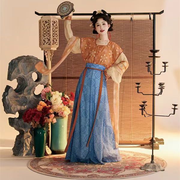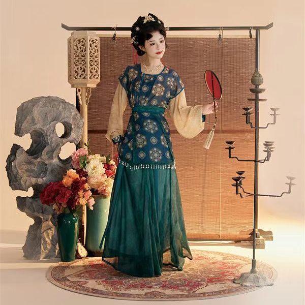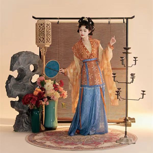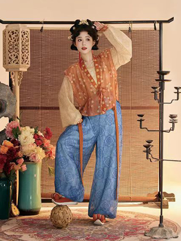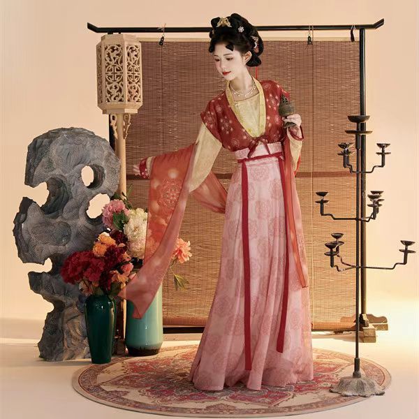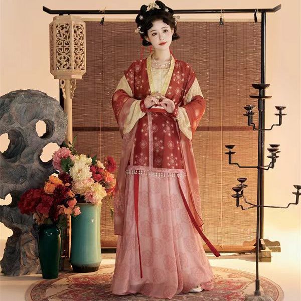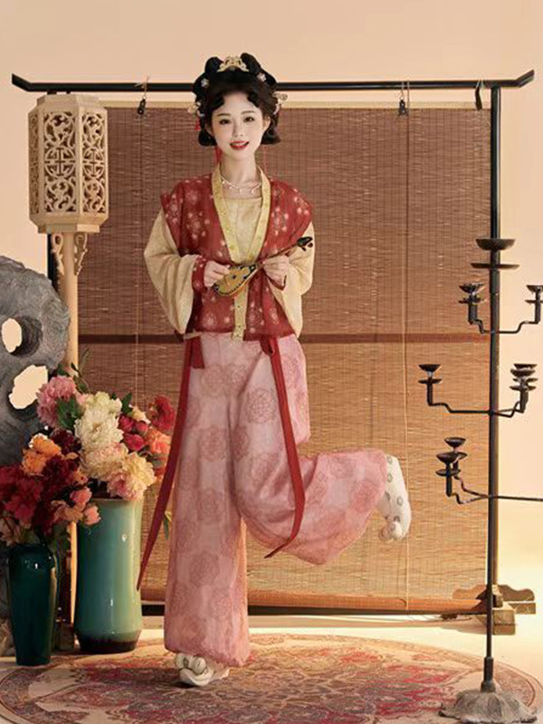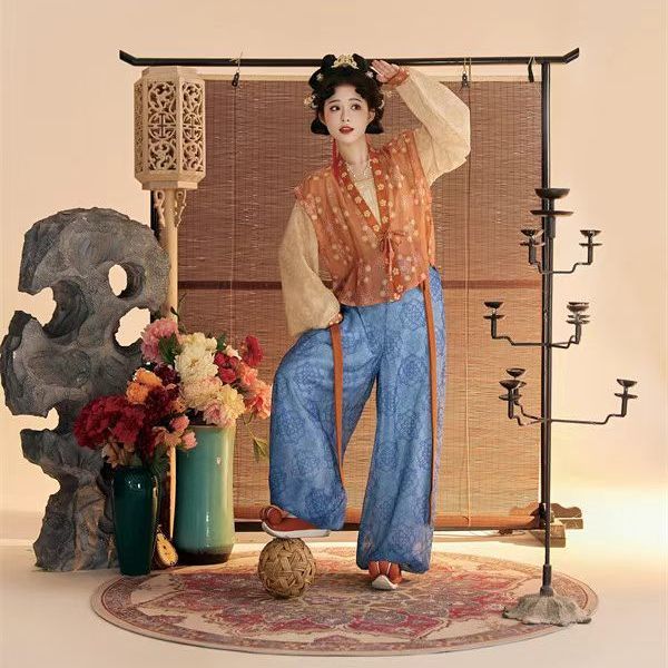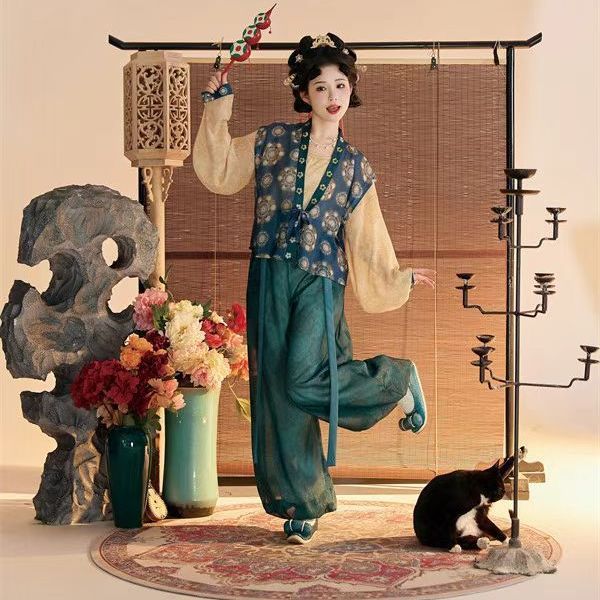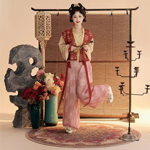 Женский костюм ханьфу в стиле Тан 2025 года, восстановленный, с разрезной юбкой и фонарными штанами, стройнящий и элегантный комплект из трёх цветов.