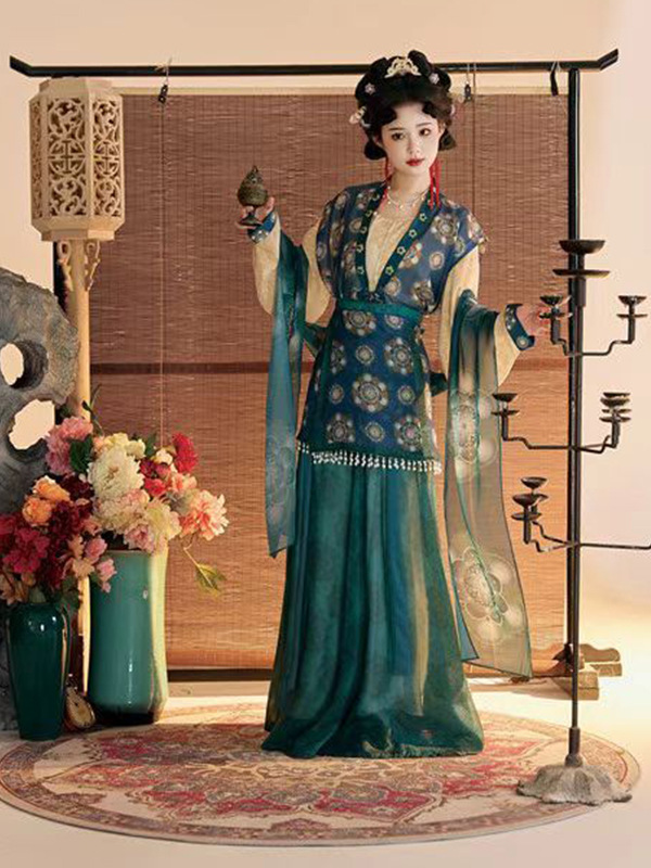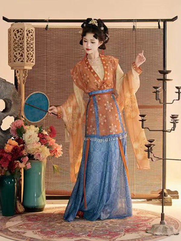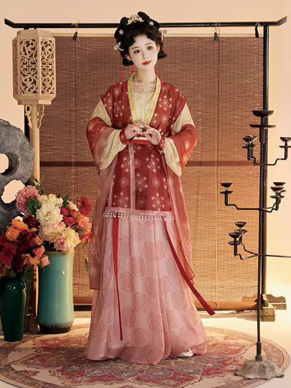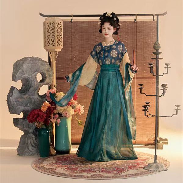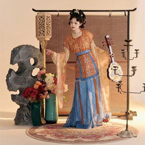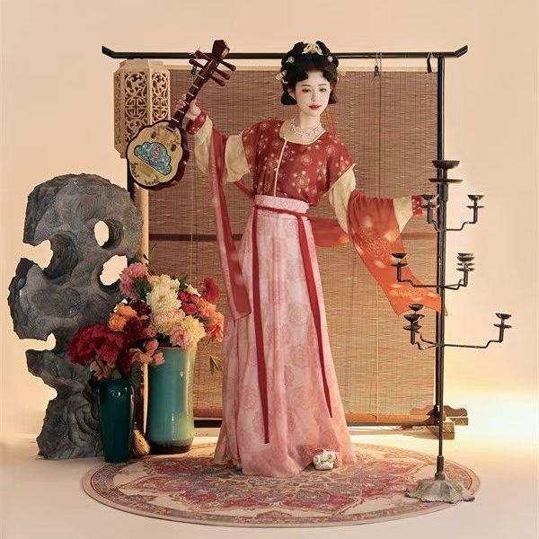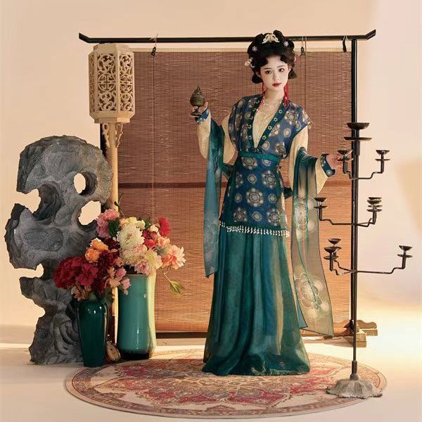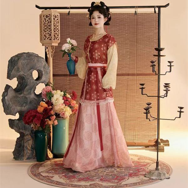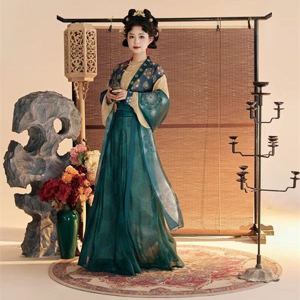 Женский костюм ханьфу в стиле Тан 2025 года, восстановленный, с разрезной юбкой и фонарными штанами, стройнящий и элегантный комплект из трёх цветов.