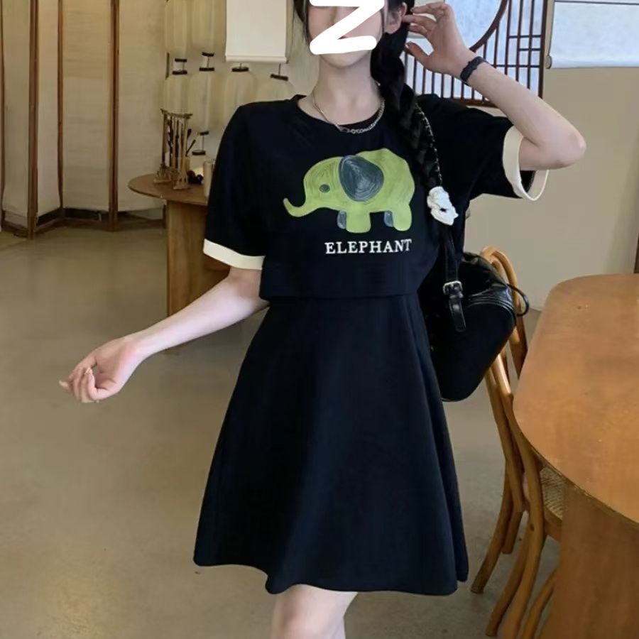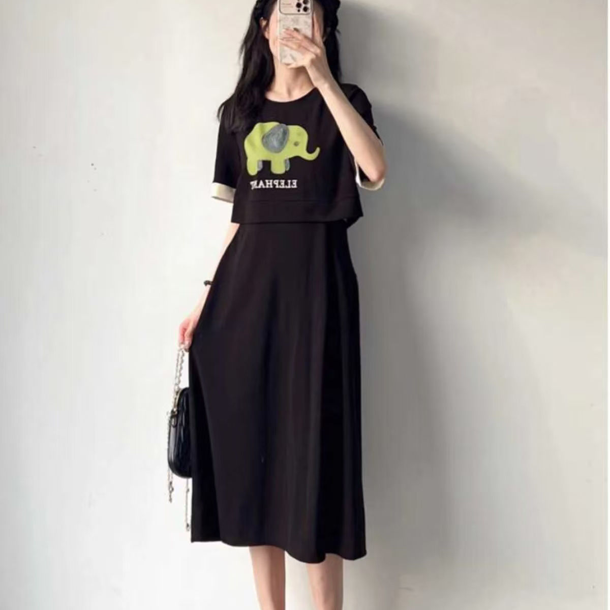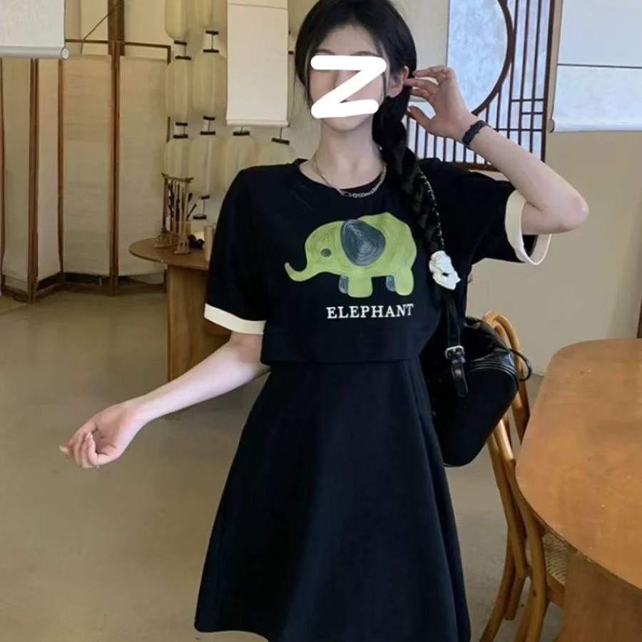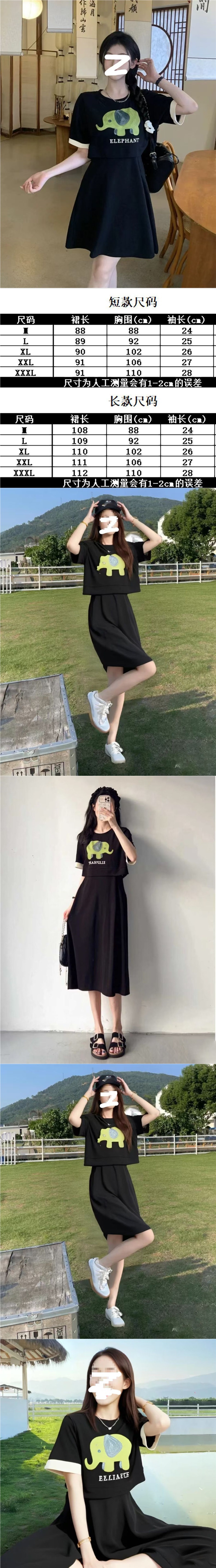 Летняя свежая женская одежда скрывает тело и выглядит стройнящим, платье с короткими рукавами контрастного цвета, искусственная двухсекционная маленькая черная юбка с принтом в западном стиле.