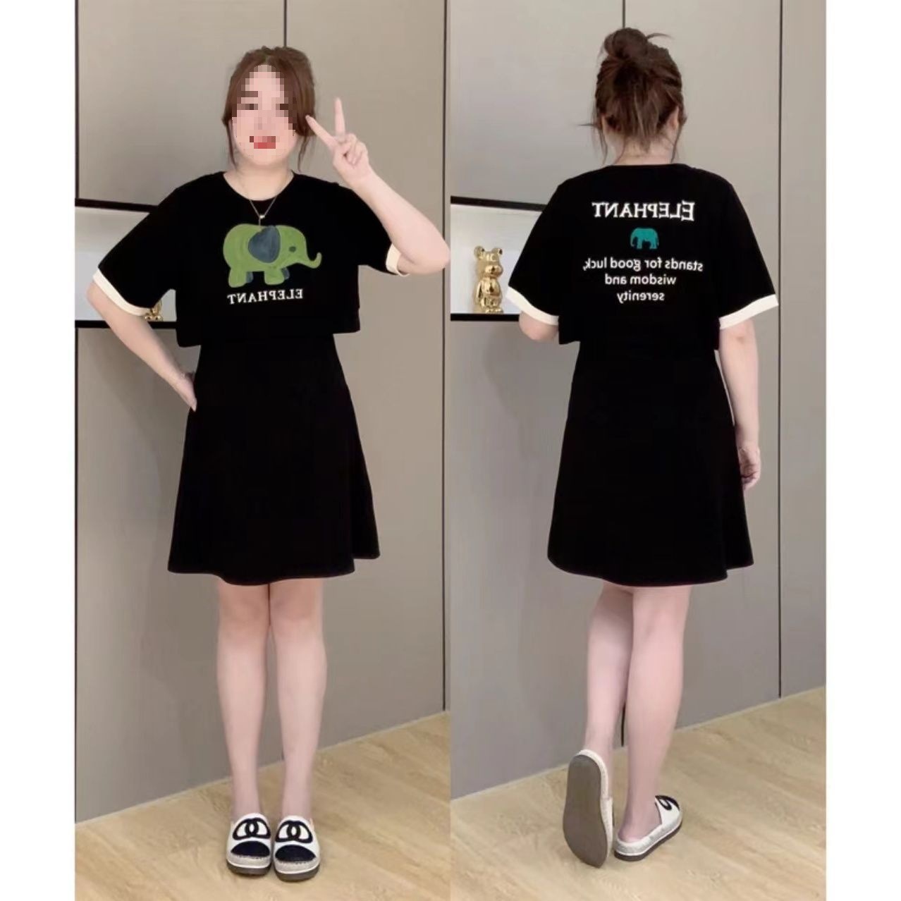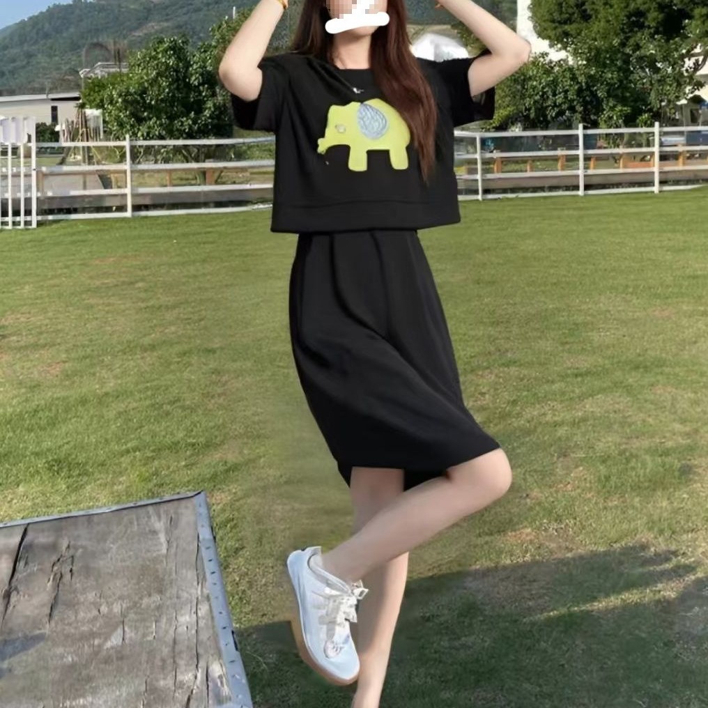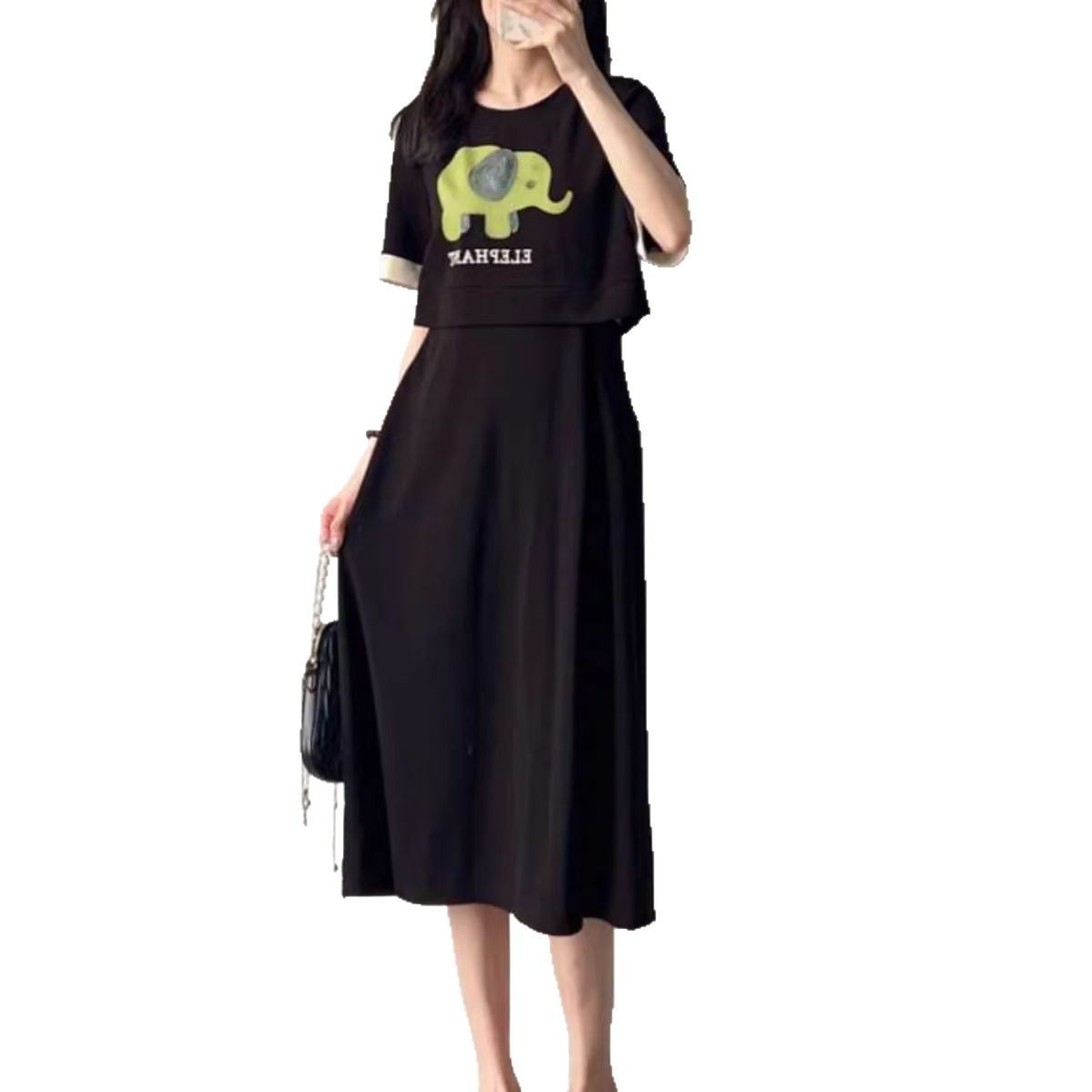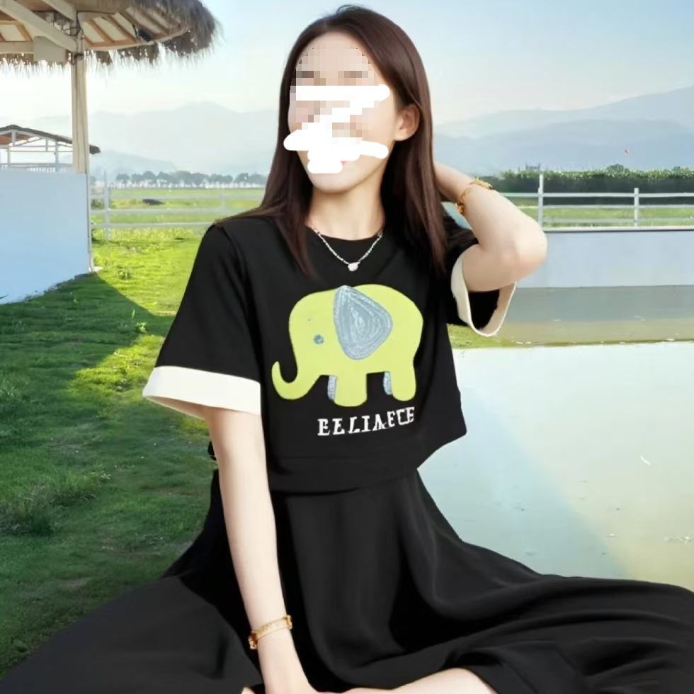 Летняя свежая женская одежда скрывает тело и выглядит стройнящим, платье с короткими рукавами контрастного цвета, искусственная двухсекционная маленькая черная юбка с принтом в западном стиле.