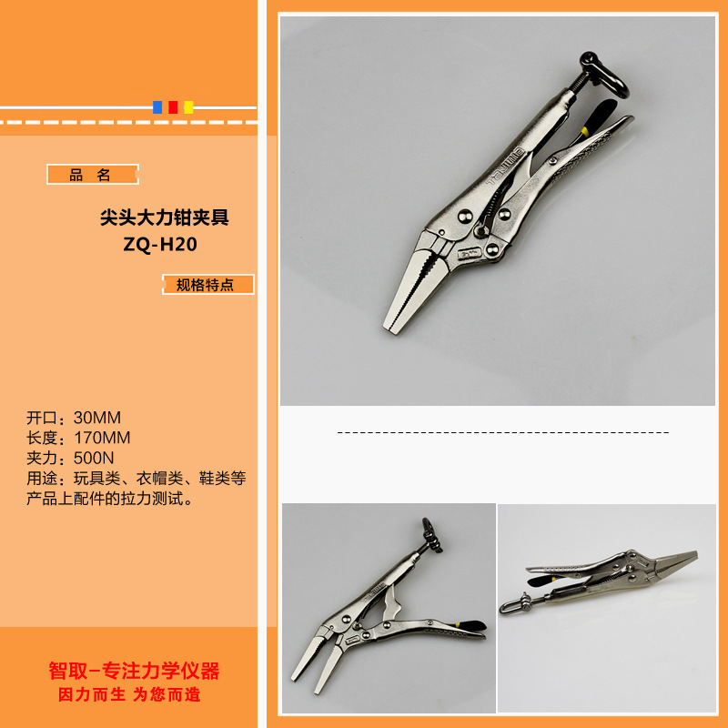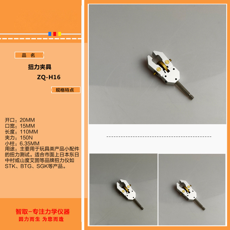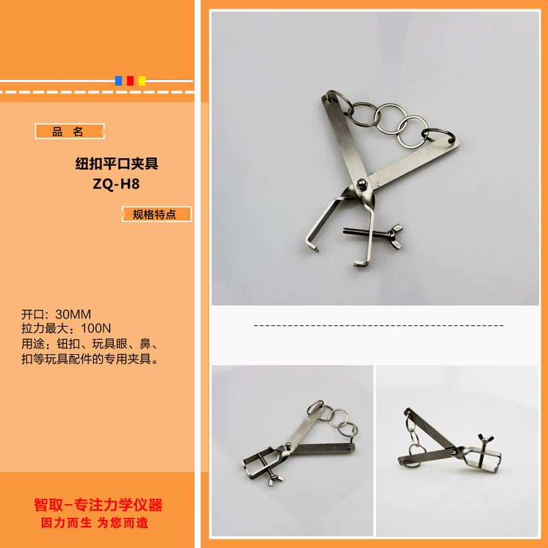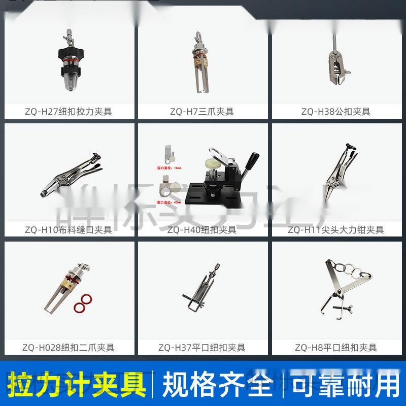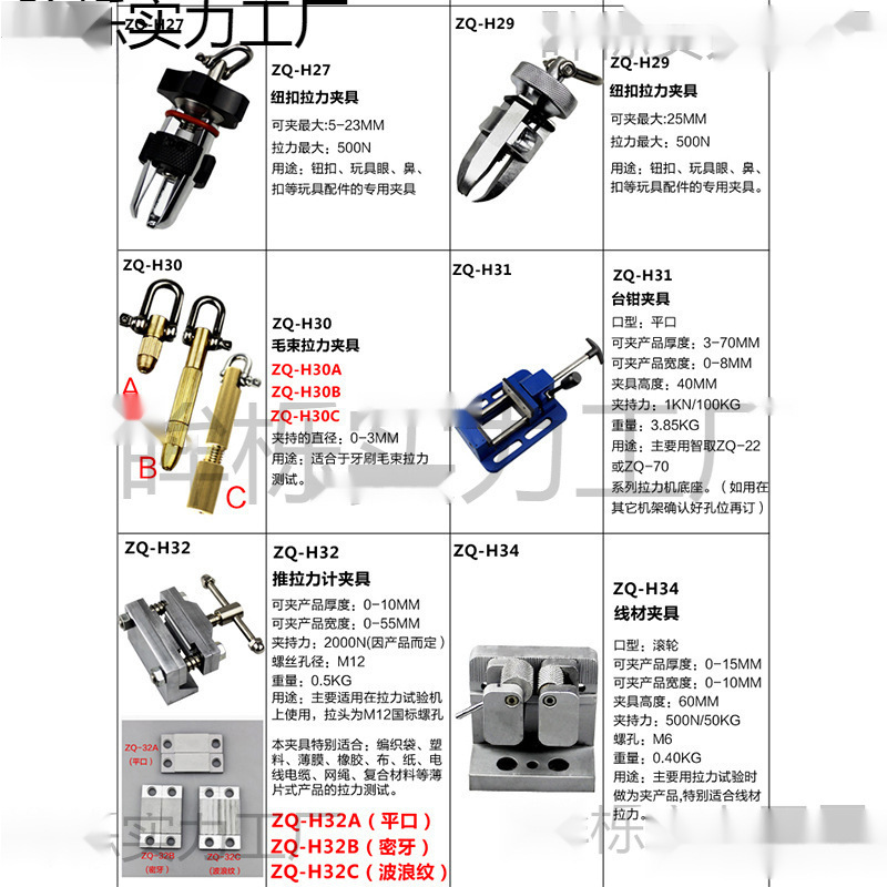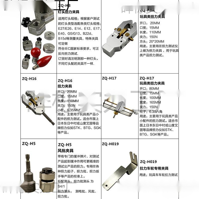 Двухзахватный зажим ZQ-H028; ZQ-H7/трехкулачковый зажим; ZQ-H8/многокольцевое плоское приспособление; ZQ-H9/трехкулачковый зажим; ZQ-H10/зажим для натяжения шва; ZQ-H11/заостренные плоскогубцы; ZQ-H13/Мощные плоскогубцы с круглой головкой; ZQ-H27/приспособление с пряжкой; ZQ-H29/трехкулачковый зажим; ZQ-H30/прибор для вытягивания пучков волос; ZQ-H31/зажим для тисков; ZQ-011 зажим для прикуса; ZQ-H40/основание кнопки; ZQ-H1/уплотнитель крышки бутылки; ZQ-H2/с креплением буферного двигателя; ZQ-2A/моторное приспособление; ZQ-H3/зажим для головки лампы/одинарный; ZQ-H5/ветровое пакетное приспособление; ZQ-H6A/игрушечный динамометрический зажим; ZQ-H16/зажим среднего крутящего момента; ZQ-H17/зажим большой крутящий момент; Плоский зажим ZQ-H37; Мужской зажим с пряжкой ZQ-H38