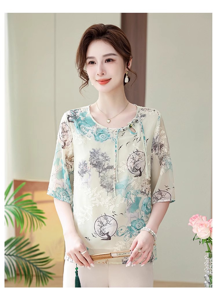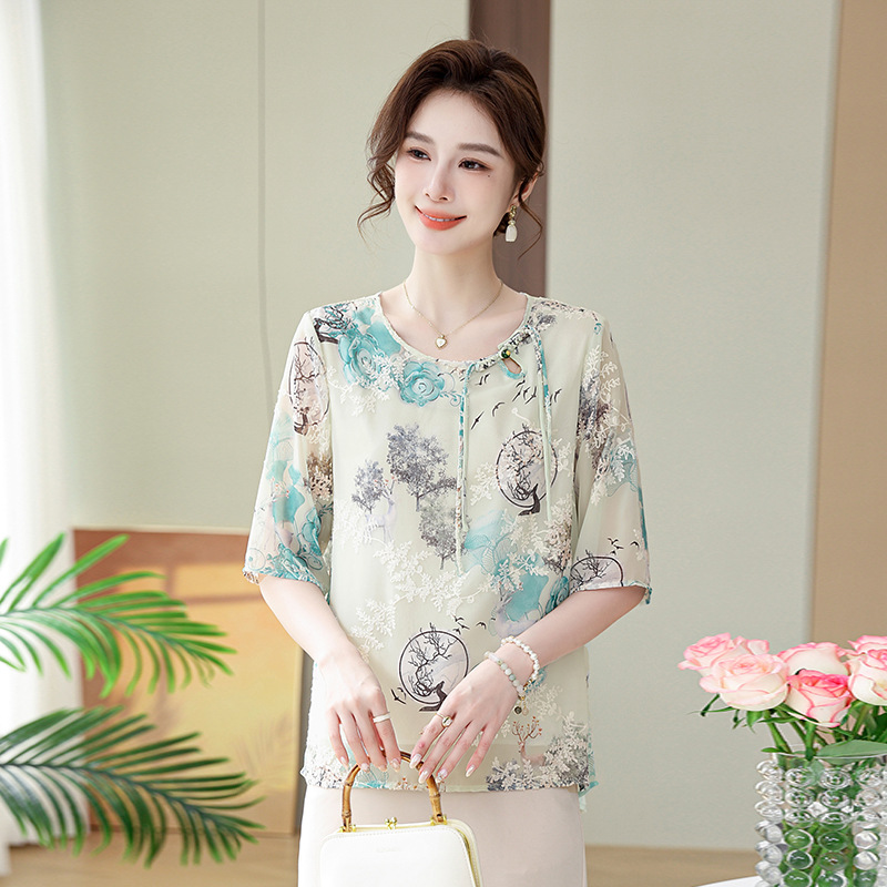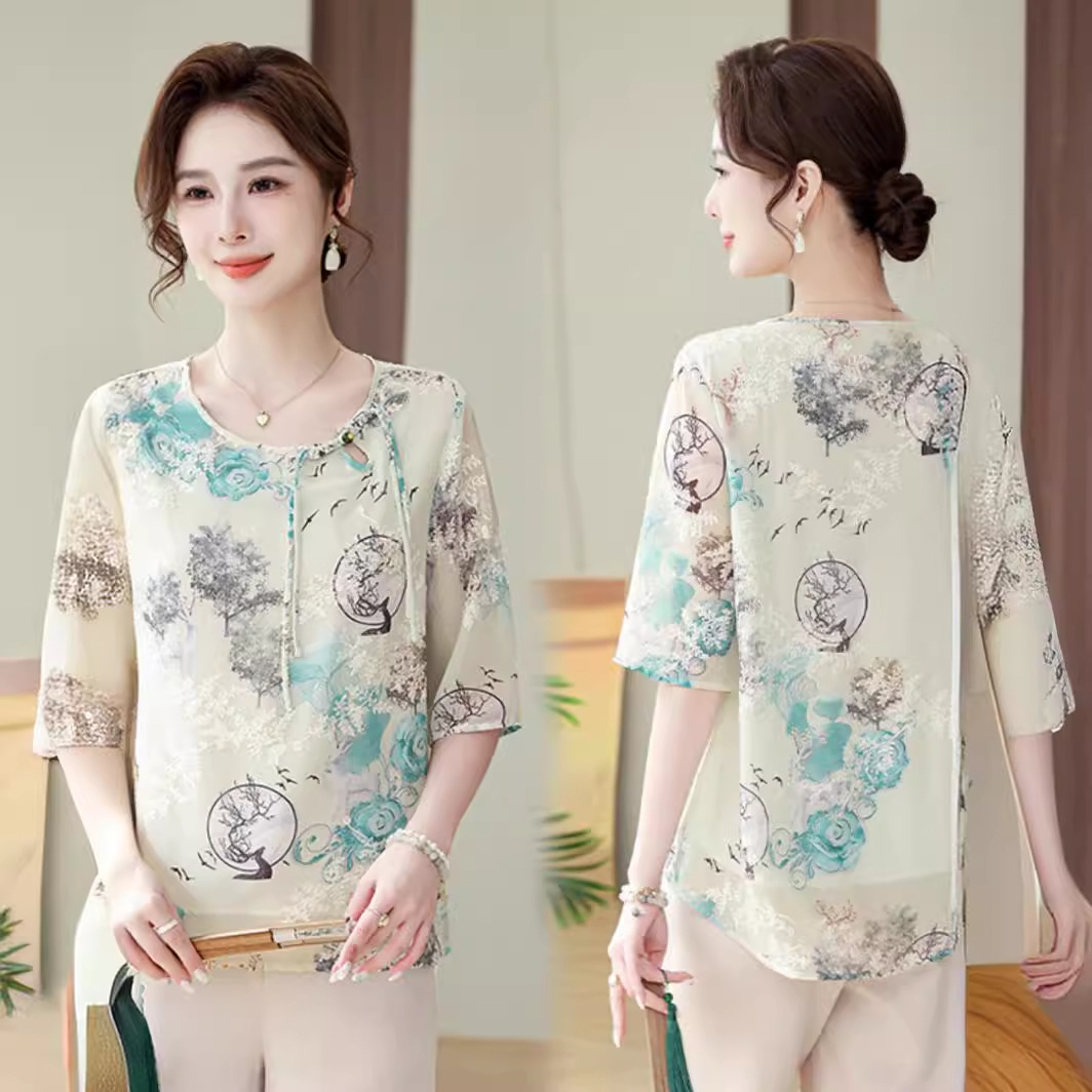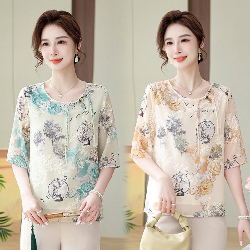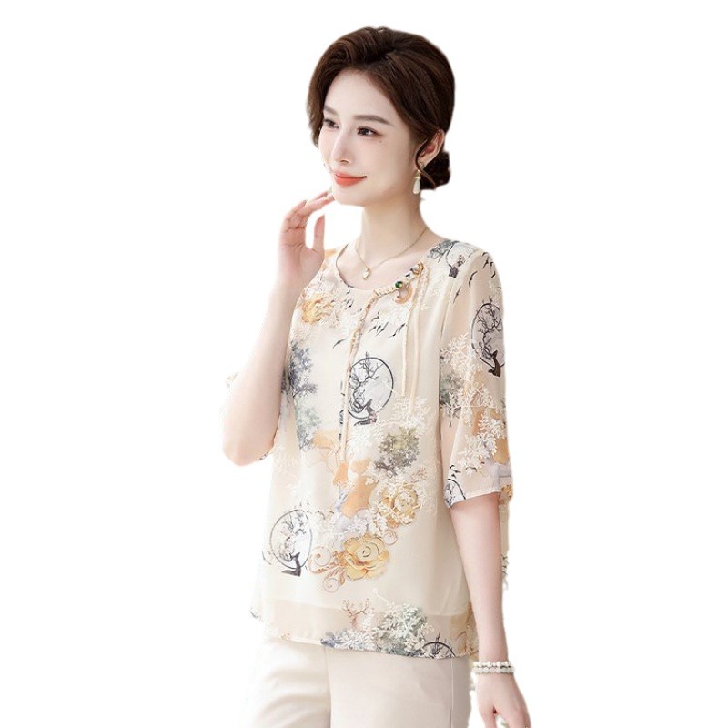 Новый весенний наряд для мам: шифоновая блузка со средними рукавами, модная футболка для женщин среднего и пожилого возраста, топ с вышивкой на весну и лето.
