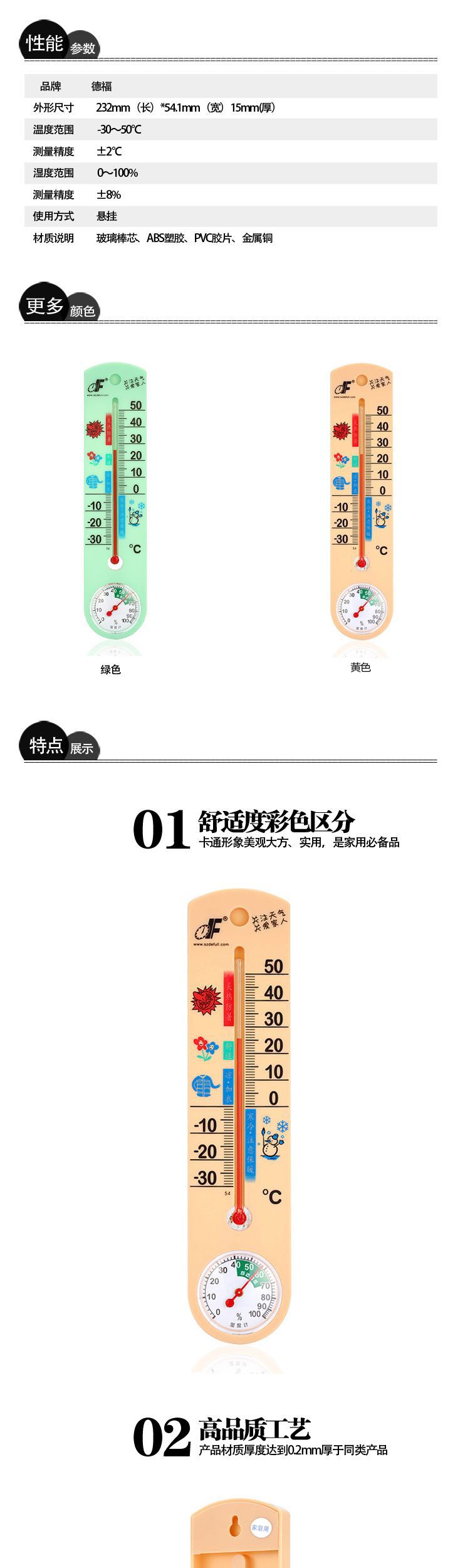 深圳市德福五金制品有限公司简介 深圳市德福五金制品有限公司是一家专业从事温湿度计产品的研发、生产、销售服务于一体的企业。主要生产双金属温度计、玻璃棒芯温度计、湿度计等产品。主要产品近五十种,二百余种规格型号,广泛应用于家居、办公场所、酒店、学校、计算机房、车箱、温室、畜牧养殖场等室内外环境及冰箱、烤炉、微波炉、干燥箱等设备的温、湿度测量。产品远销欧美、日本、港澳台、东南亚各国以及中国内地。 公司成立于二00四年,通过ISO9001:2015国际质量体系认证.位于广东省深圳市龙华新区观澜牛湖石二村艺高工业园内,拥有约2000平方米的标准厂房及配套的员工宿舍,4条独立的生产装配线,公司员工100多名,生产技术及管理人员20名,月生产能15万件,年产值1500万元以上。 | |