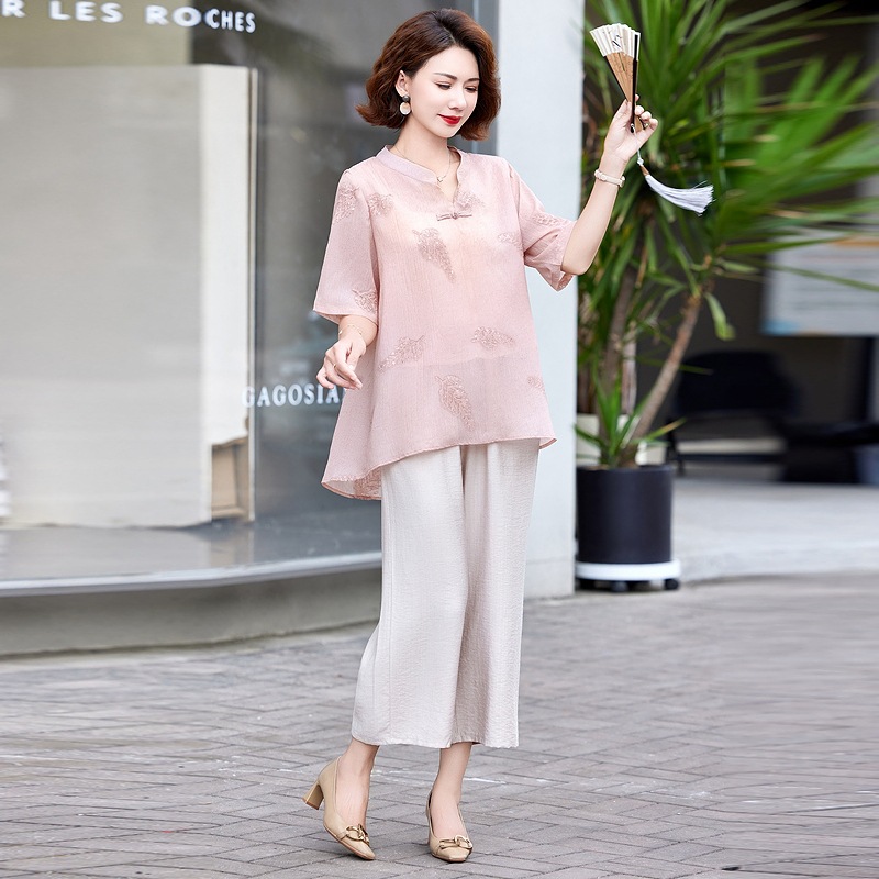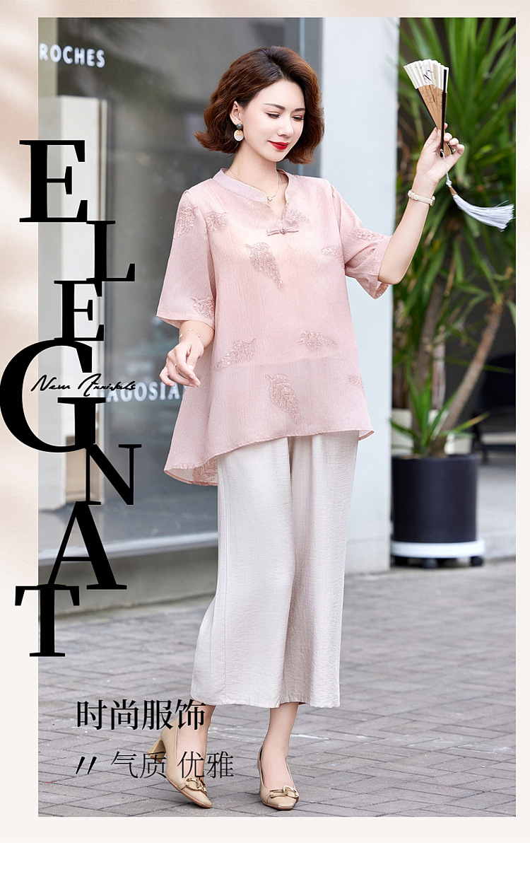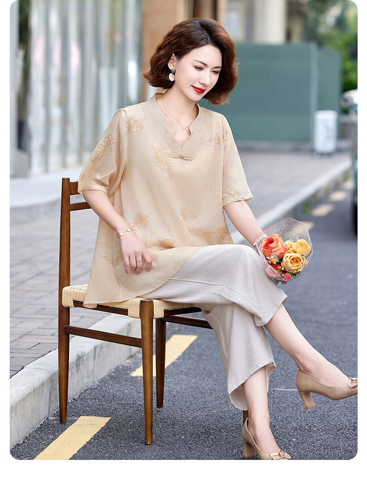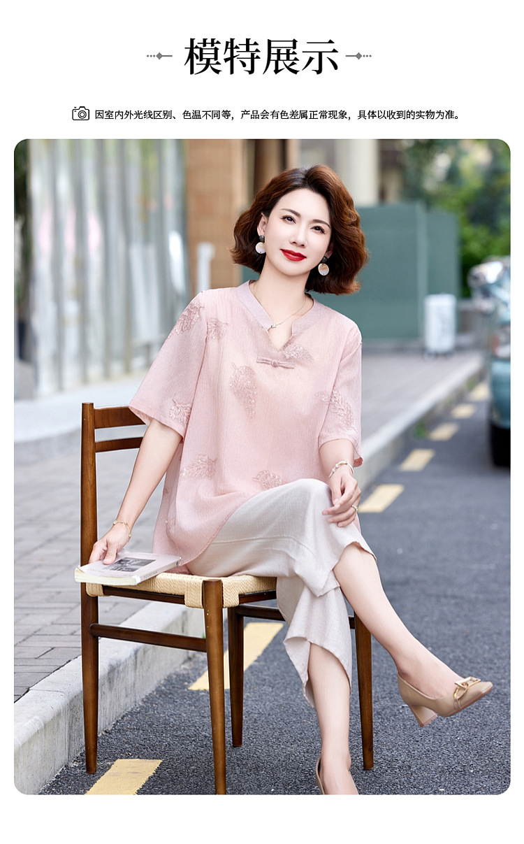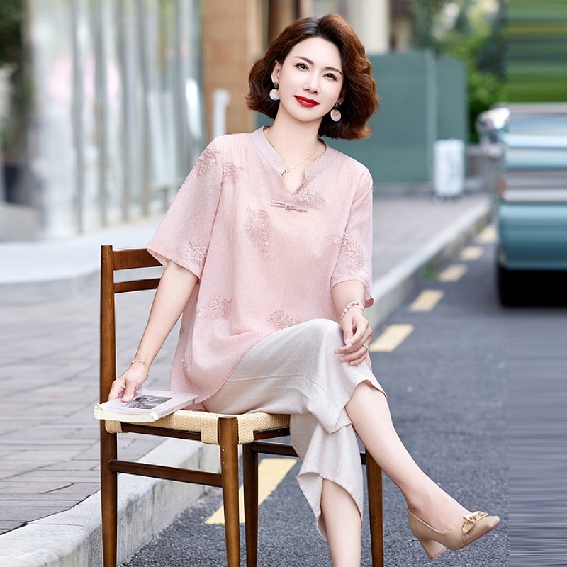Мама одеваются 2025 летний новый национальный стиль топ футболка рубашка среднего и пожилого возраста женская свободная пуловера маленькая рубашка