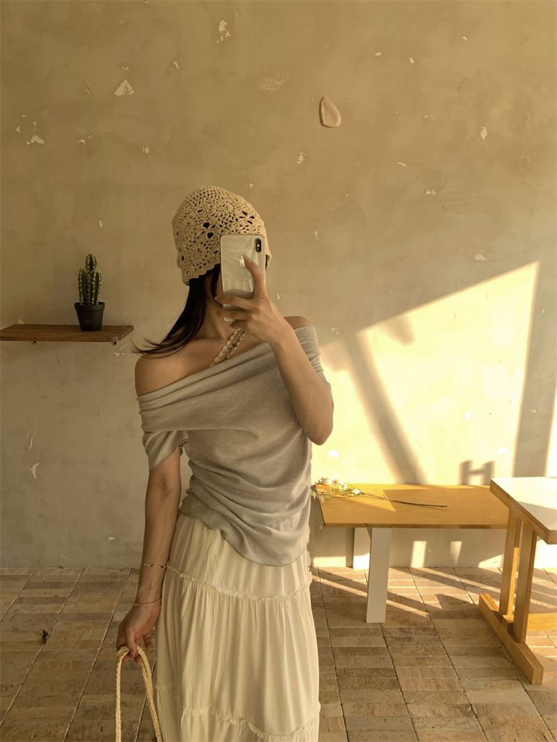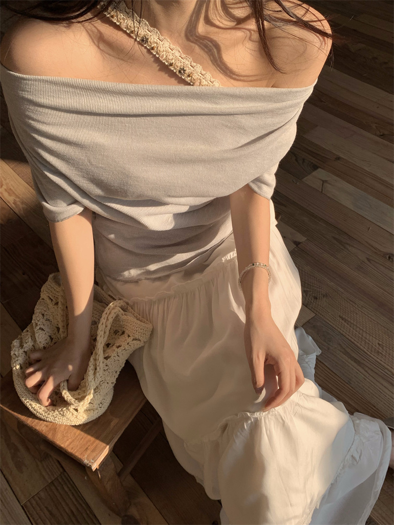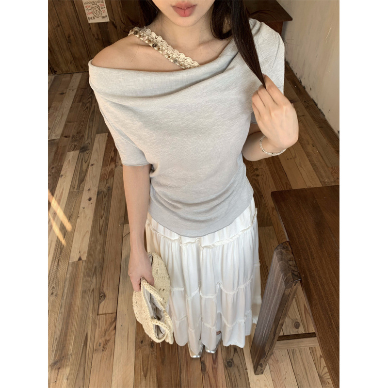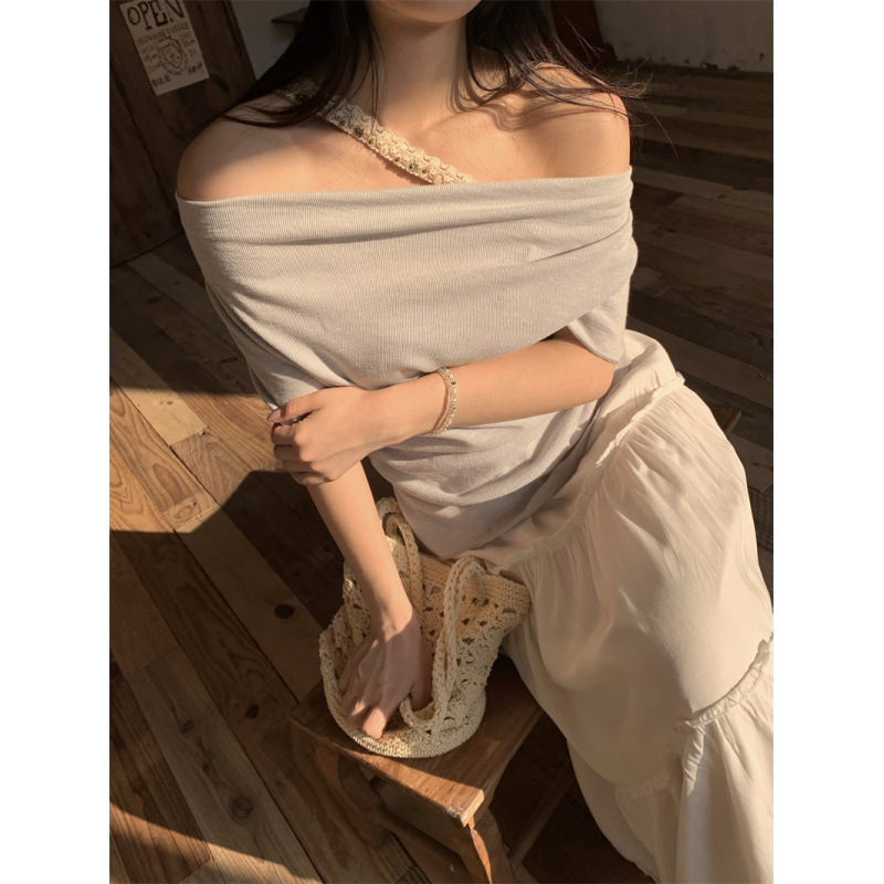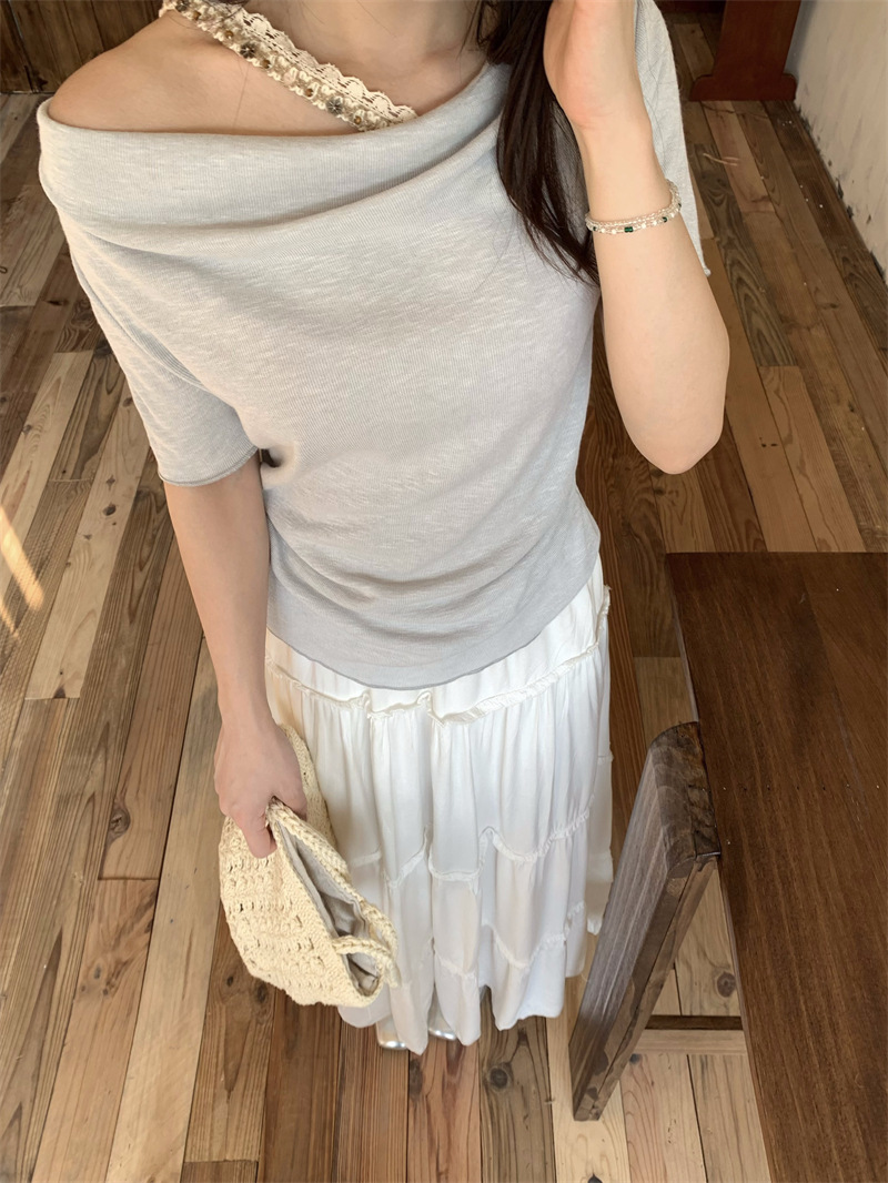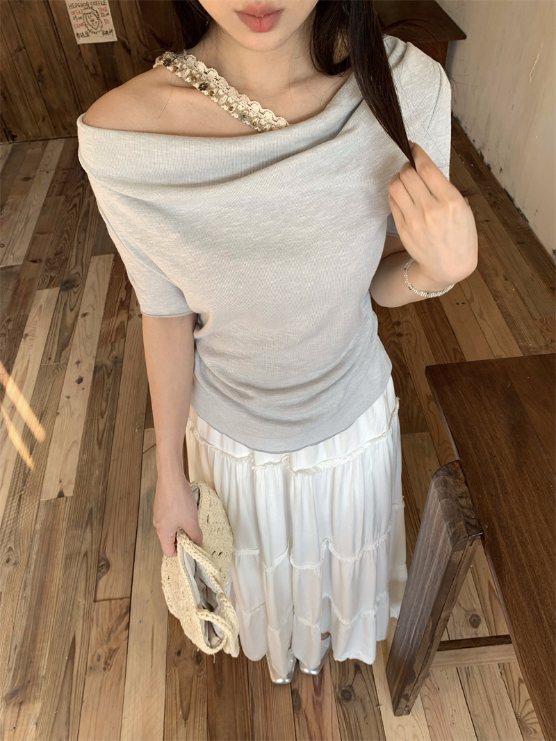Реальный снимок, реальная цена, поддельная футболка из двух частей с короткими рукавами и кружевом для женщин, летняя футболка для похудения, сексуальный топ на одно плечо