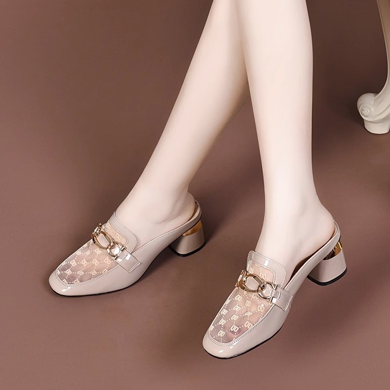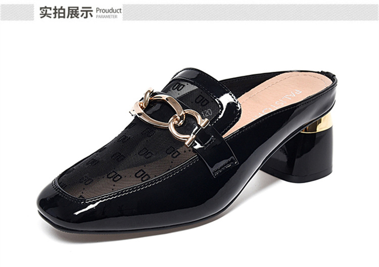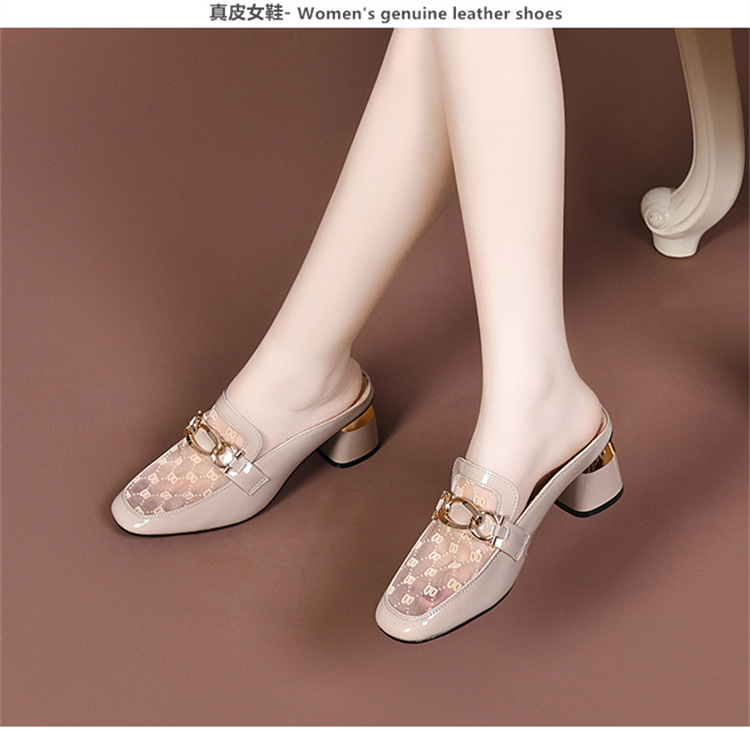 Баотоу сетчатая пряжа полукутанки женские летние 24 новые кожаные толстые каблуки ленивые лакированные лакированные сандалии с низким каблуком и полуподдонами обувь высотой 3CM