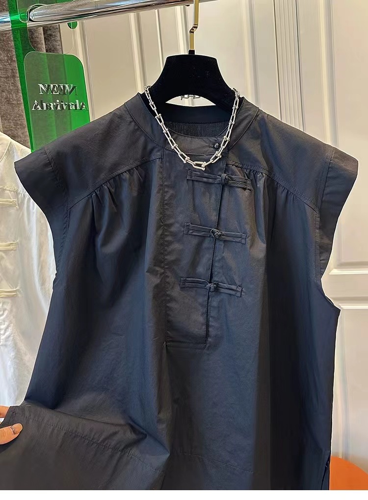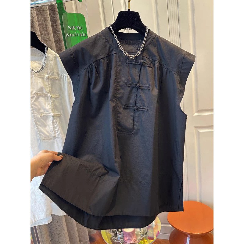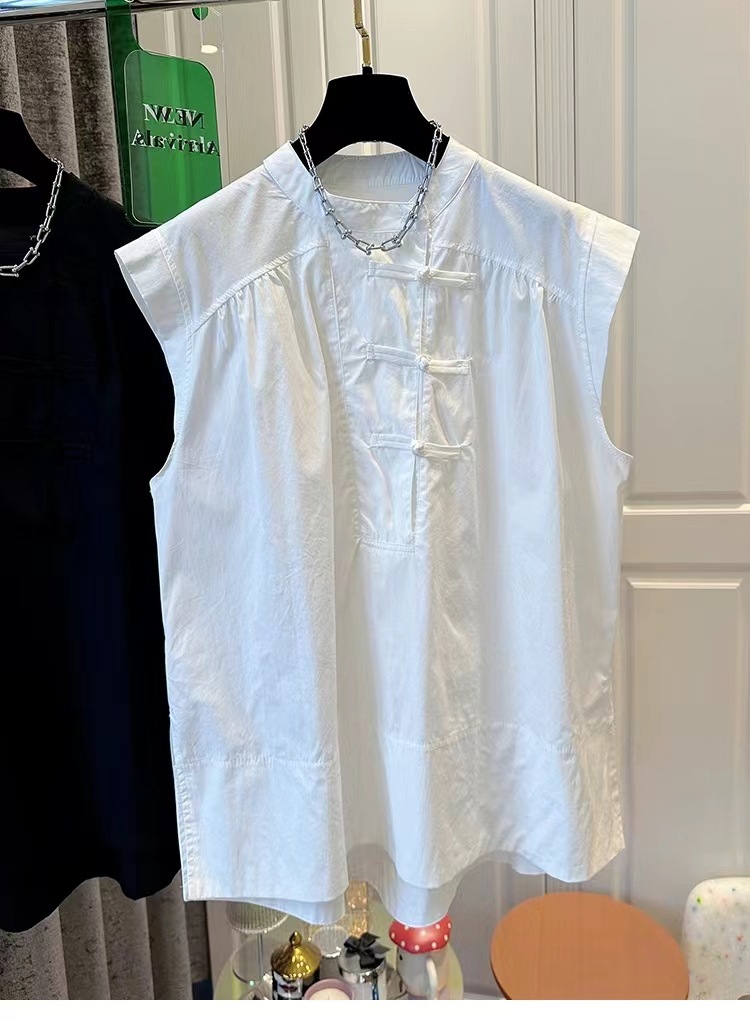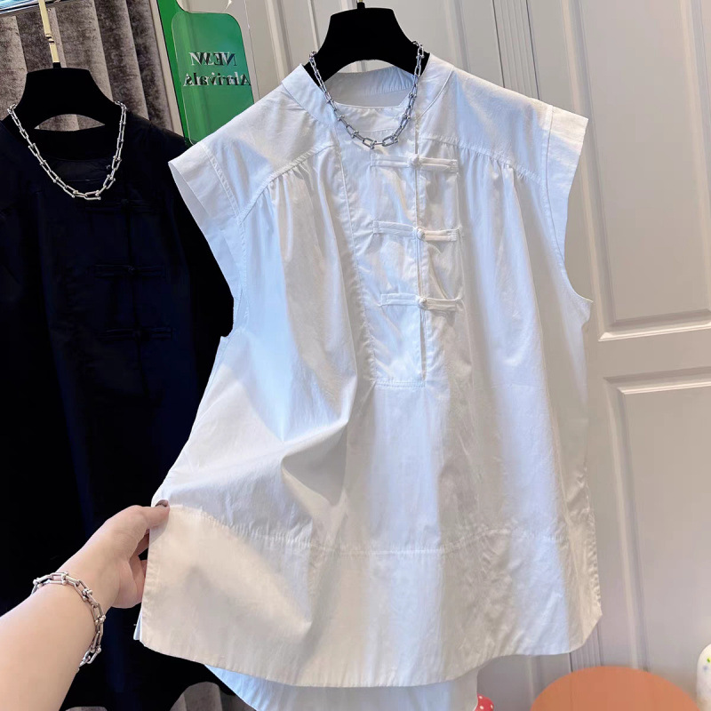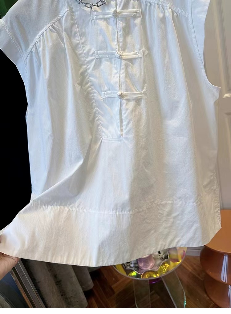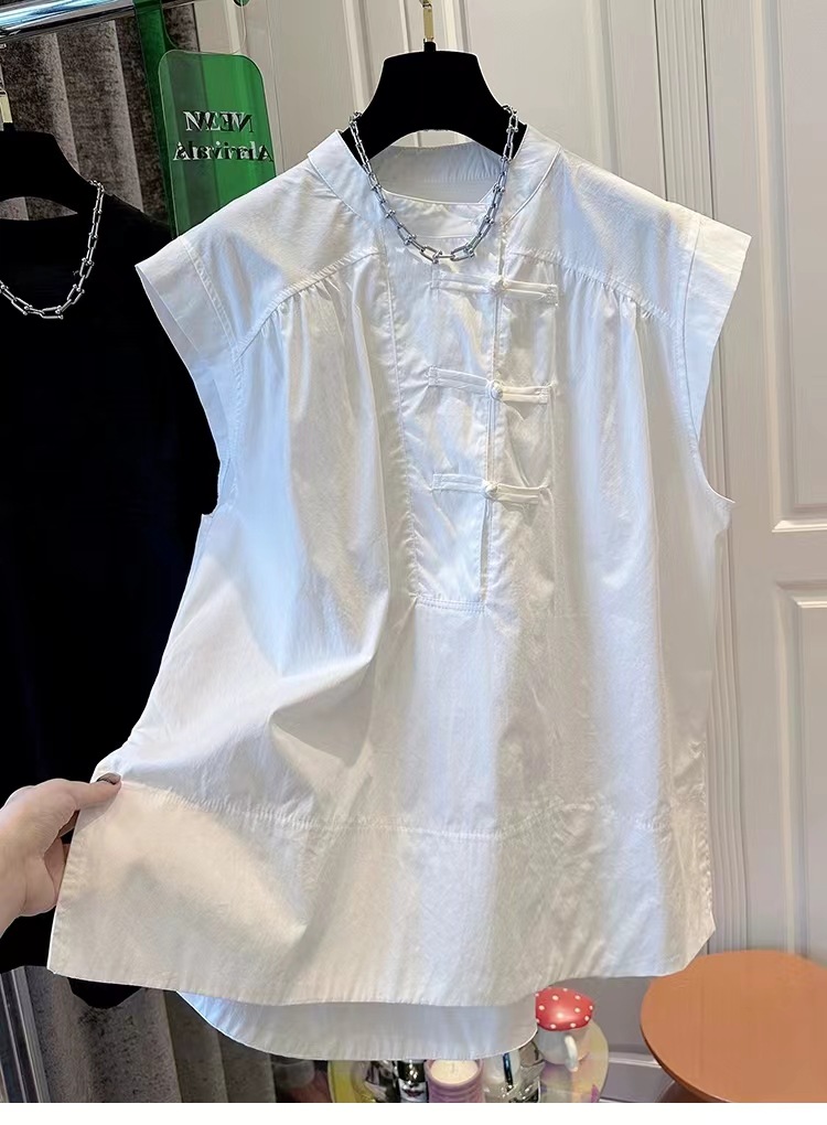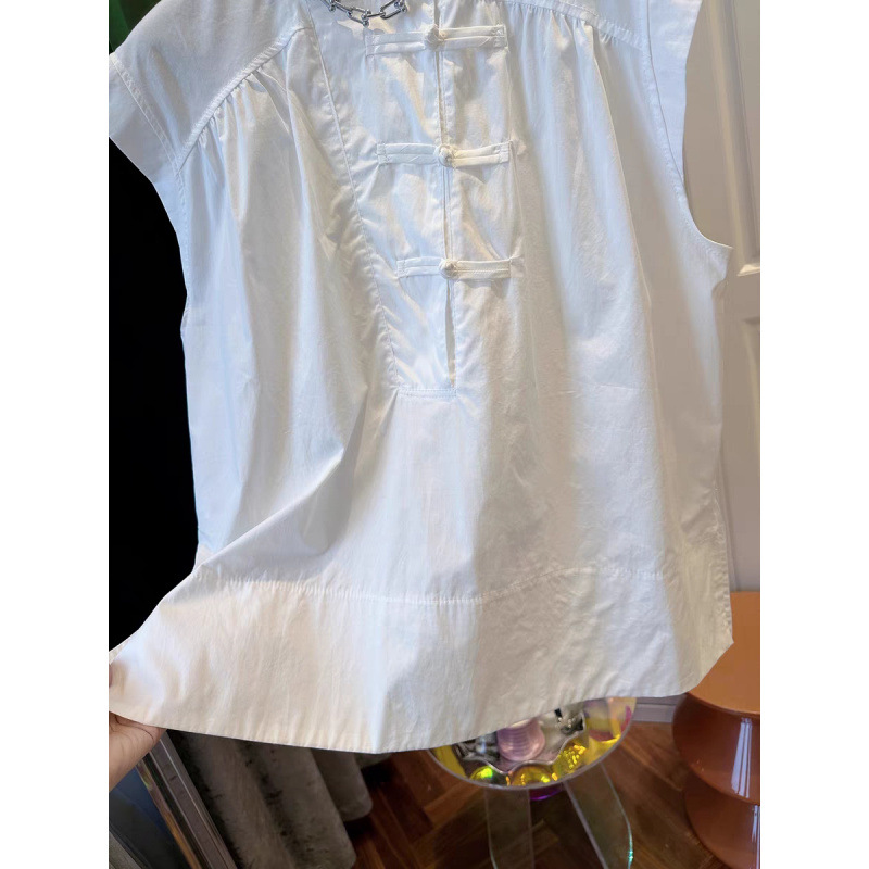 Новый китайский стиль национальный ветер пуговицы белый маленький летающий рукав рубашка женская рубашка свободная без рукавов ретро круглый воротник 2025 летний новый стиль