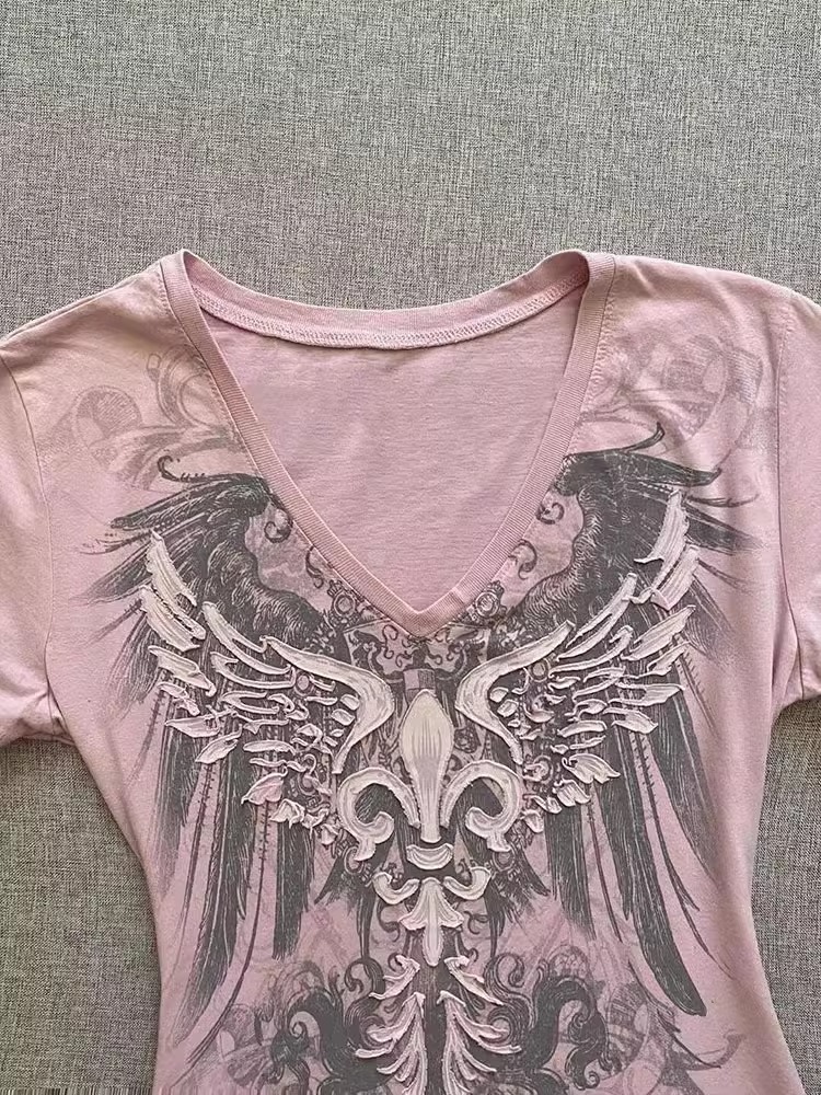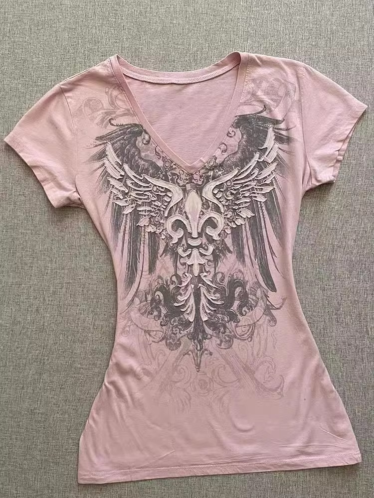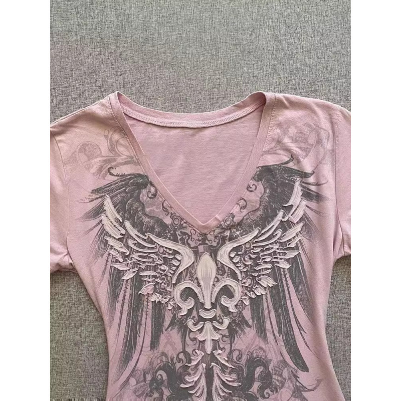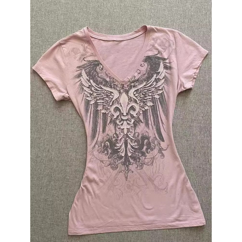 Американский ретро Vintage старинный розовый V-образный вырез с короткими рукавами футболка женская весна и лето тонкая талия топ 2025