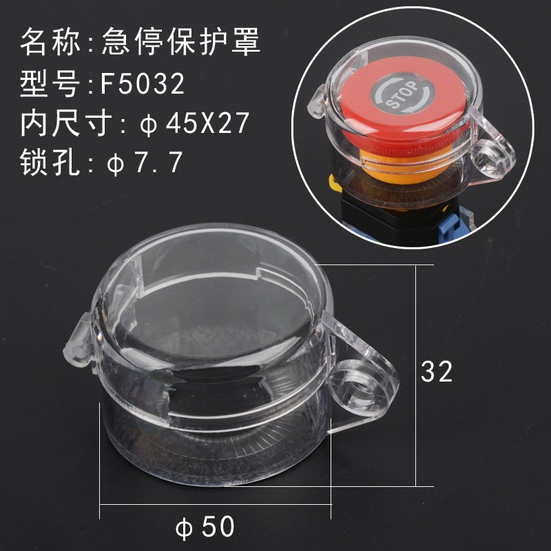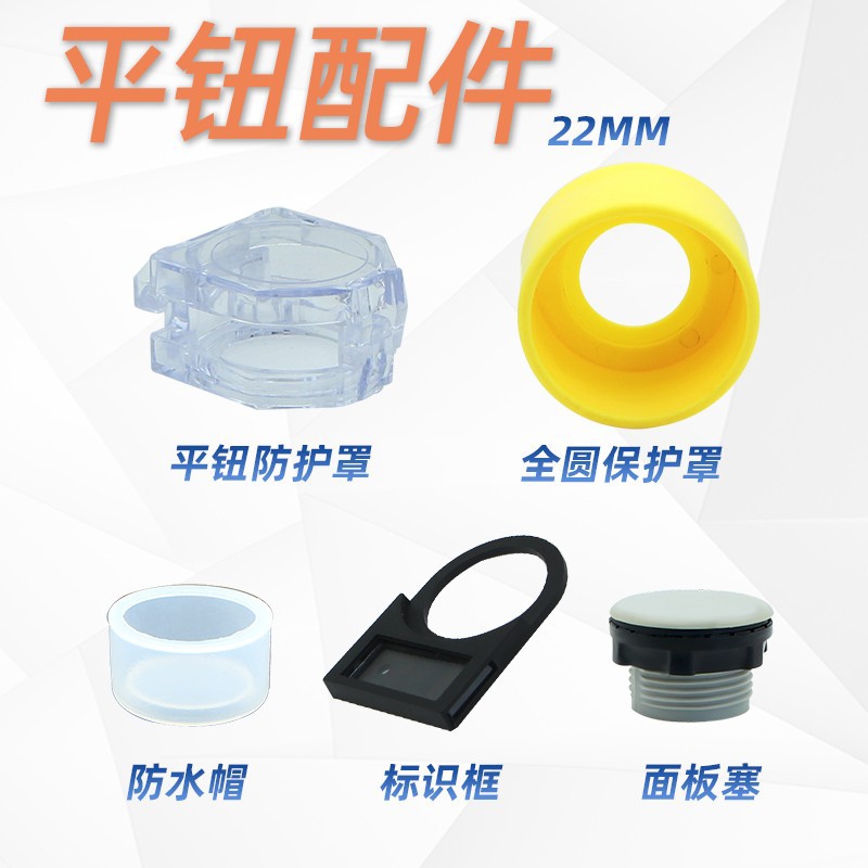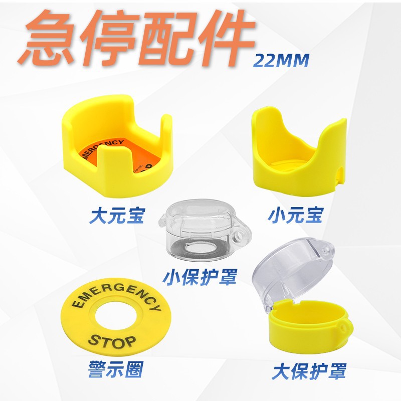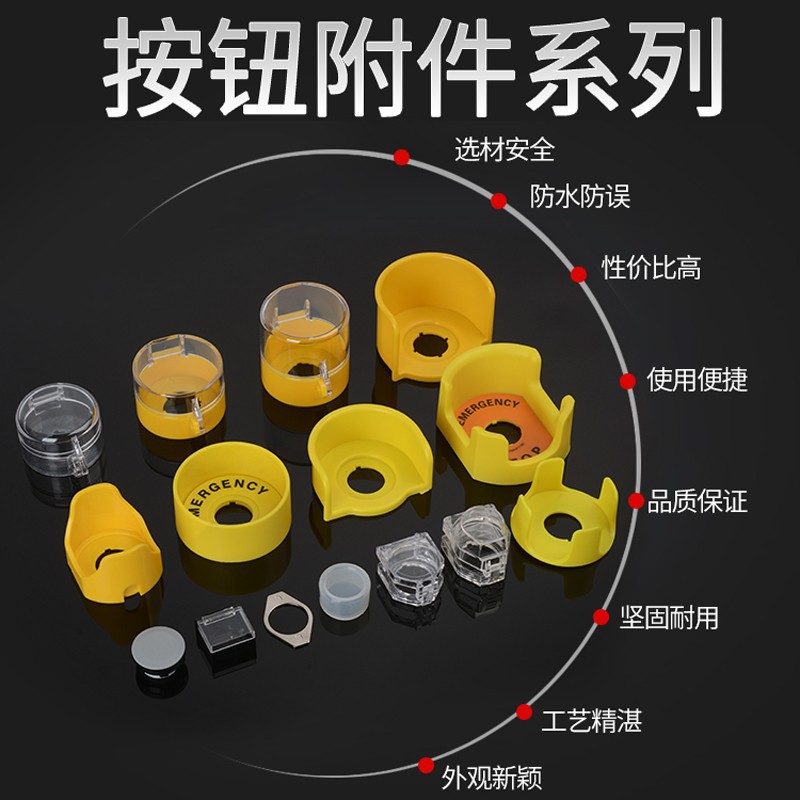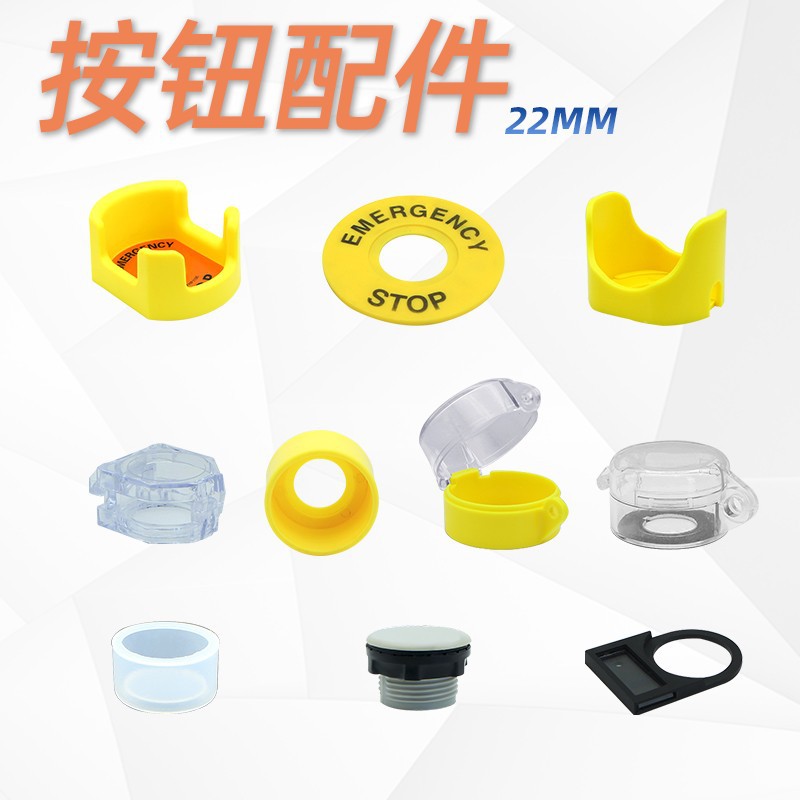 Защитная крышка аварийной остановки (большая) (рекомендуется); Прозрачная защитная крышка аварийной остановки (маленькая) (аварийную остановку нелегко повернуть); Защитное сиденье по всему кругу; Круг предупреждения об аварийной остановке 22 мм; Круг предупреждения об аварийной остановке 16 мм; Срочно остановите большой юаньбао; Срочно остановите небольшой слиток; Прозрачный защитный чехол с плоской кнопкой; Вилка для панели 22 мм (продается упаковками по 100 шт.); Водонепроницаемый колпачок диаметром 22 мм (продается упаковками по 100 штук).; Маркировочная коробка 22 мм (продается от 100 штук в упаковке)