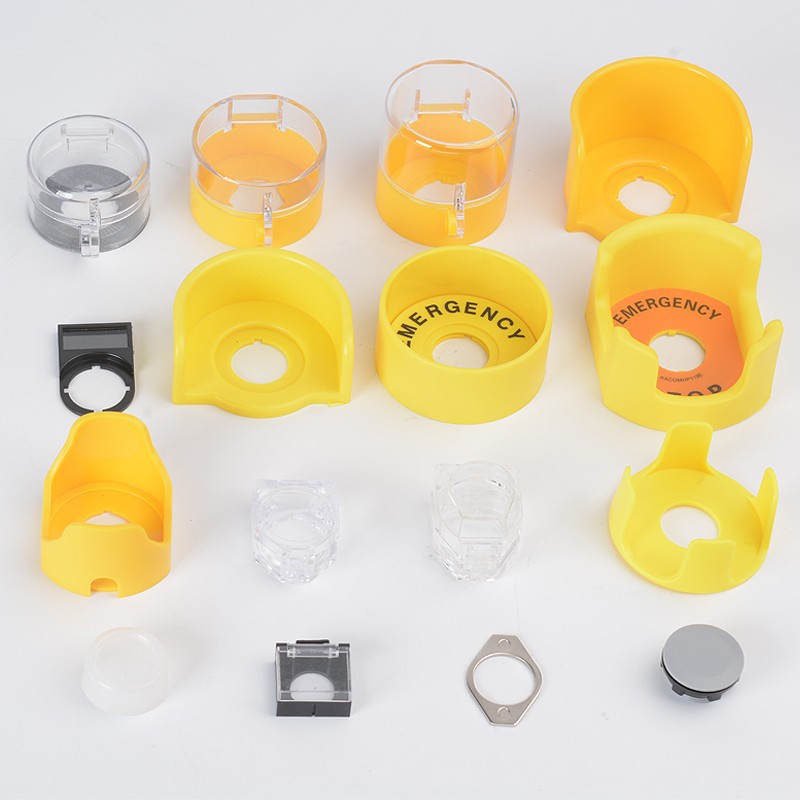 Кнопка аварийной остановки, защитная крышка, предупреждающее кольцо, прозрачный щит, большой и маленький слиток, плоская кнопка, маркировочная рамка, водонепроницаемая панель с крышкой