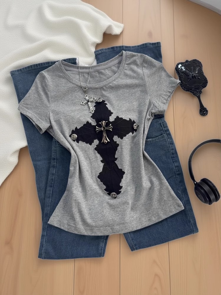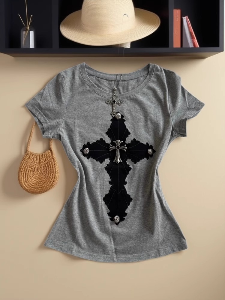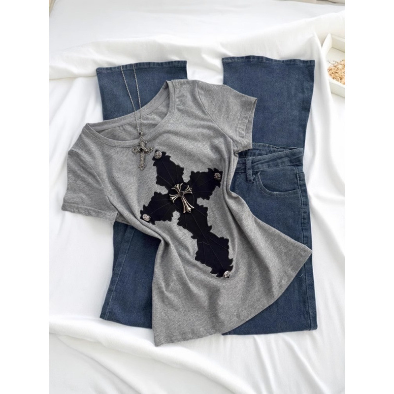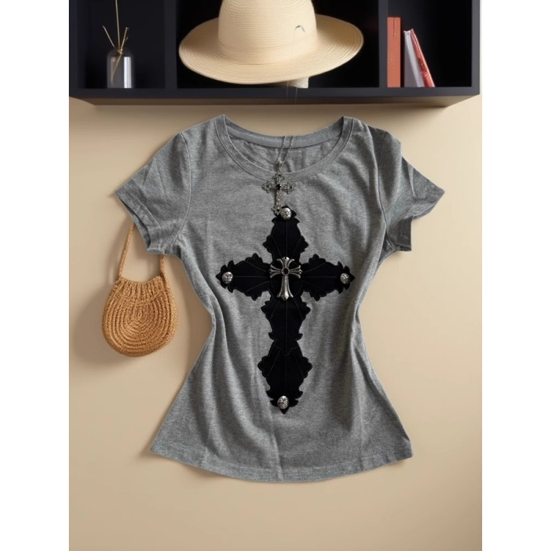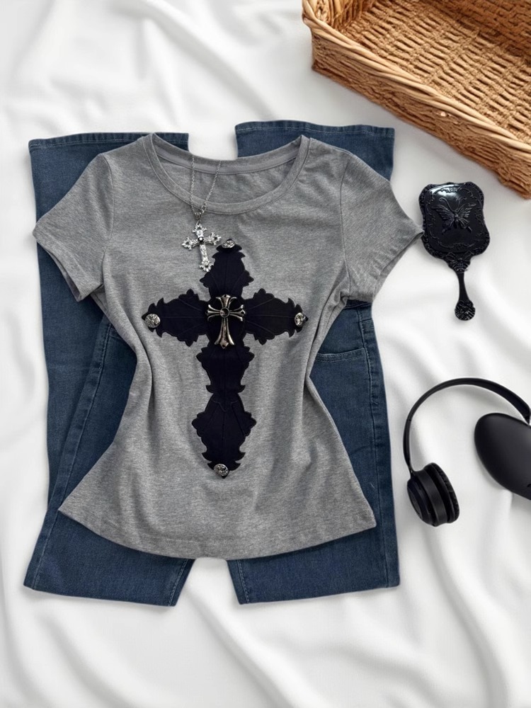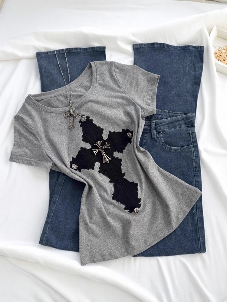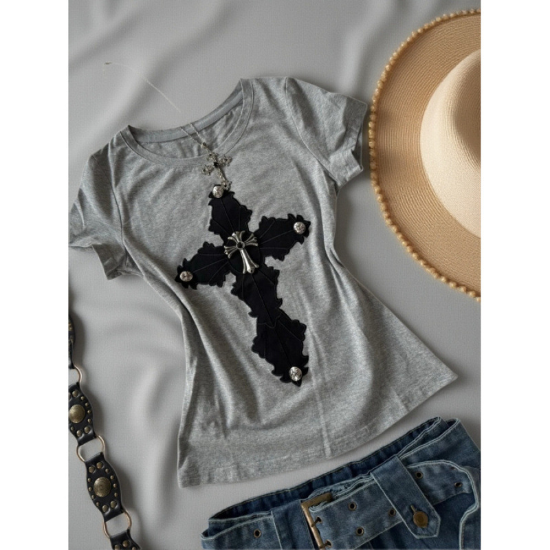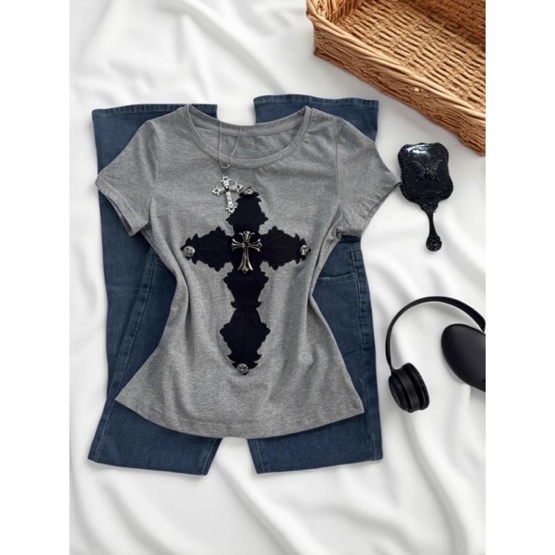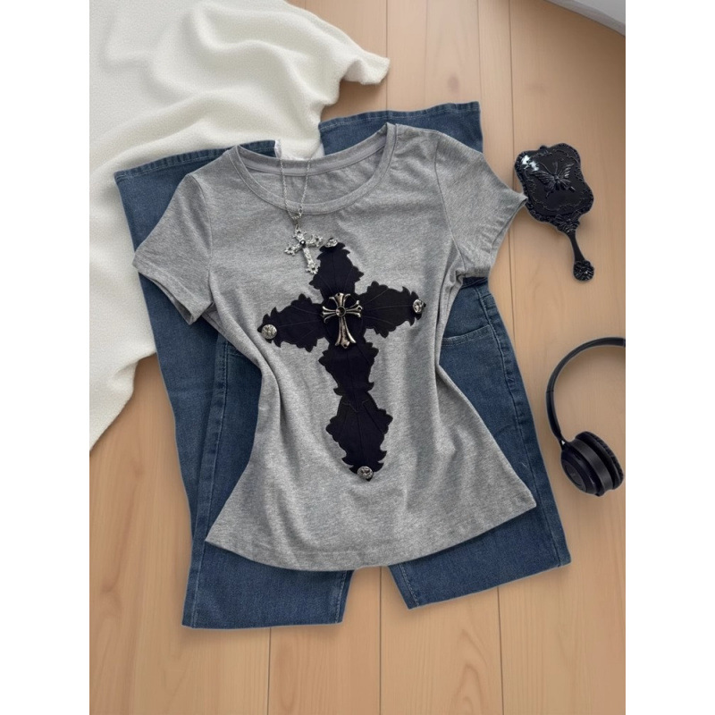 Американская винтажная серая футболка с принтом креста женская летняя стройная тонкая сладкая классная дикая рубашка с короткими рукавами ins прилив