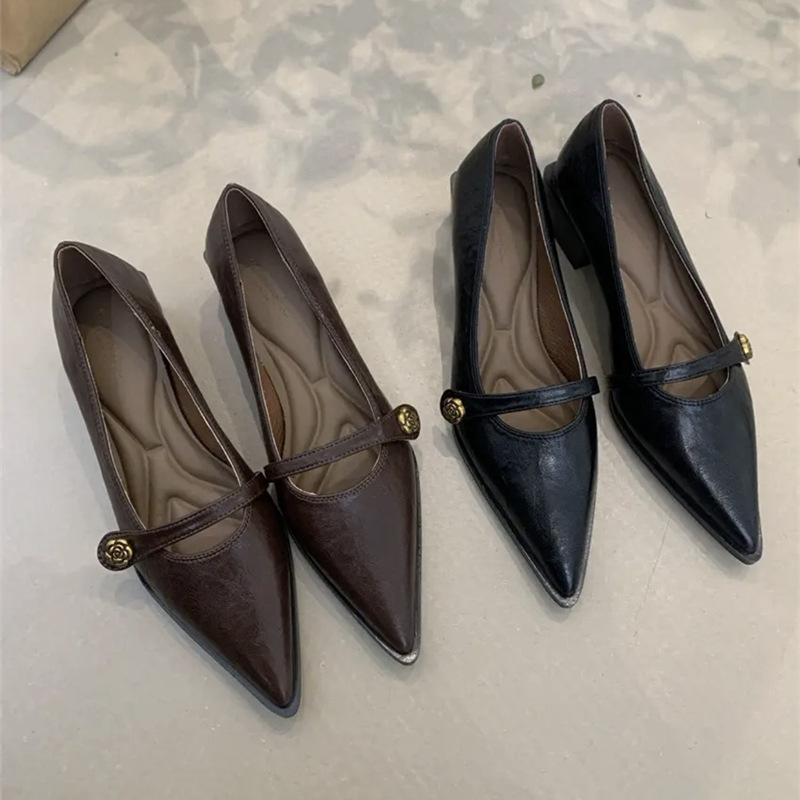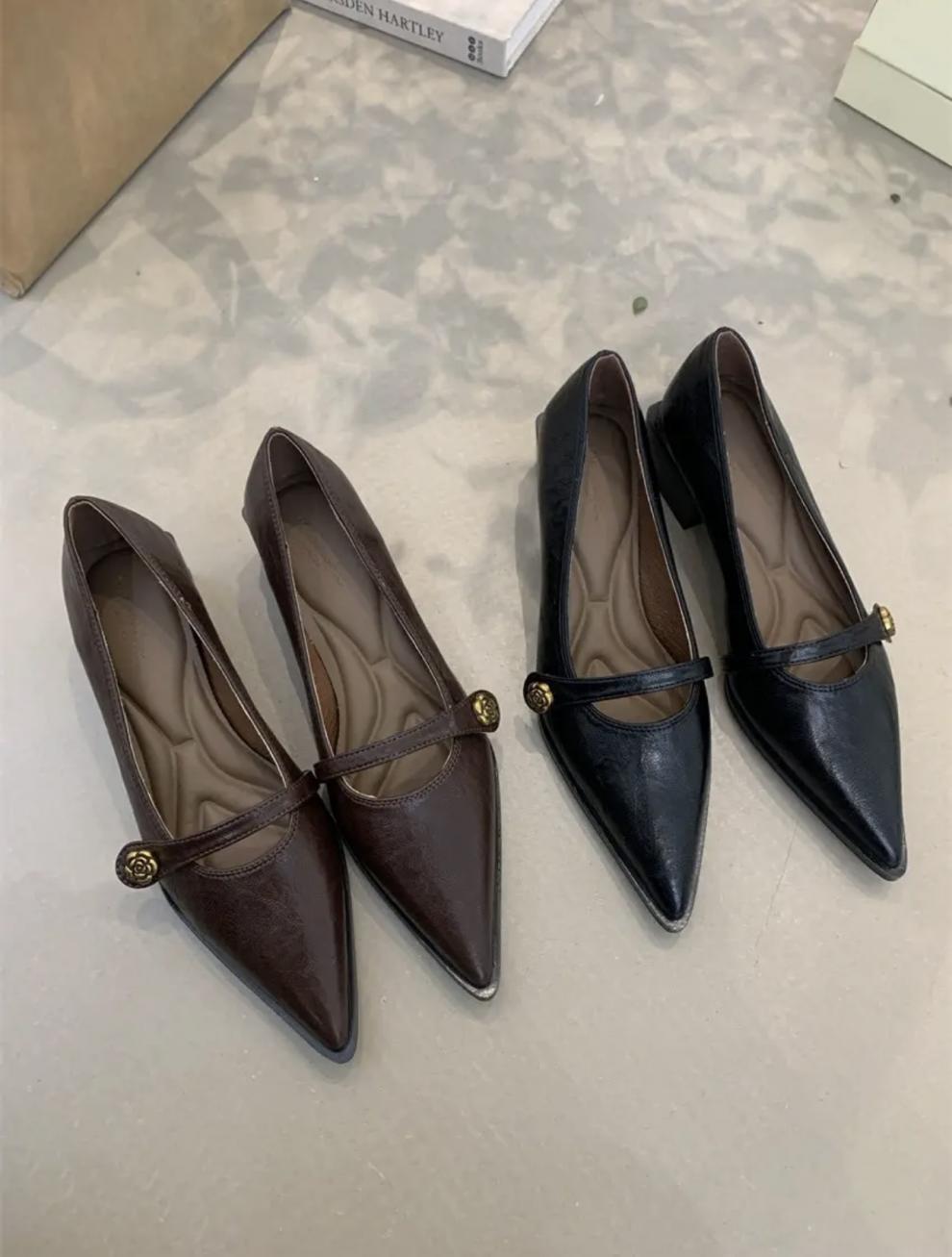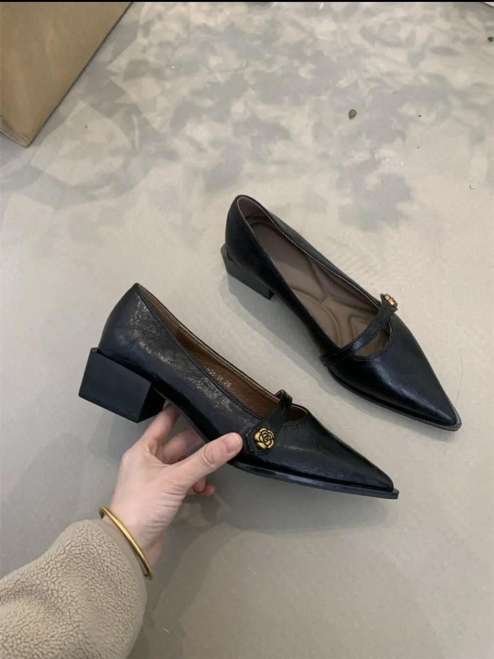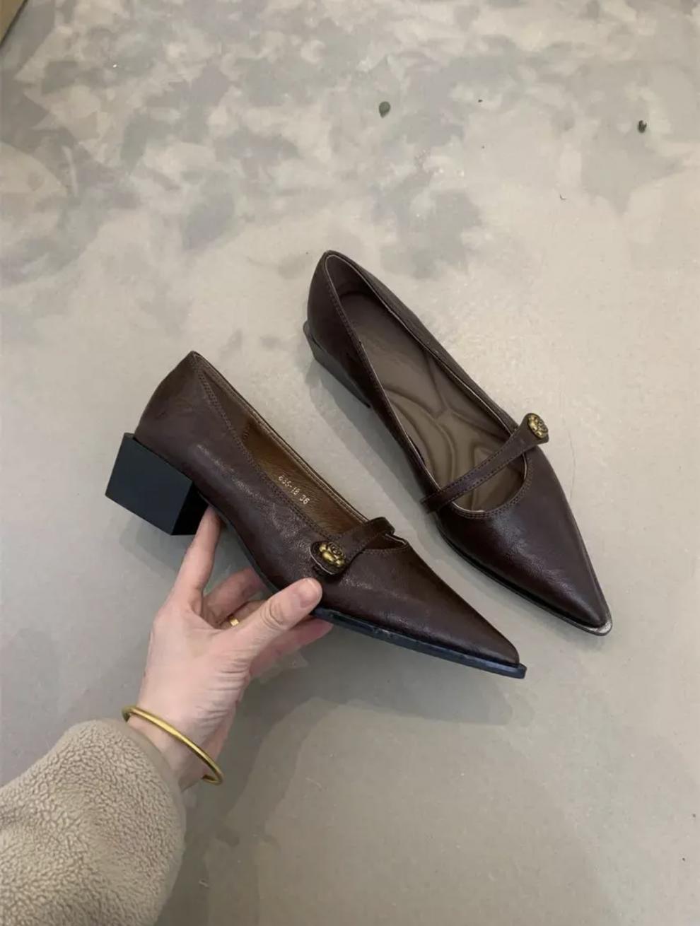 Женские туфли-лодочки на среднем каблуке с заостренным носком, французский стиль, весна-осень, на толстом каблуке с пряжкой.