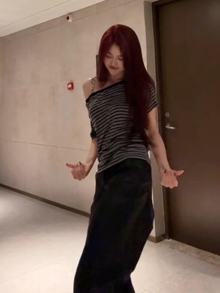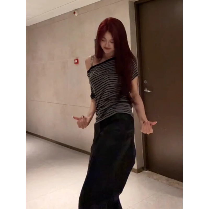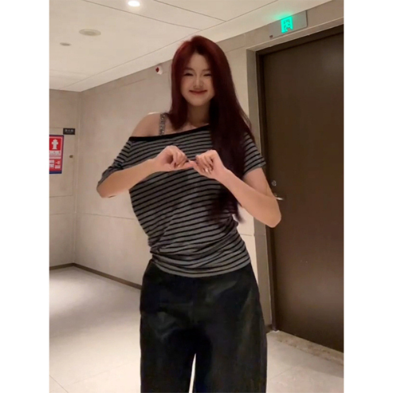Американская винтажная полосатая футболка с открытыми плечами и короткими рукавами женская 2025 летняя новая тонкая тонкая горячая девушка топ