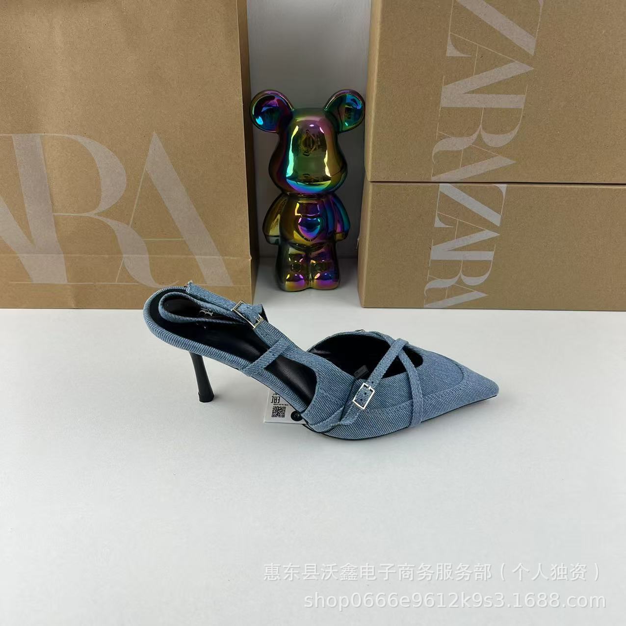 ZAR春季新品 女鞋 蓝色牛仔高跟露跟穆勒鞋英伦交叉带凉鞋女单鞋