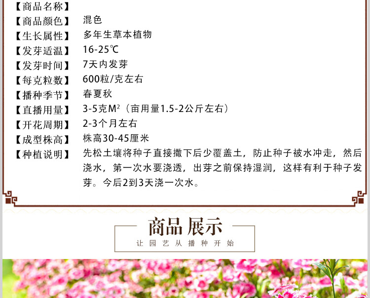 Красочный Диантус 1000 капсул + удобрение; Дианthus 1000 капсул + удобрение; Американский Диантус 1000 капсул + удобрение; Диантус Первое Поцелуе 1000 капсул + удобрение; Цветной Диантус 50г + Удобрение; Цикламен китайский 50г + удобрение; Американский Диантус 50г + удобрение; Диантус Первое Поцелуй 50г + Удобрение; Полкилограмма разноцветных гвоздиков; Полкилограмма вечнозеленого гвоздика; Половина фунта американского гвоздика; Настурция полкилограмма первый поцелуй; Половина фунта смешанных семян гвоздики; Красочный Диантус 0.5kg; Цикламен китайский 0.5kg; Американский Диантус 0.5kg; Диантус 0.5kg Первое поцелуй; Смешанные семена диантуса 0.5kg; Цинния смешанного цвета 1000 капсул + удобрение; Morning Glory смешанный цвет 500 капсул + удобрение; Трава Фендайланцзы 500 капсул + удобрение; 100 капсул декоративного подсолнечника + удобрение; Подсолнечник смешанный цвет 20 000 капсул + удобрение; Cosmos Mixed Color 1000 капсул + удобрение