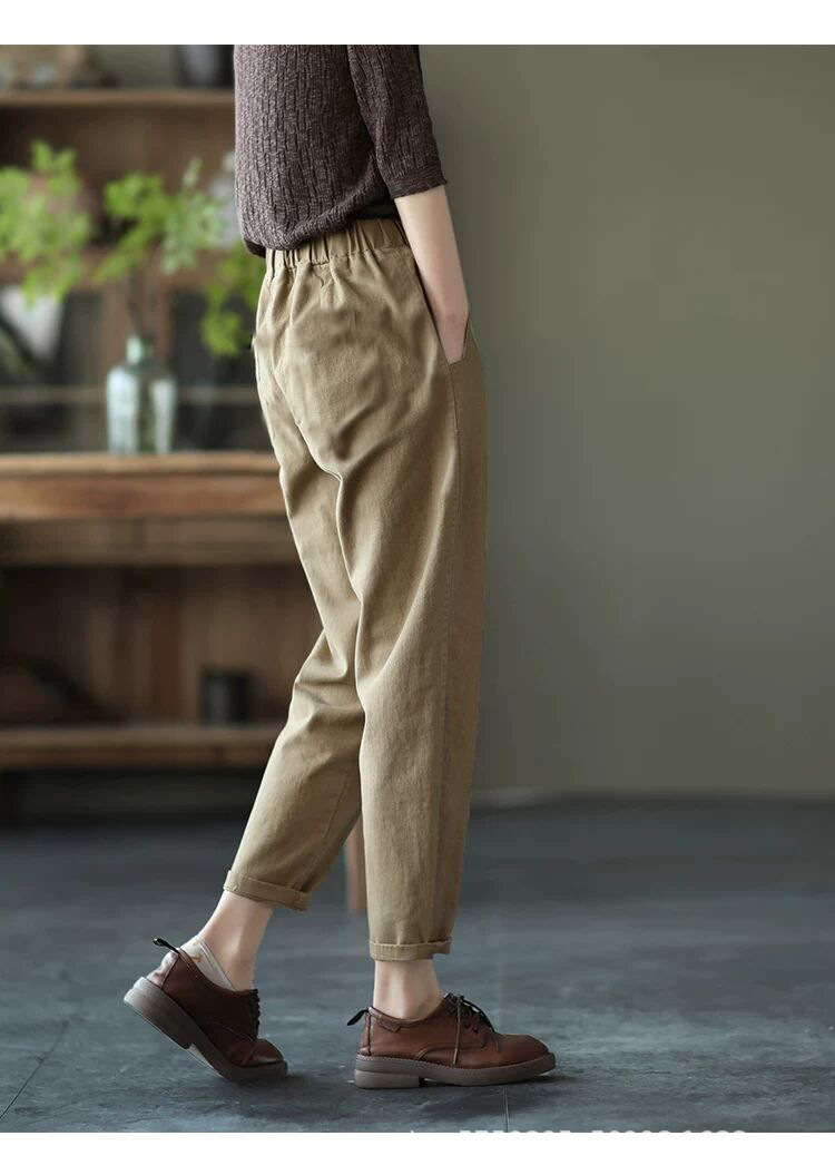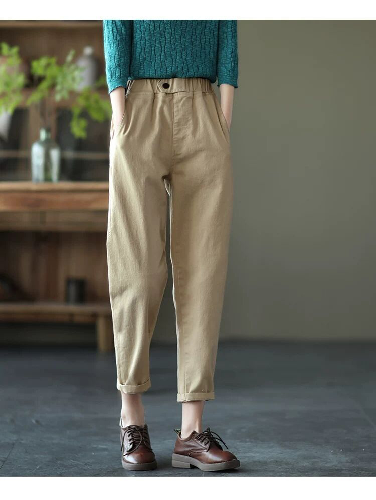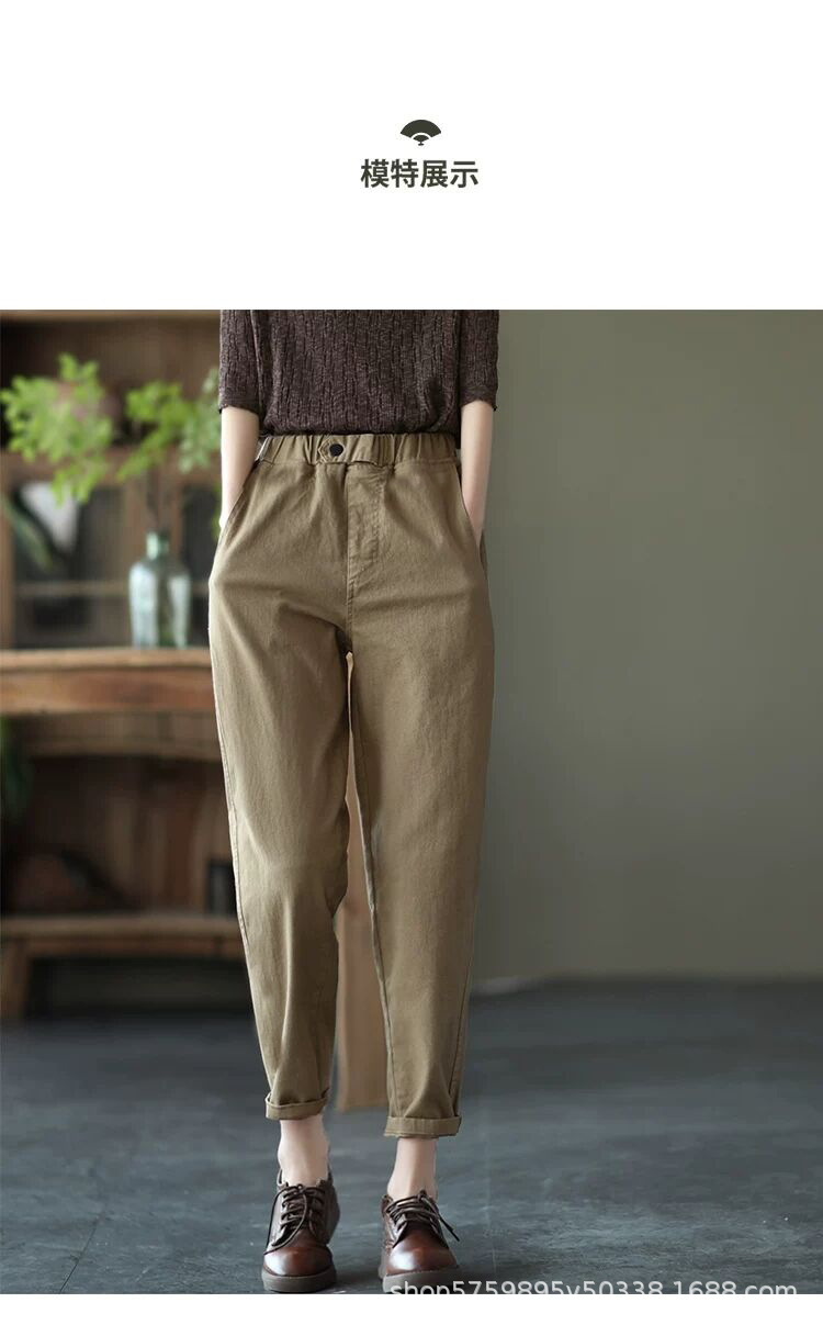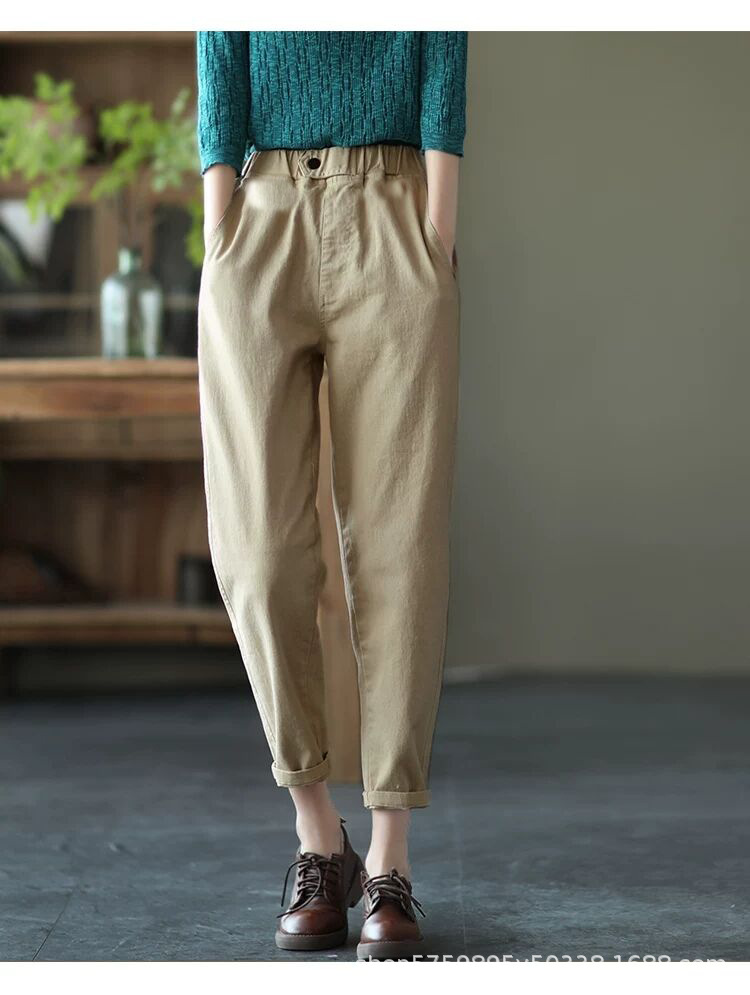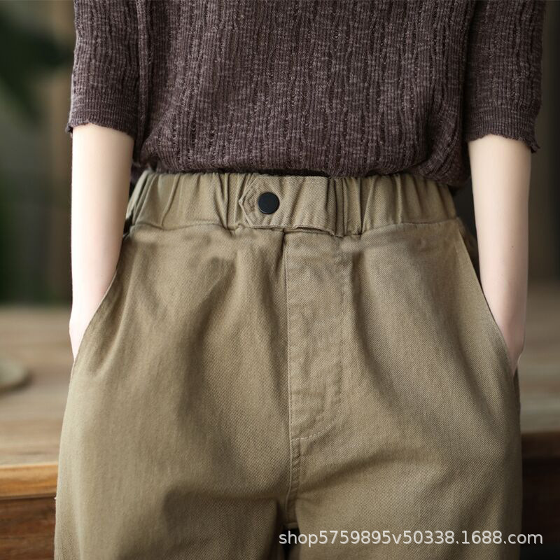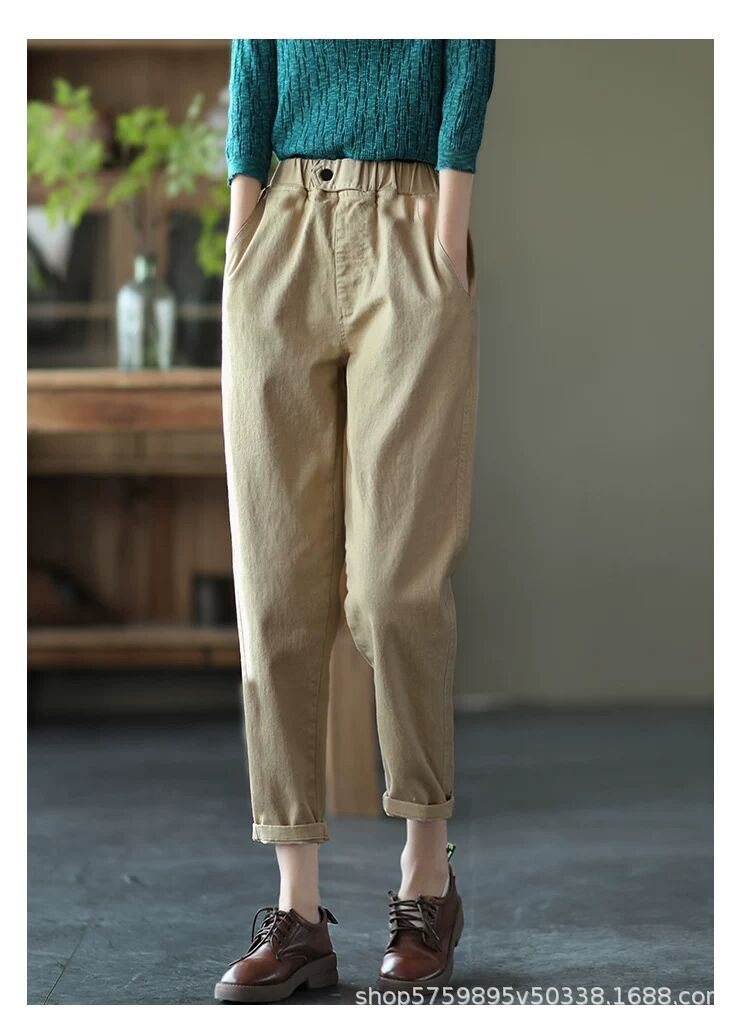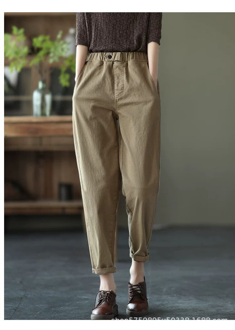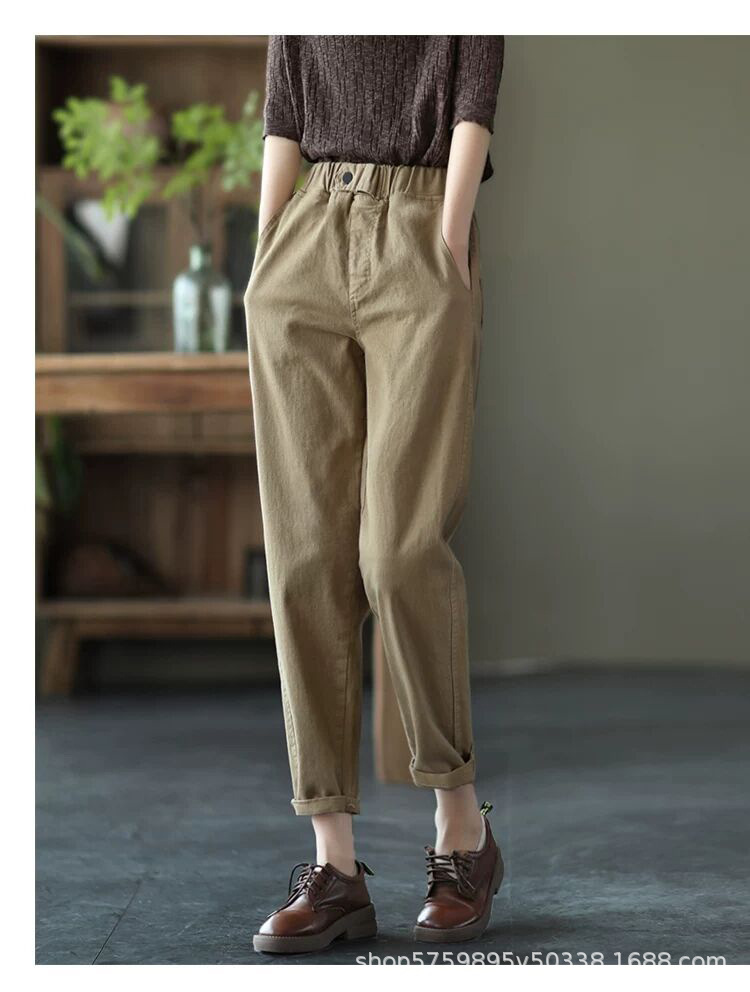 Весенне-осенние новые хлопковые повседневные брюки в стиле ретро для женщин, тонкие универсальные шаровары с эластичной резинкой на талии, укороченные брюки из чистого хлопка, длинные брюки.