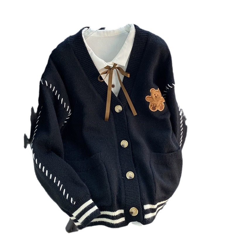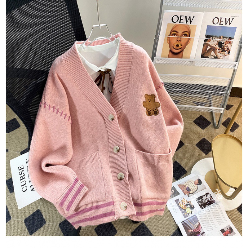 Корейский стиль, свитер с медведем, кардиган, женская куртка, осень 2025, новый стиль, веревка, ленивый стиль, брюки с карманами, вязаный верхний топ