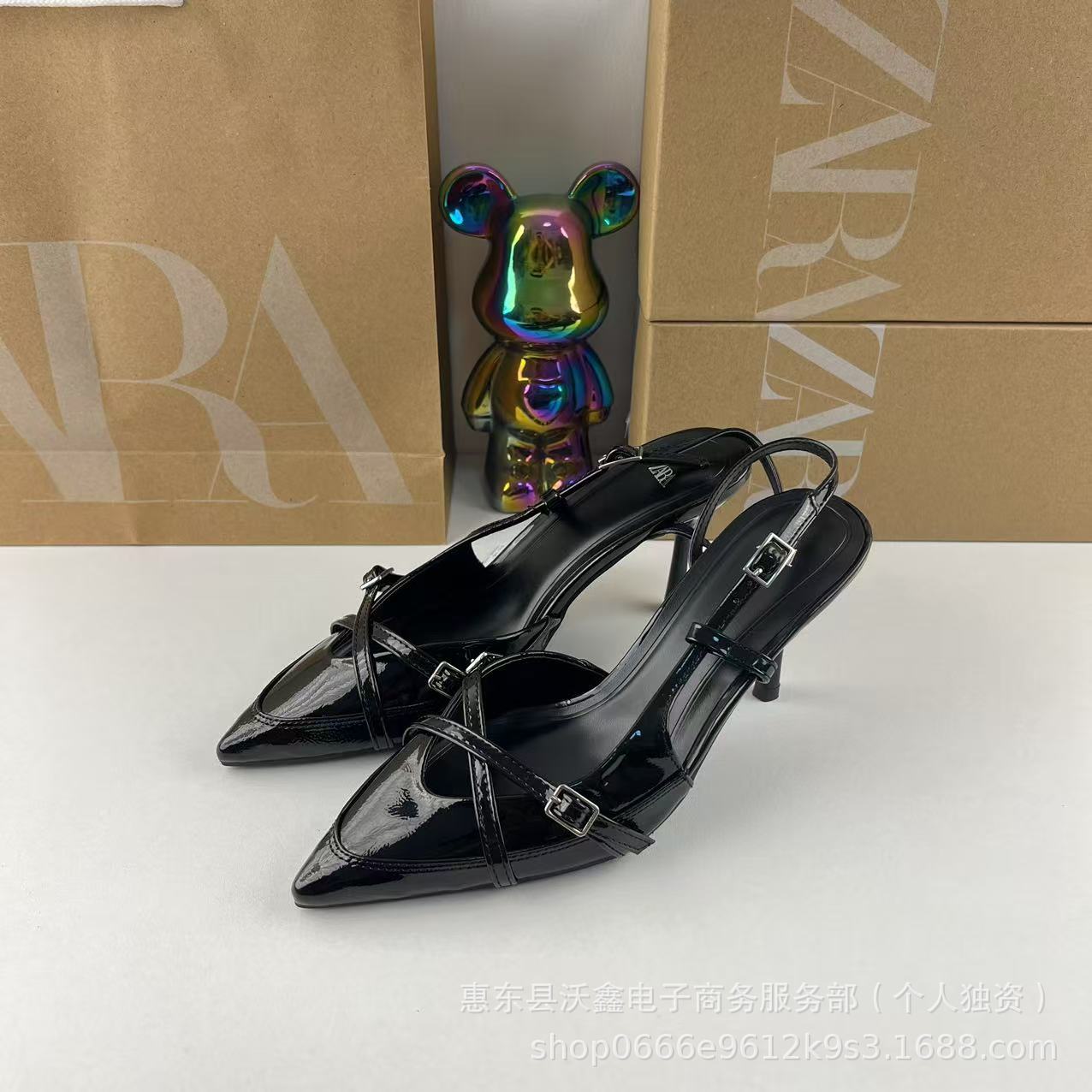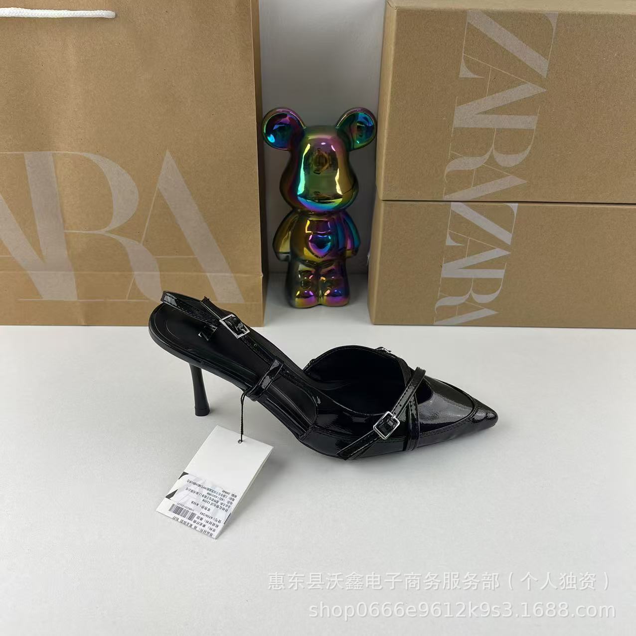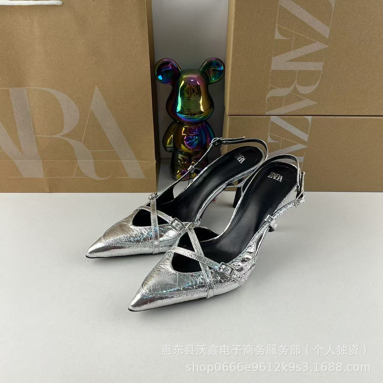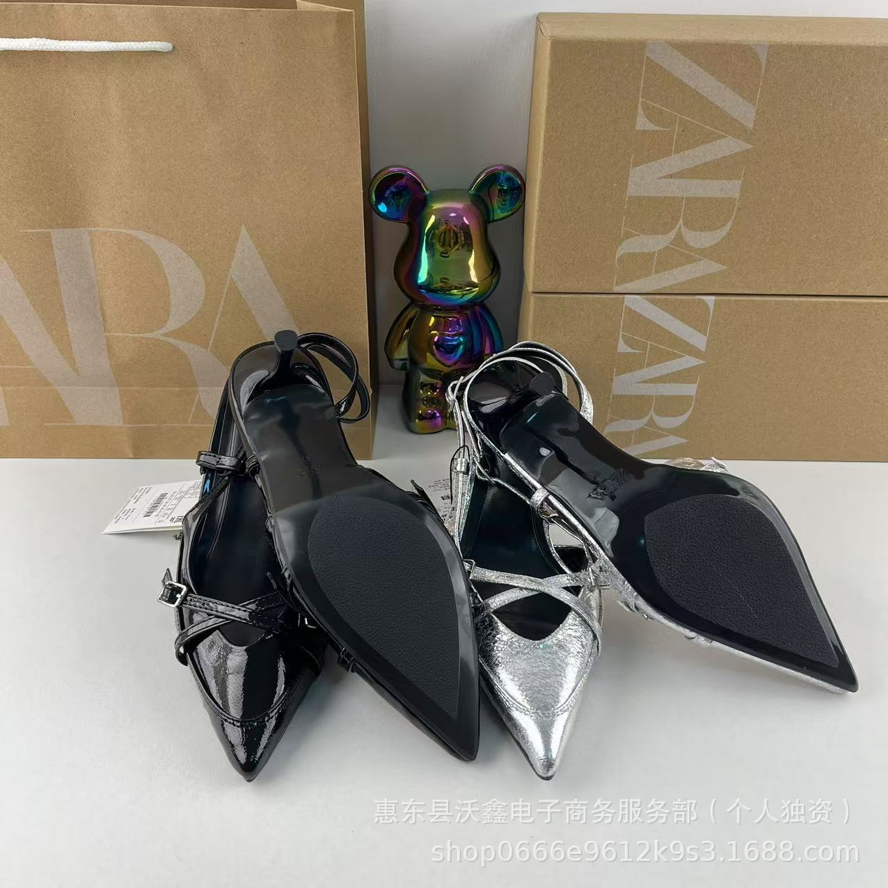 ZAR春季新品 女鞋 黑色银色高跟露跟穆勒鞋英伦交叉带凉鞋女单鞋