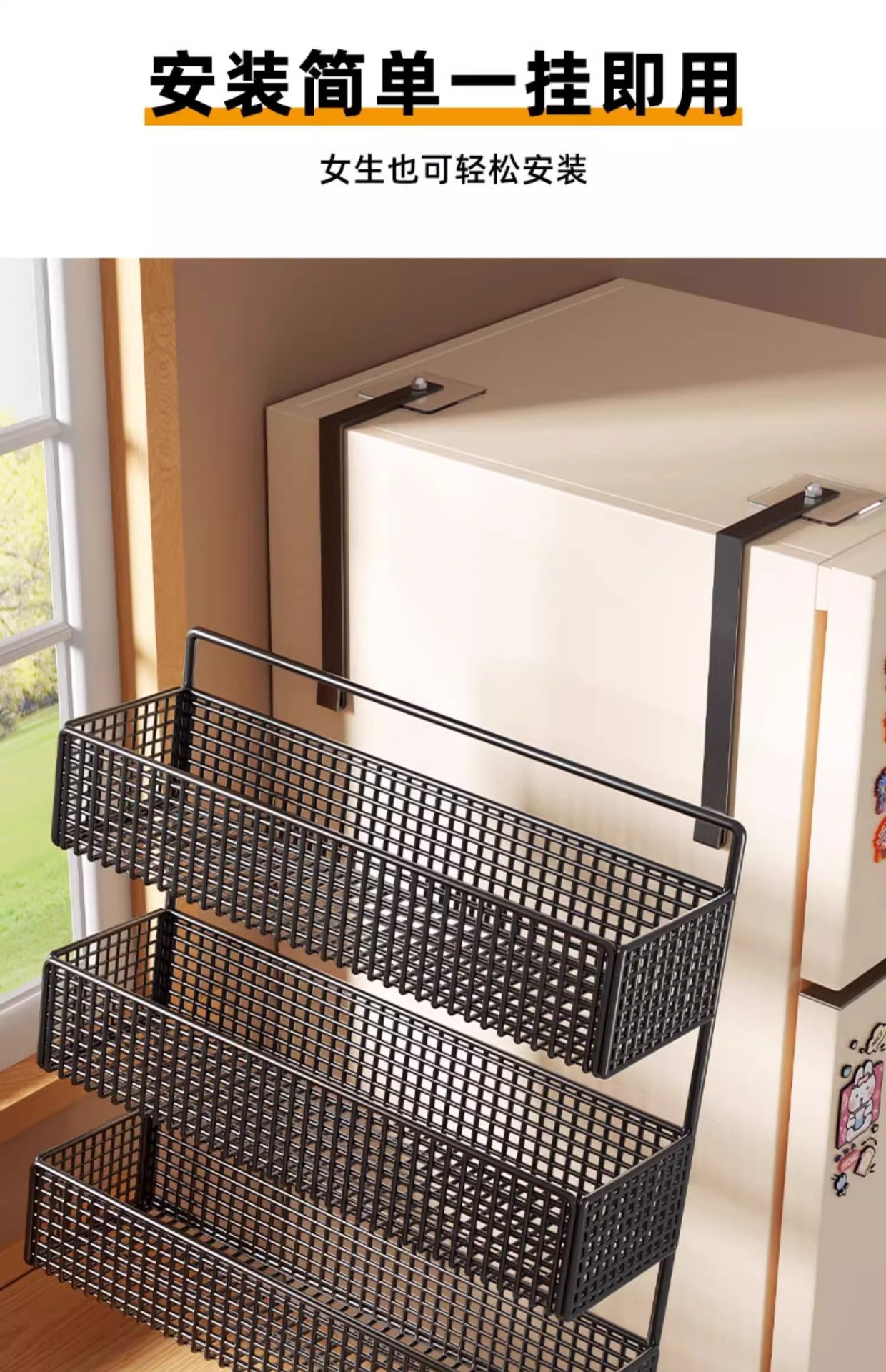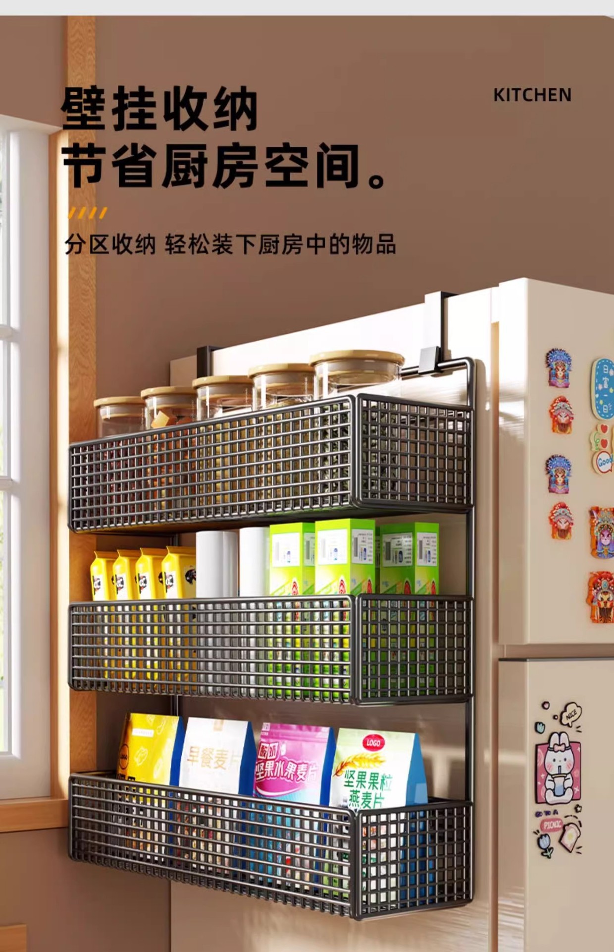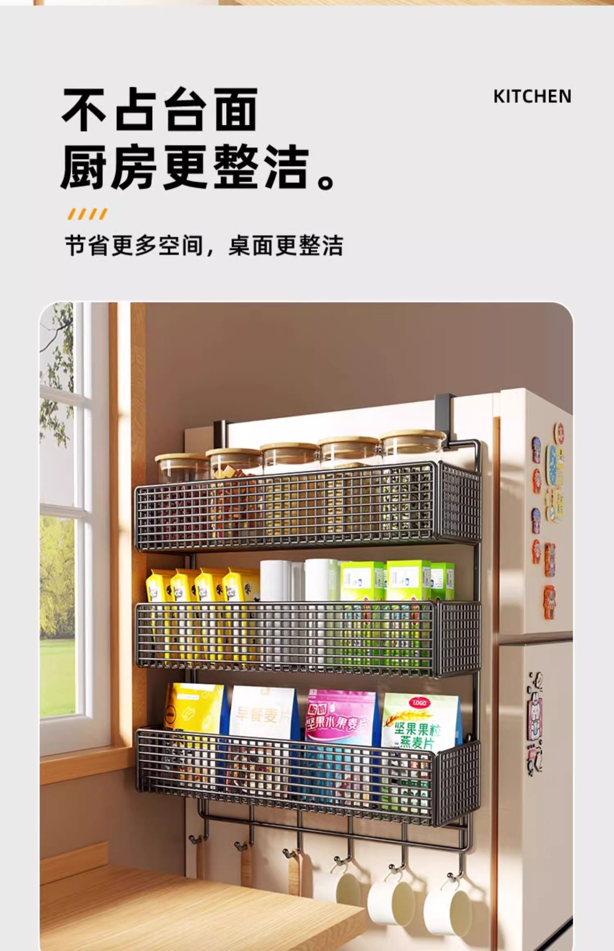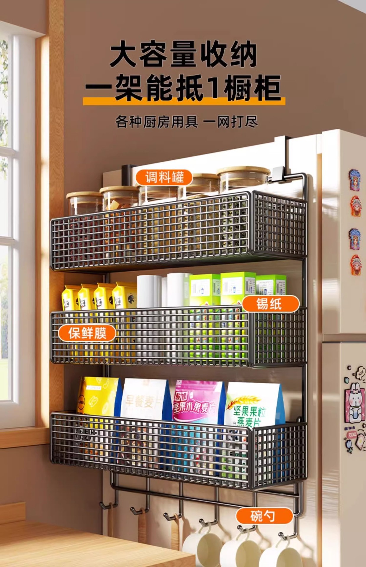 Боковая полка для холодильника, кухонные принадлежности, многослойная вешалка для хранения, пластиковая пленка, размещение бутылок для приправ без сверления