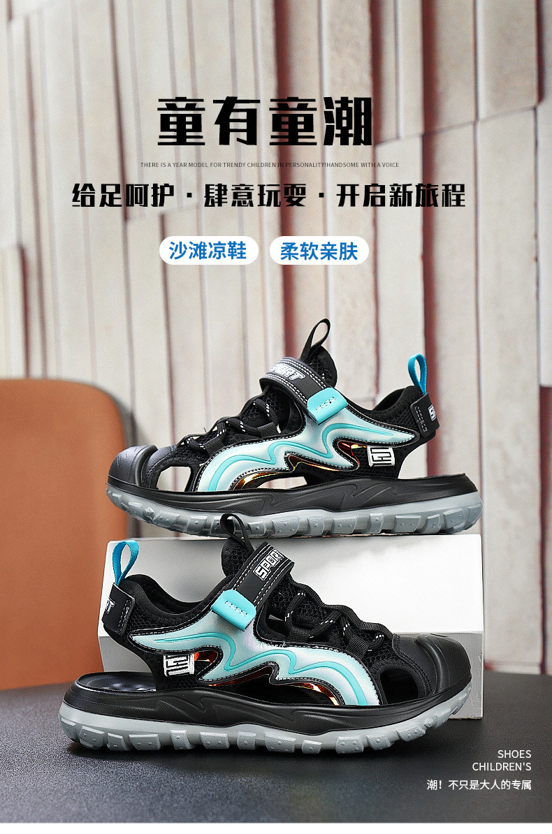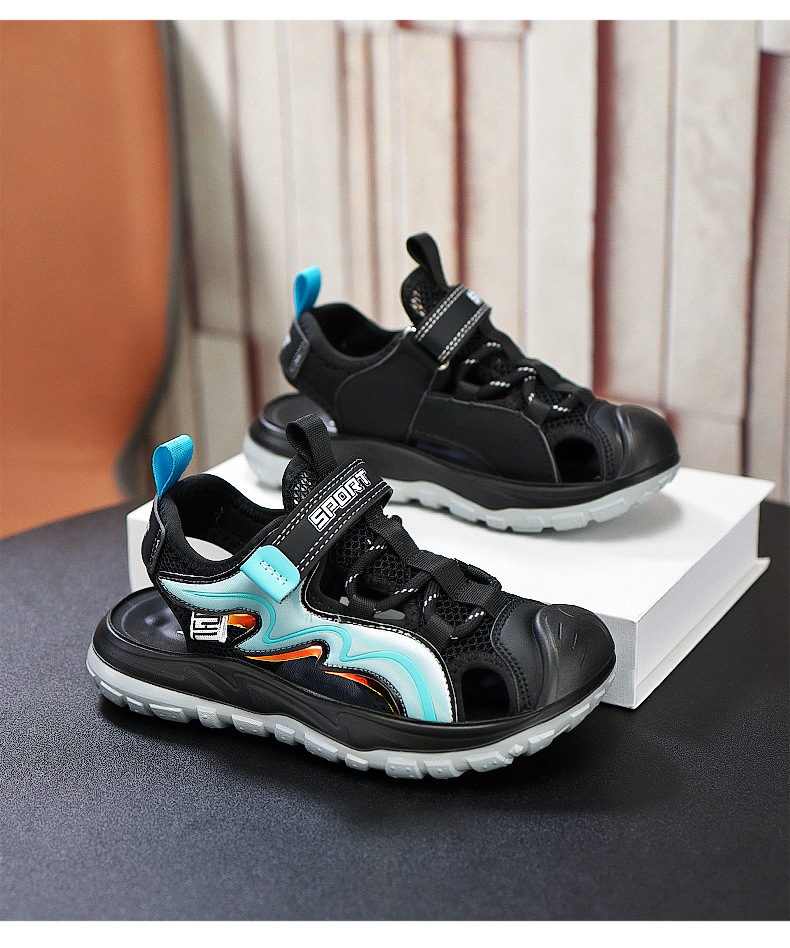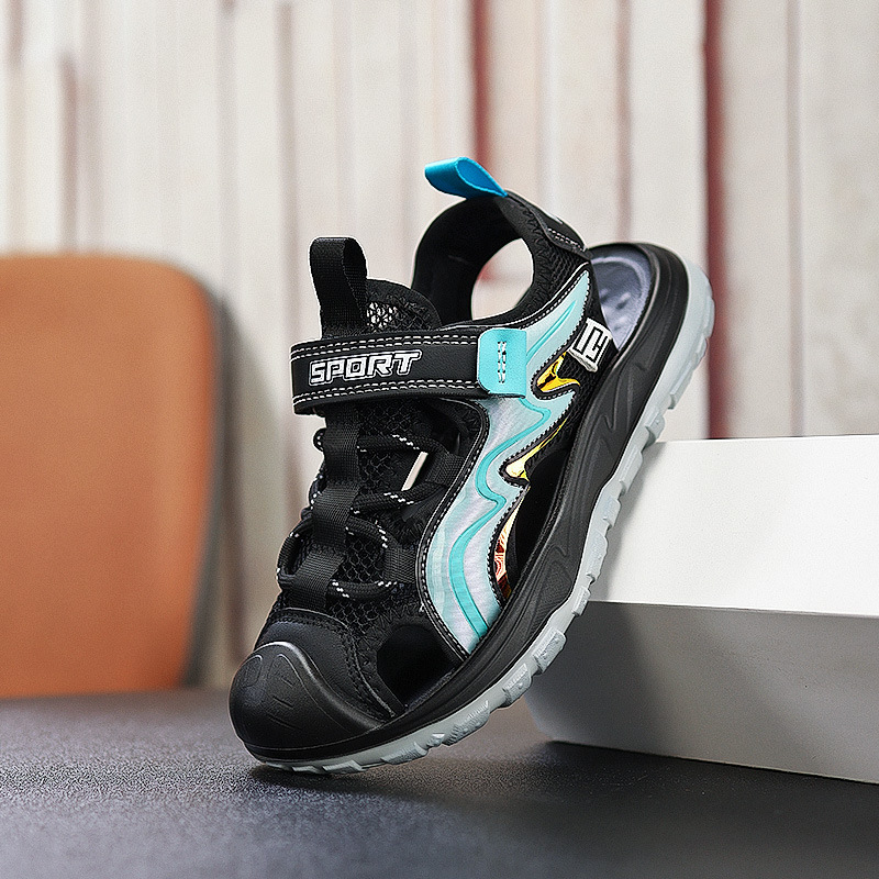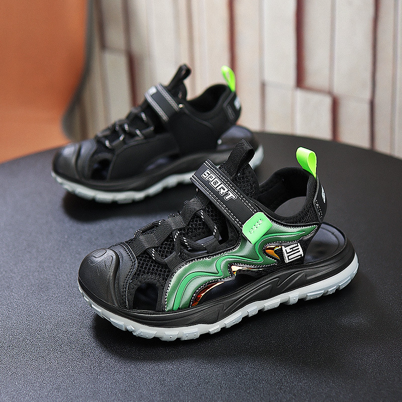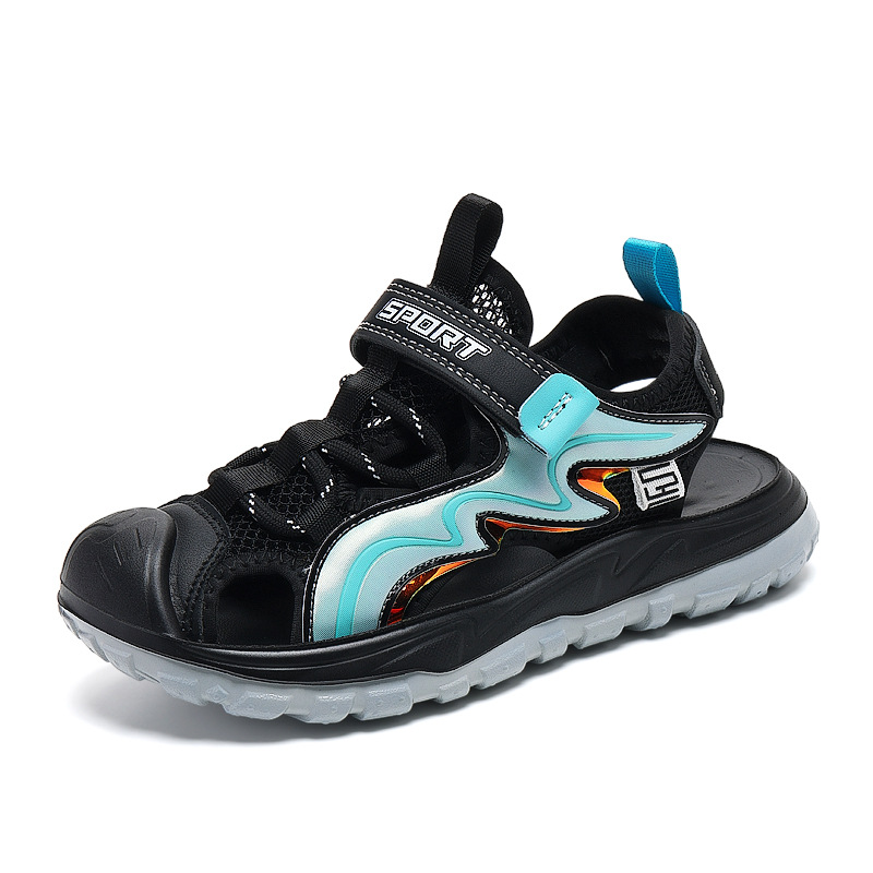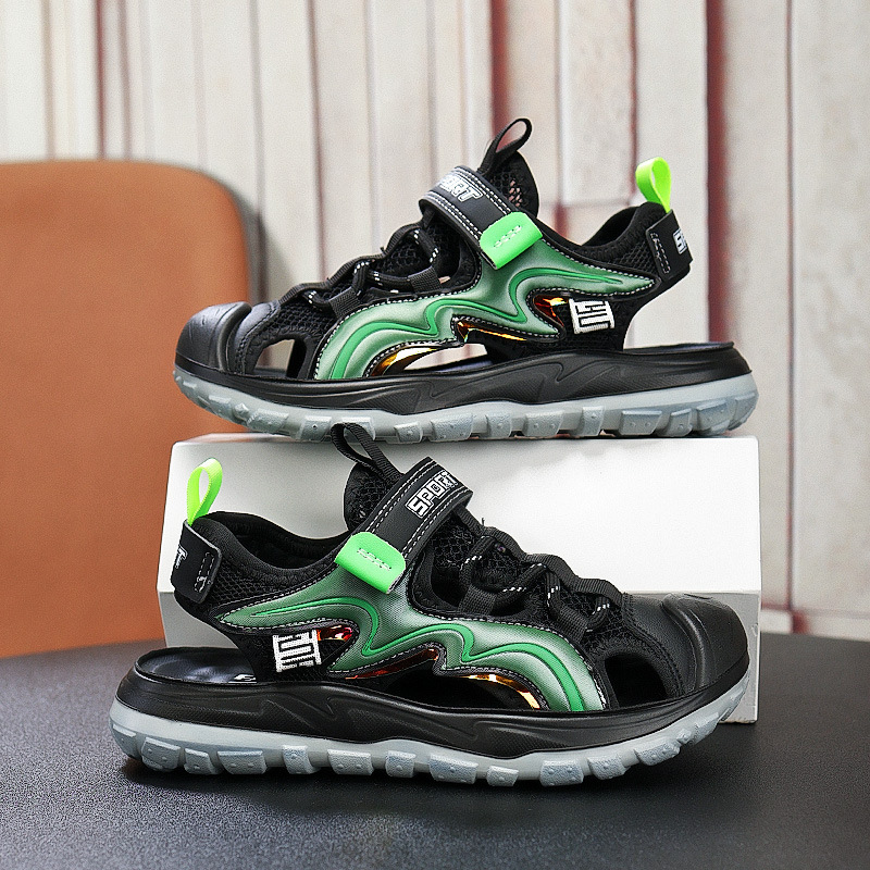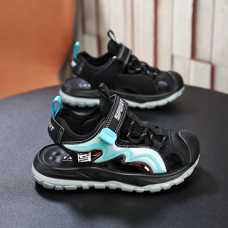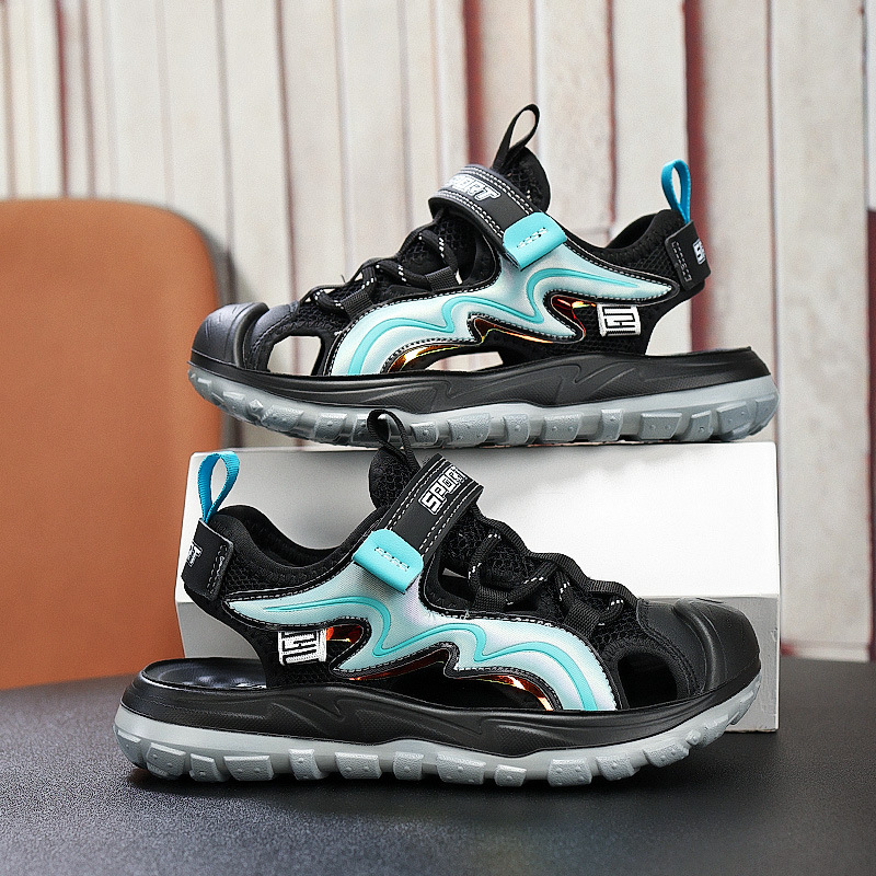 Мальчиковые закрытые сандалии 2025 лето новый стиль с липучкой, пляжная обувь для больших детей, спортивные нескользящие детские сандалии для мальчиков.
