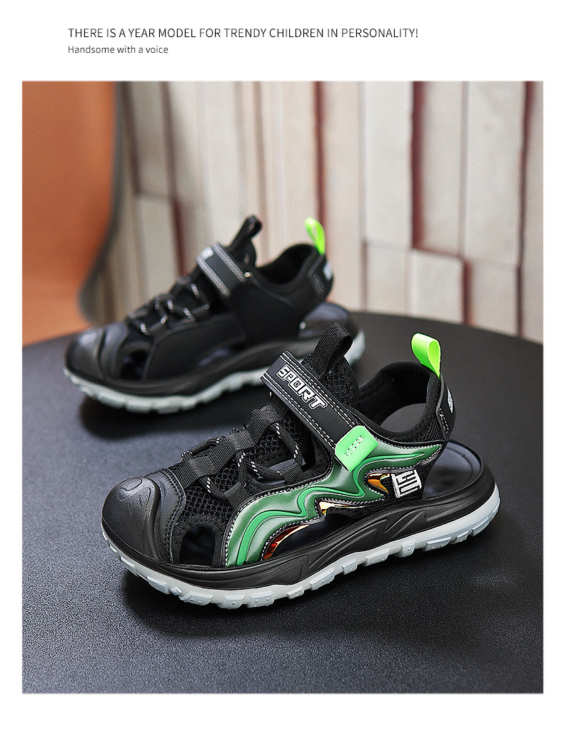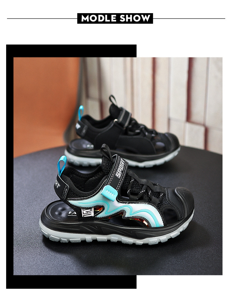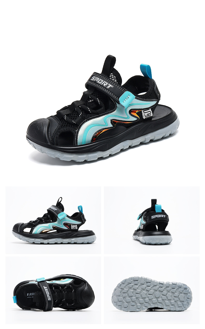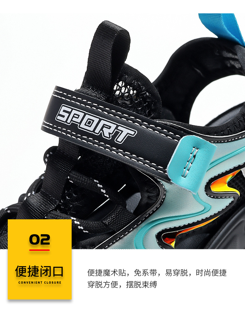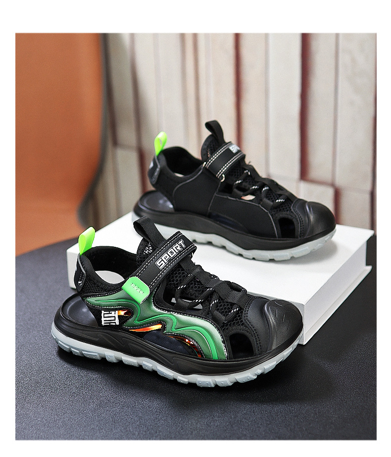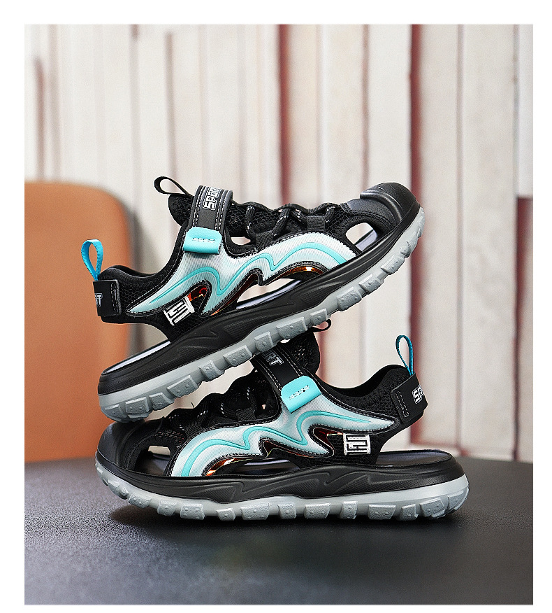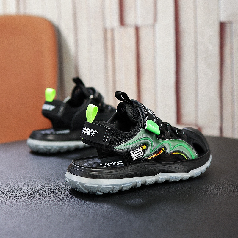 Мальчиковые закрытые сандалии 2025 лето новый стиль с липучкой, пляжная обувь для больших детей, спортивные нескользящие детские сандалии для мальчиков.