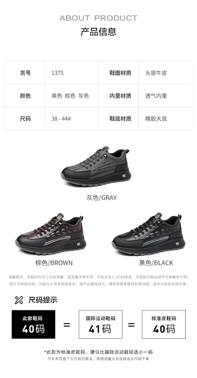 友情提示:本款男靴偏大一码,比如您平时穿其他品牌皮鞋41码,这个款式买40码就可以,若运动鞋穿41码,这个穿39码就可以,脚胖的买家平时皮鞋穿多大这个就买多大的,此为掌柜的试穿结果,仅供参考,不做大小码不符退换货的理由!