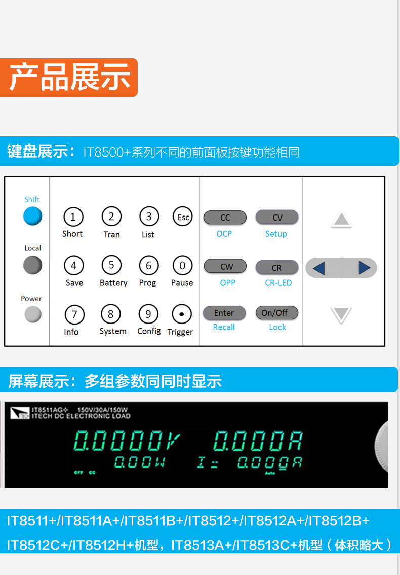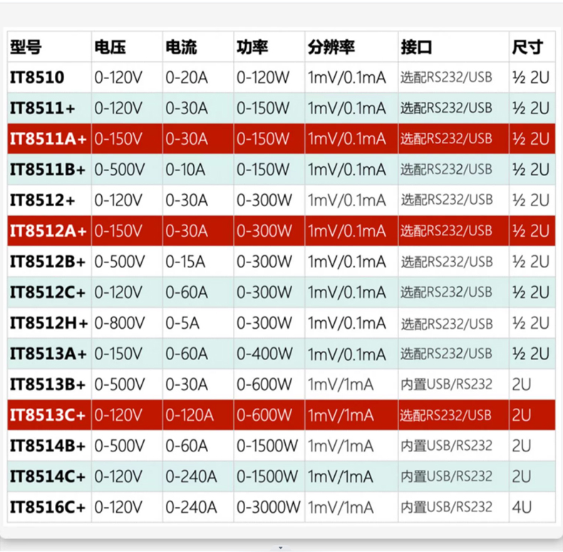 <<IT8511A+(150V/30A/150W)【】>>; <<8511+(120V/30A/150W)>>; <<IT8511B+(500V/10A/150W)>>; <<IT8512A+ (150 В/30 А/300 Вт) [Рекомендуется]>>; <<IT8512B+(500V/1/300W)>>; <<IT8512C+(120V/60A/300W)>>; <<IT8512H+(800V//300W)>>; <<IT8513A+ (150V/60A/400W)>>; <<IT8513B+(500V/30A /600W)>>; <<IT8513C+(120V/120A/600W)>>; <<IT8514B+(500V/60A/1500W)>>; <<IT8514C+(120V/240A/1500W)>>; <<IT8516C+(120V/240A/3000W)>>; <<IT8510(120V/20A/120W)>>; <<IT8511G+ (150 В, 30 А, 150 Вт) с тестом на пульсацию/быструю зарядку (с USB)>>; <<IT8512G+ (150 В, 30 А, 300 Вт) с пульсацией (с USB LAN)>>; <<IT8512+(120V/30A/300W)>>