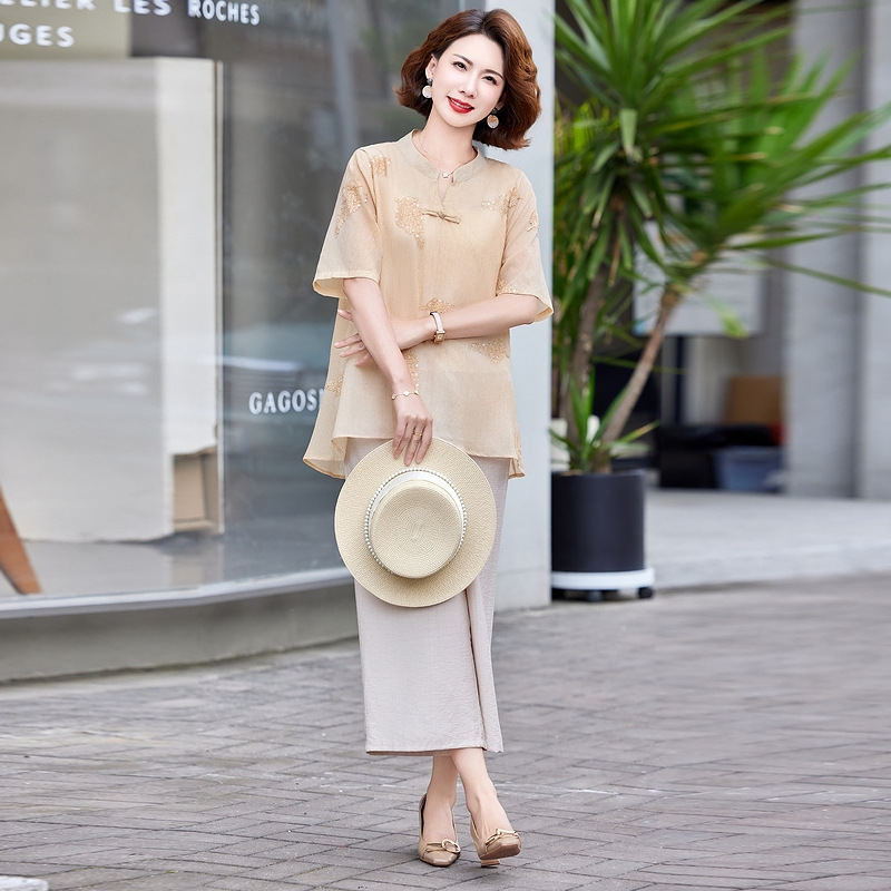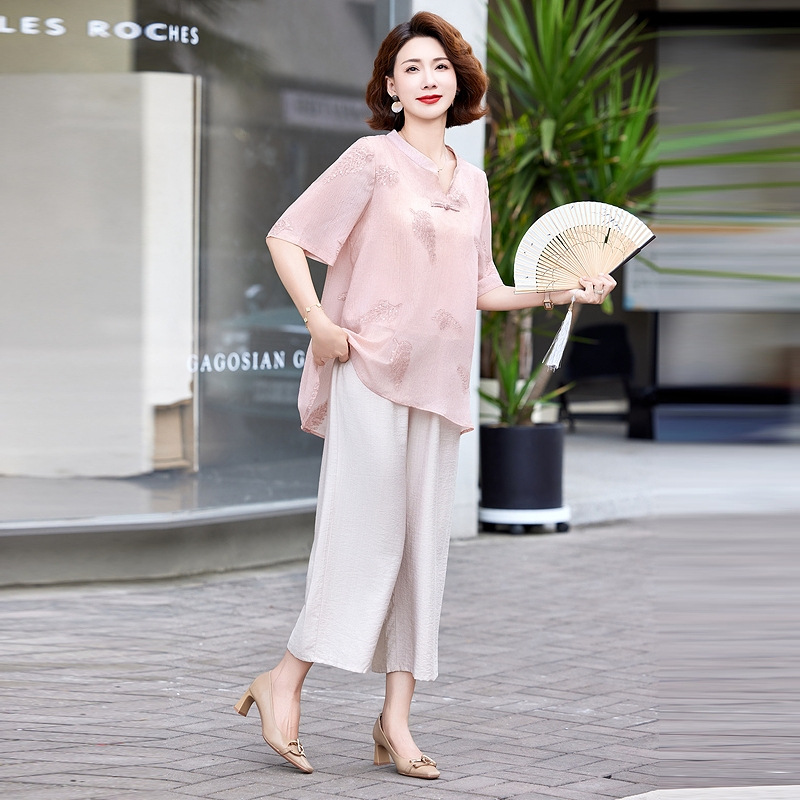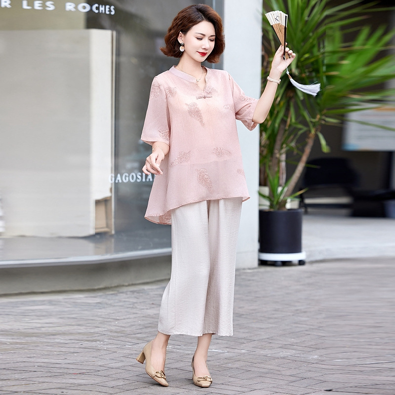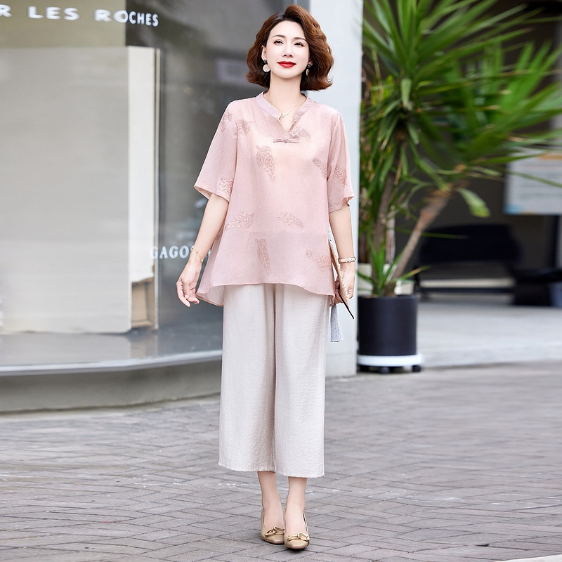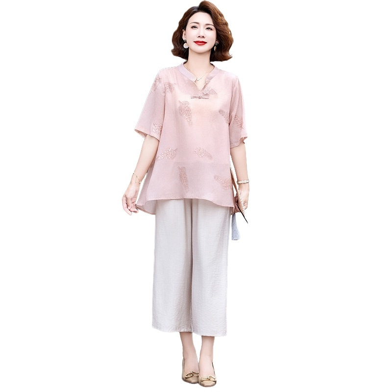 Мама наряд новый китайский стиль иностранная рубашка 2025 летняя новая рубашка с короткими рукавами среднего возраста женская футболка с V-образным вырезом