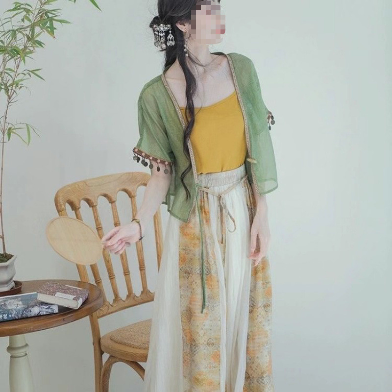 Фиолетовый кардиган + подтяжки + юбка; Зеленый кардиган с маслом сосны + подтяжки + юбка; Желтый кардиган Mulberry + подтяжки + юбка; Зеленый кардиган с маслом сосны + желтые подтяжки + белая юбка
