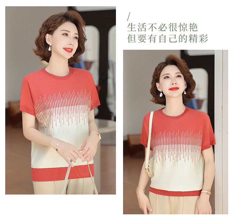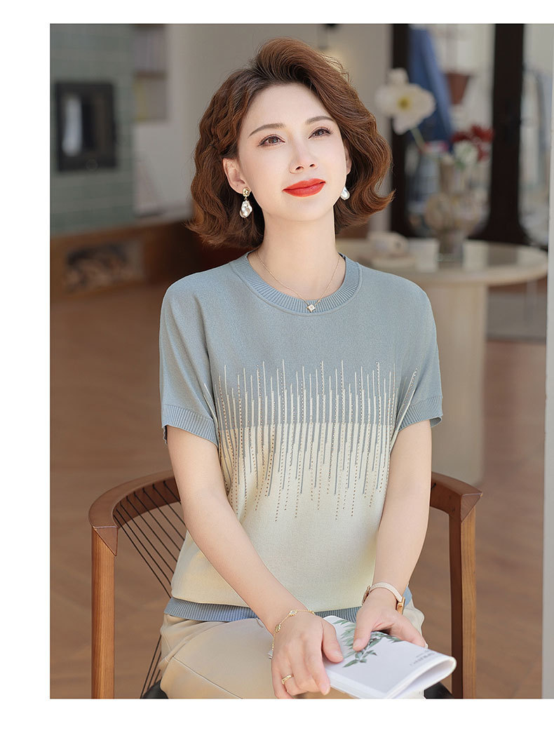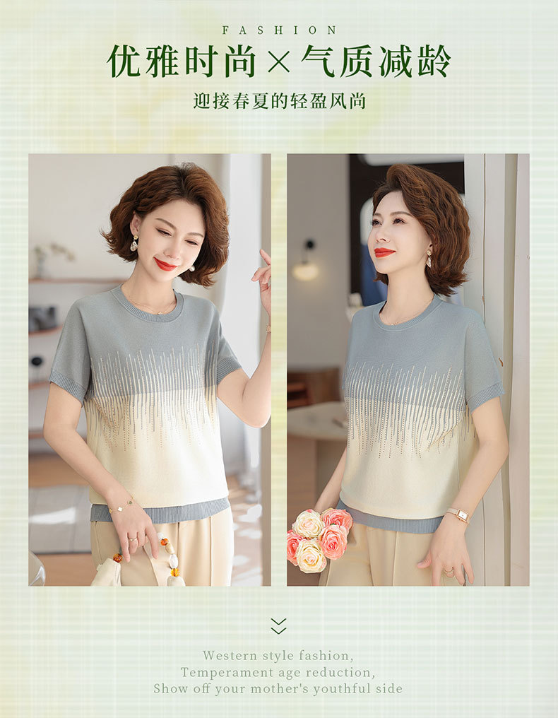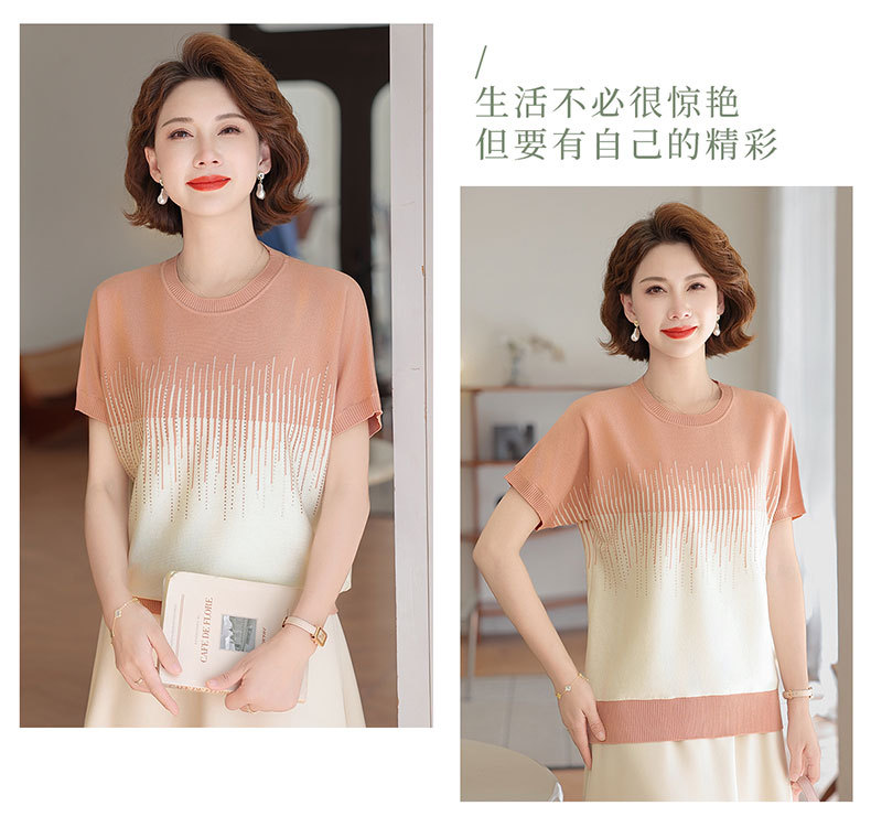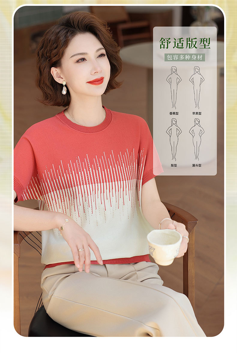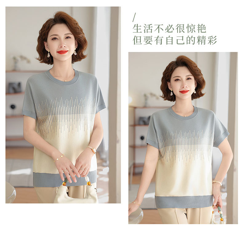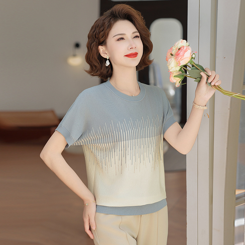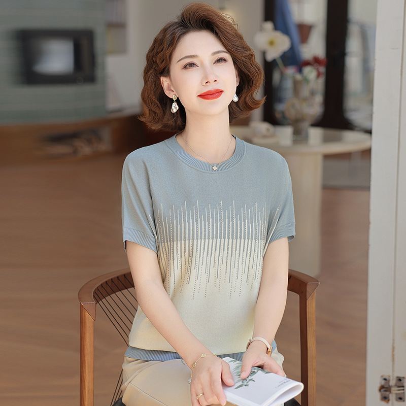 Мама летнее платье темперамент с короткими рукавами 2025 новый средний и пожилой женский свитер с ледяным шелком футболка с круглым вырезом