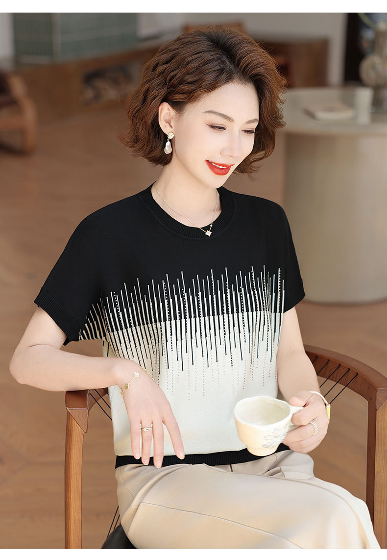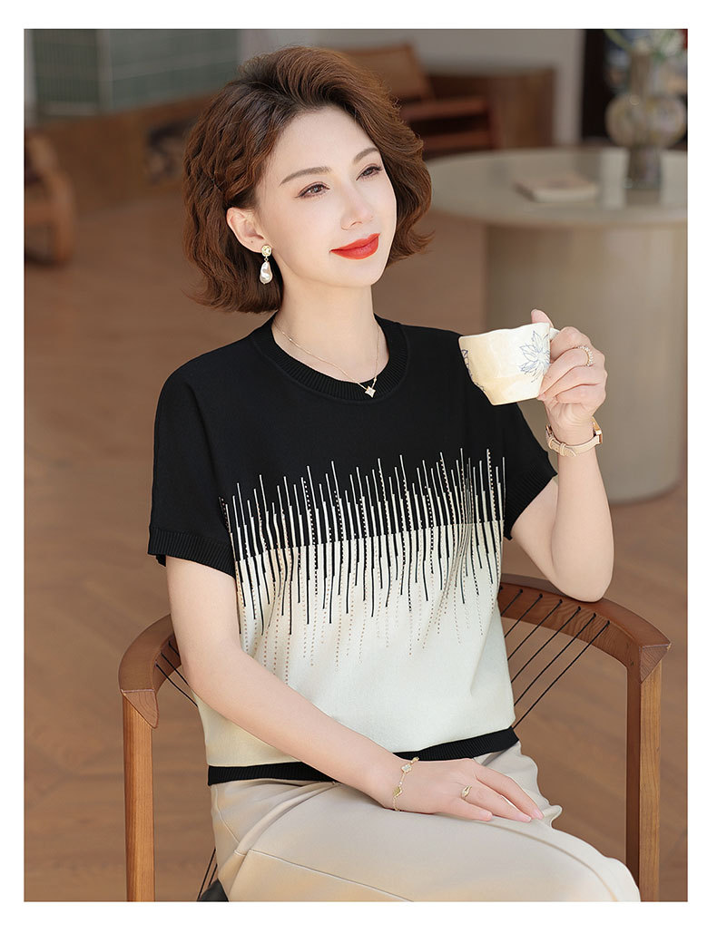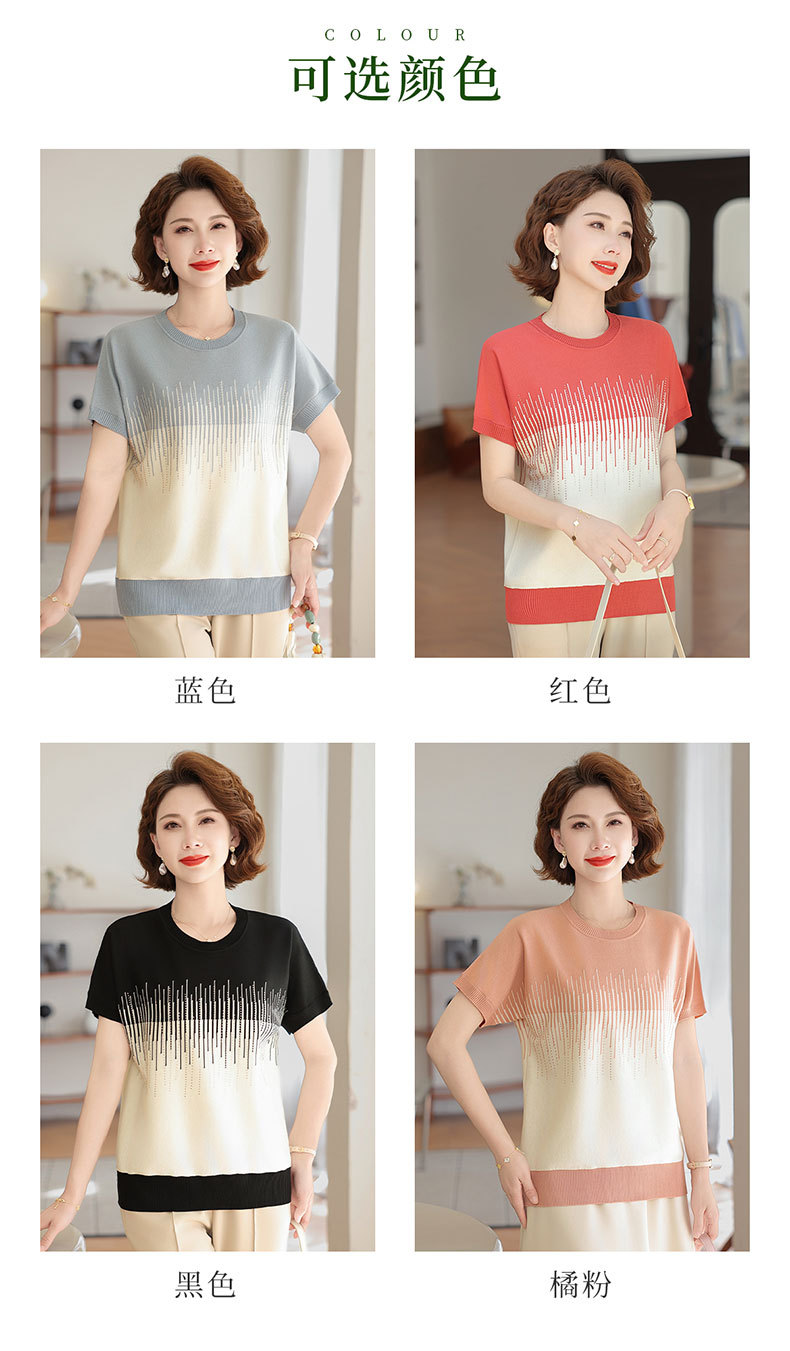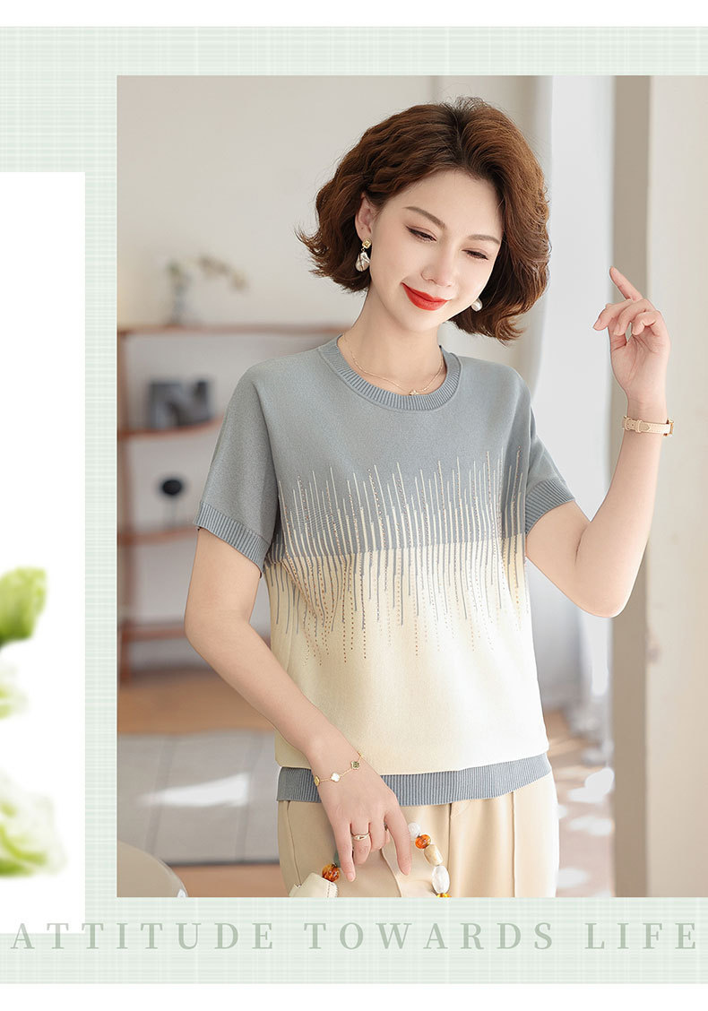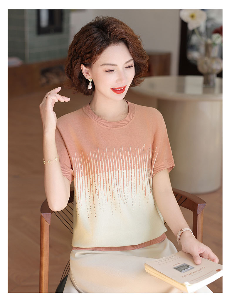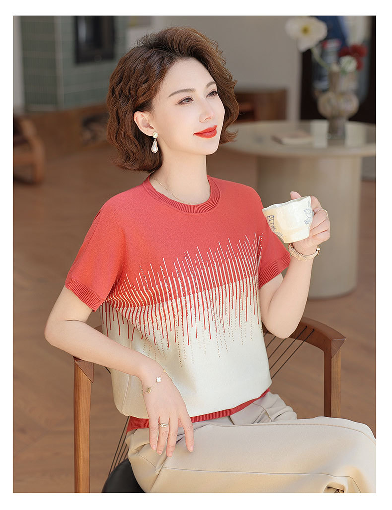 Мама летнее платье темперамент с короткими рукавами 2025 новый средний и пожилой женский свитер с ледяным шелком футболка с круглым вырезом