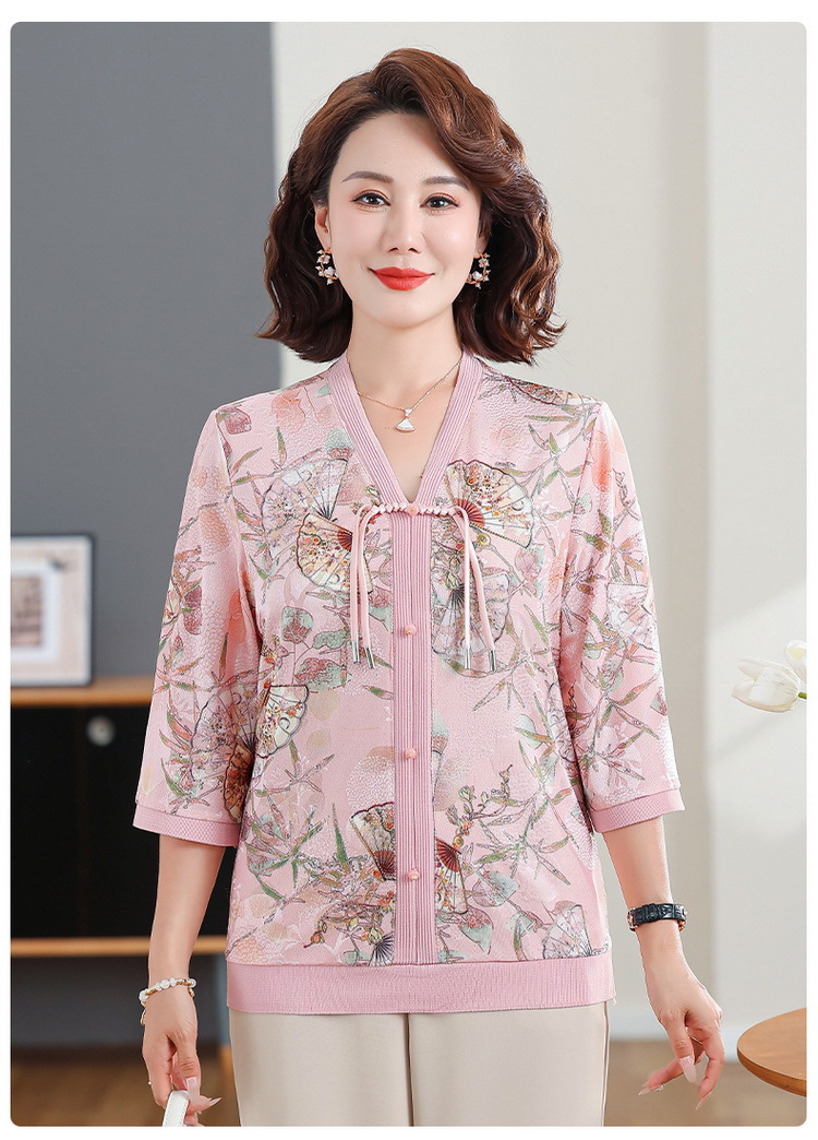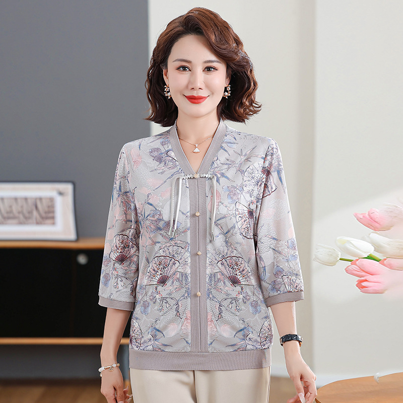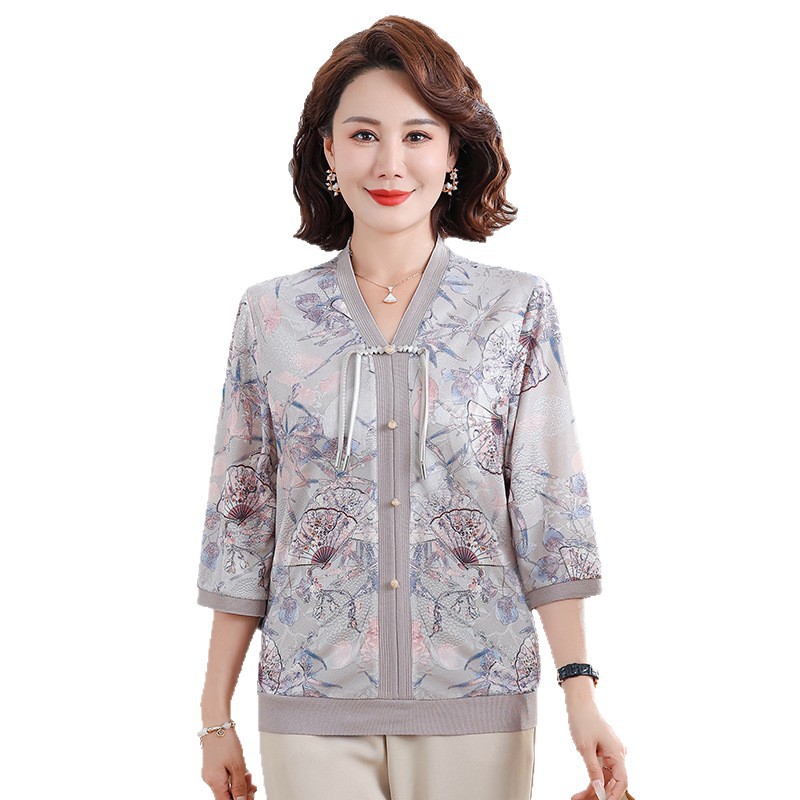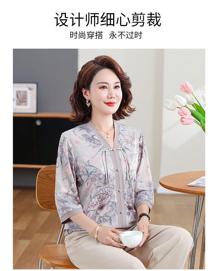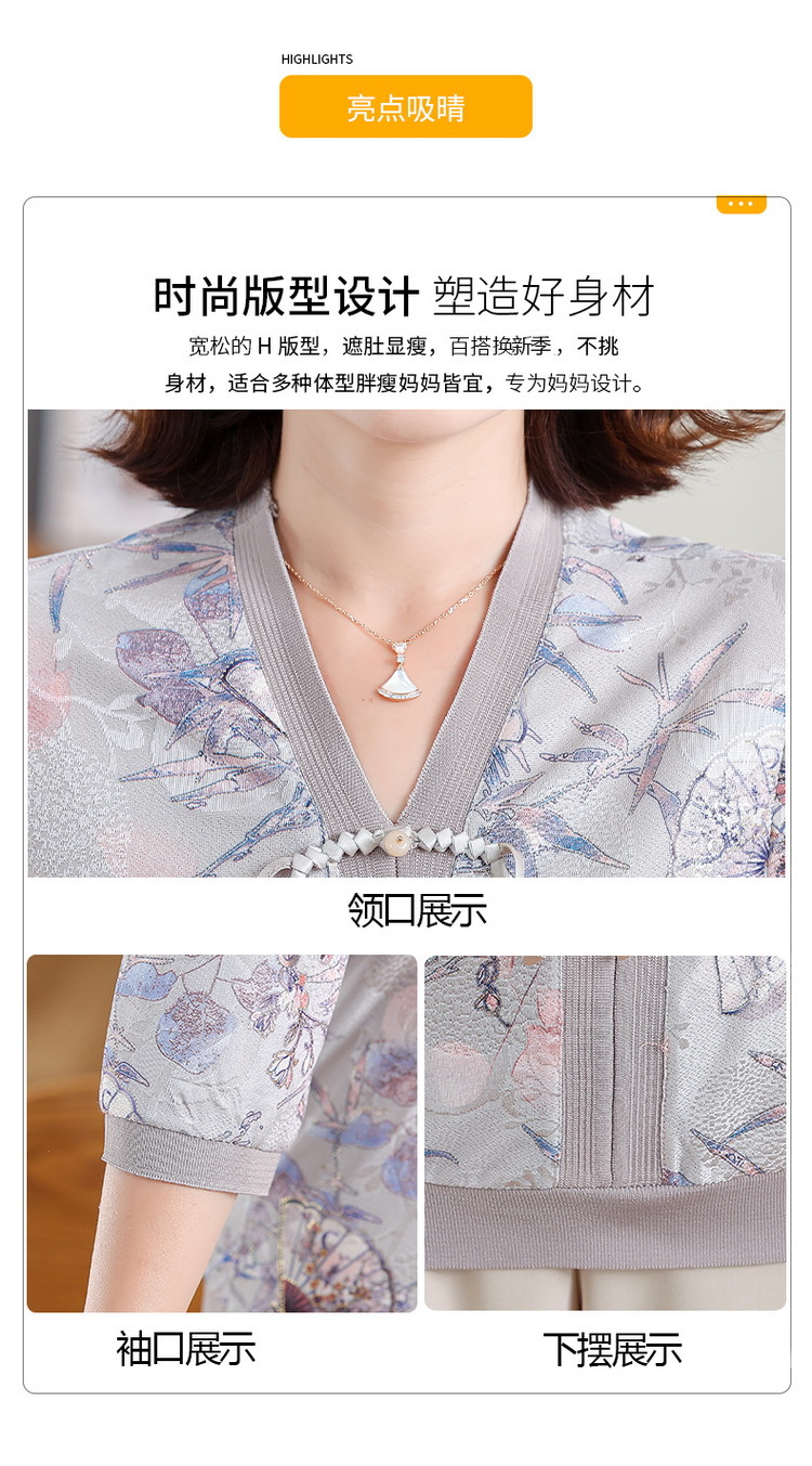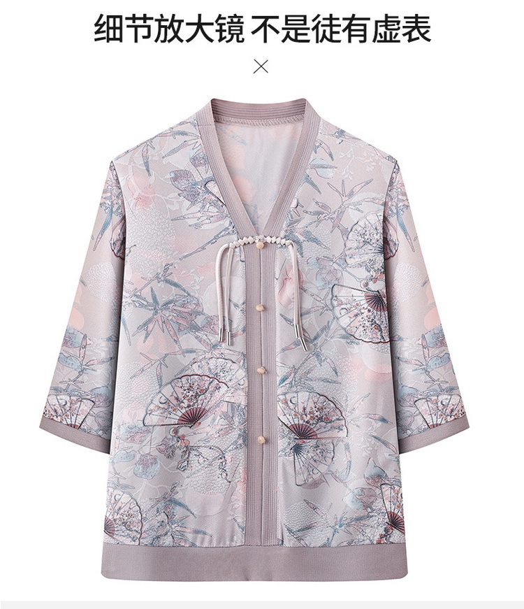 2025 новой летней одежды для мам, новые футболки с короткими рукавами в стиле шинуазри, модные рубашки, уменьшающие возраст, топы из ледяного шелка для женщин среднего и пожилого возраста.