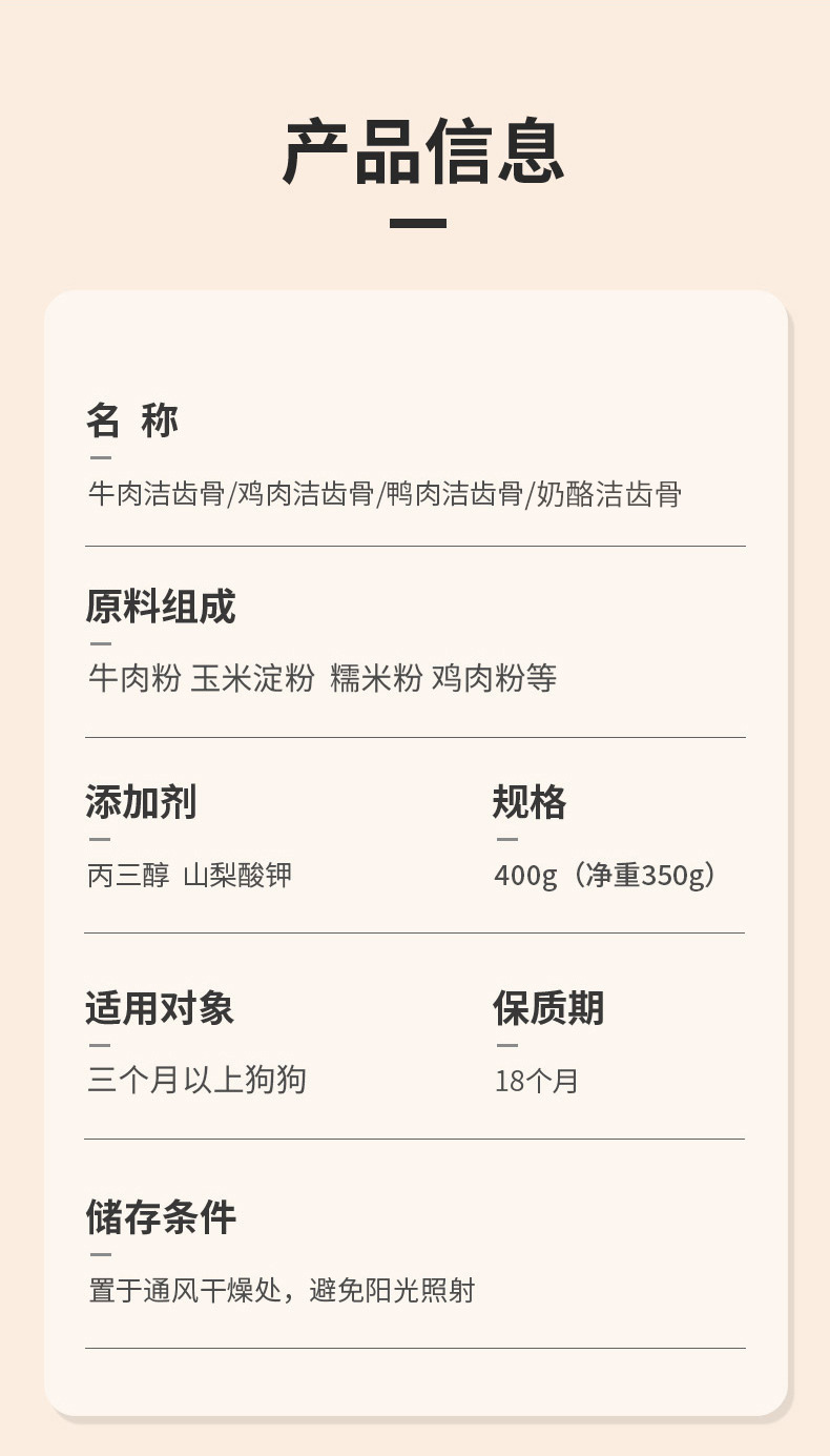 Чистка зубов и коренные кости со вкусом говядины 400г; Чистка зубов и коренные кости со вкусом утки 400г; Чистка зубов и коренные кости со вкусом курицы 400г; Палочка для чистки костей со вкусом сыра 400г