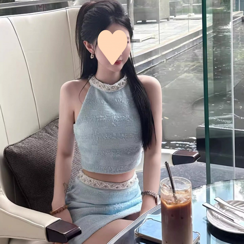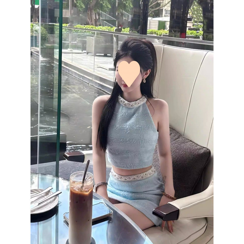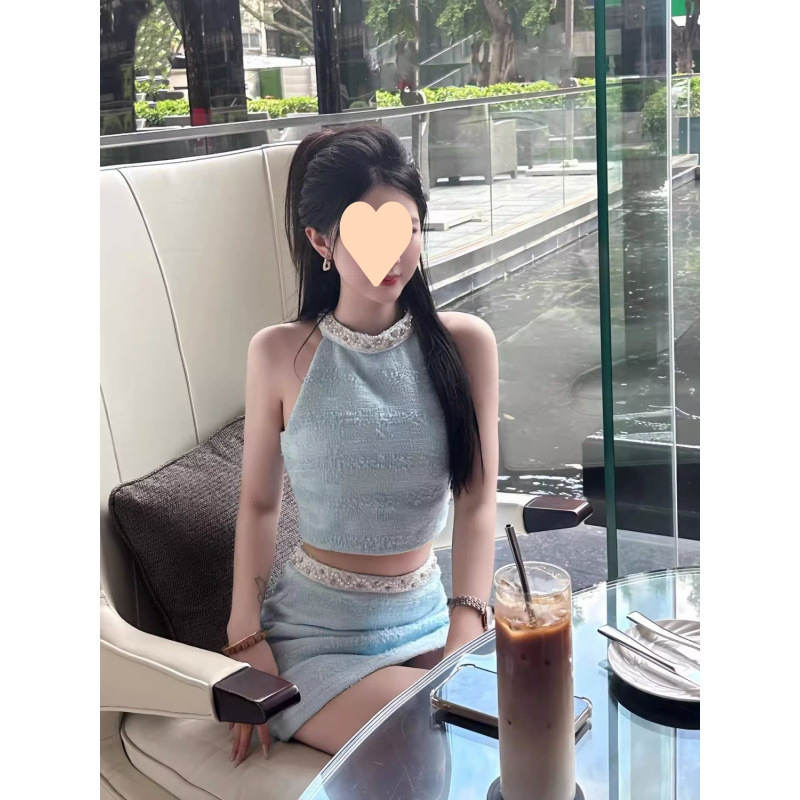 Летний женский костюм в французском стиле: топ без рукавов с жемчужной отделкой и юбка-миди с высокой талией, комплект из двух предметов