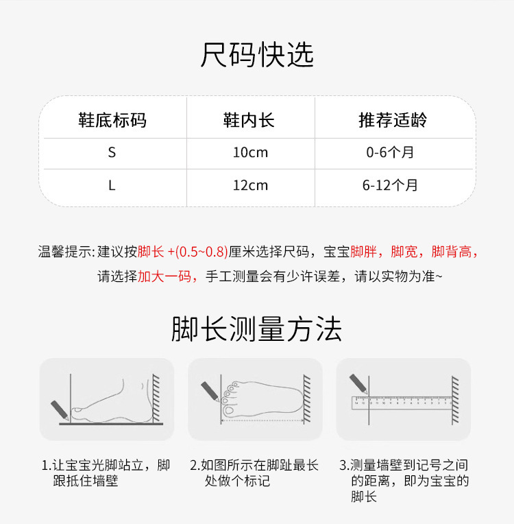 Внутренняя длина 10 см — рекомендуется для детей от 0 до 6 месяцев.; Внутренняя длина 12 см — рекомендуется 6–12 месяцев.