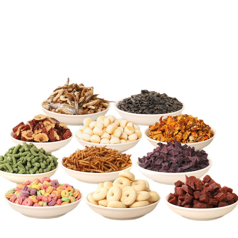 Цельное зерно; Еда для прорезывания зубов; Маленький масляный подсолнух; смешанные сушеные овощи; сушеная морковь; пищевые черви; маленькие булочки на пару; сушеная рыба; сушеные креветки; три в одном; гранулы люцерны; кубики говядины; кубики тыквы; красное кольцо с датой; кукурузные хлопья; Фиолетовый сладкий картофель без капсул; Лактобактериальное печенье; Леденящийся тофу; фризильдried рыба; Ледяные креветки; Ледяные хлебные черви; Ледяная курица; Гранулы яичного желтка сублимированного производства; Ледяная пятикратная доза