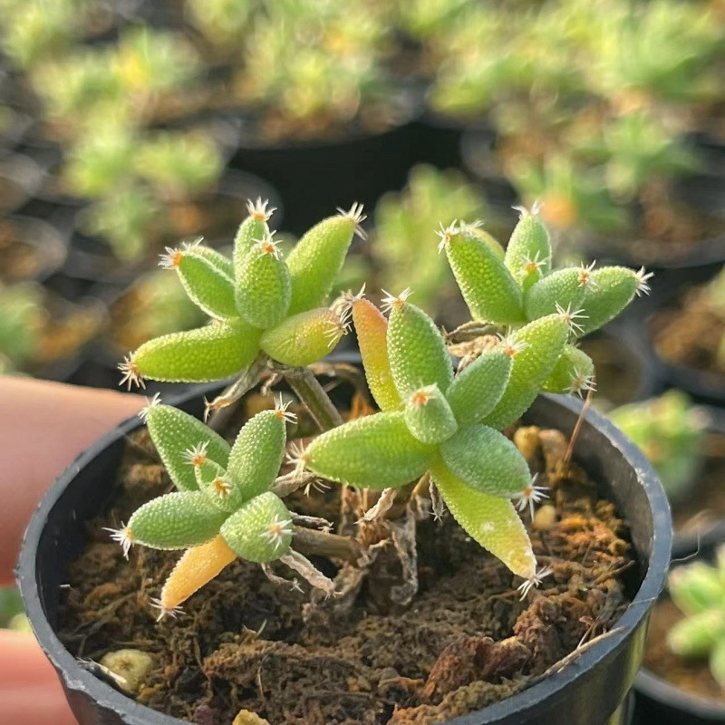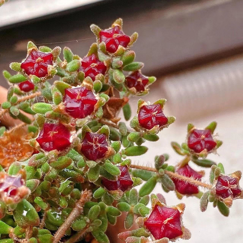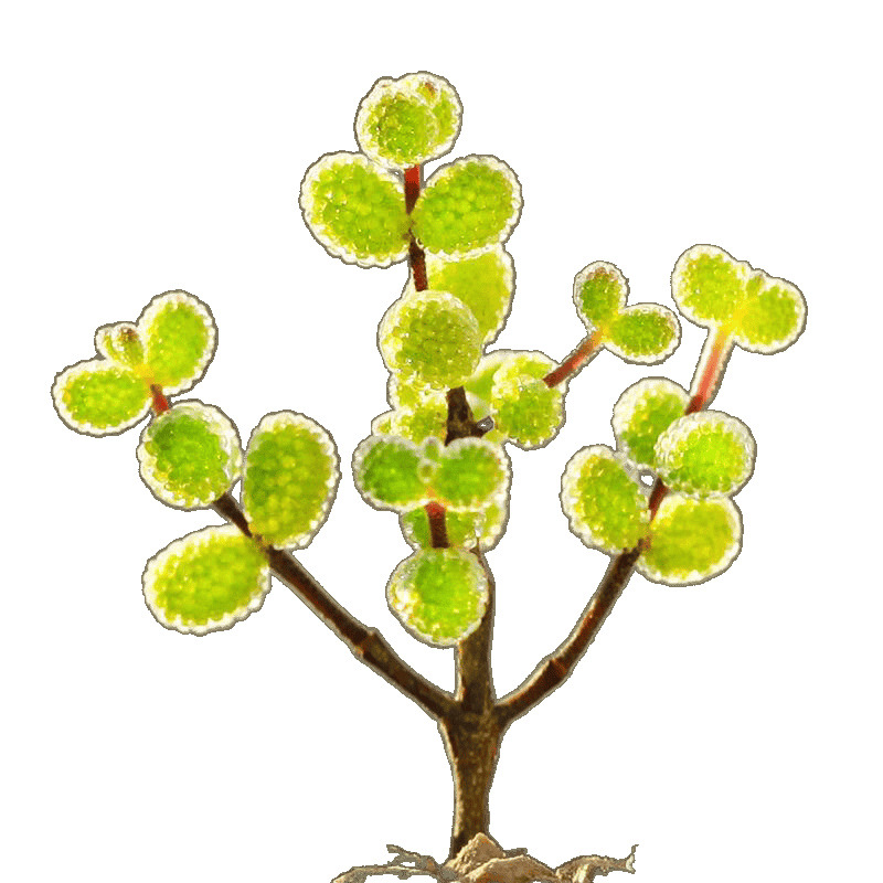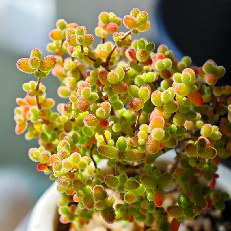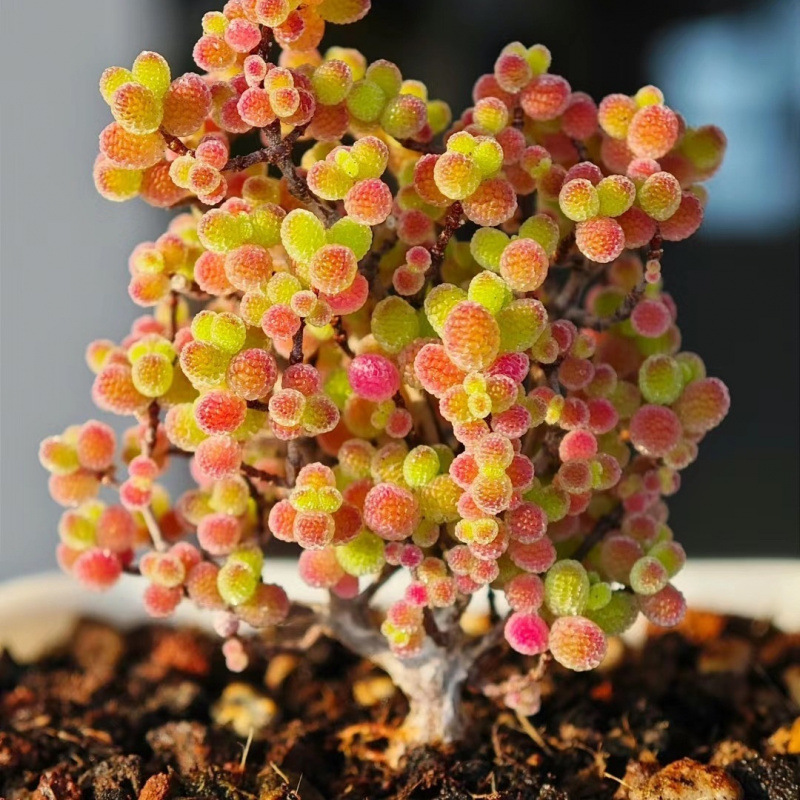 Редкое комнатное суккулентное растение с плотными листьями, ветками в форме конфет и стеблями сушеного абрикоса, небольшой горшок с старым сучком.