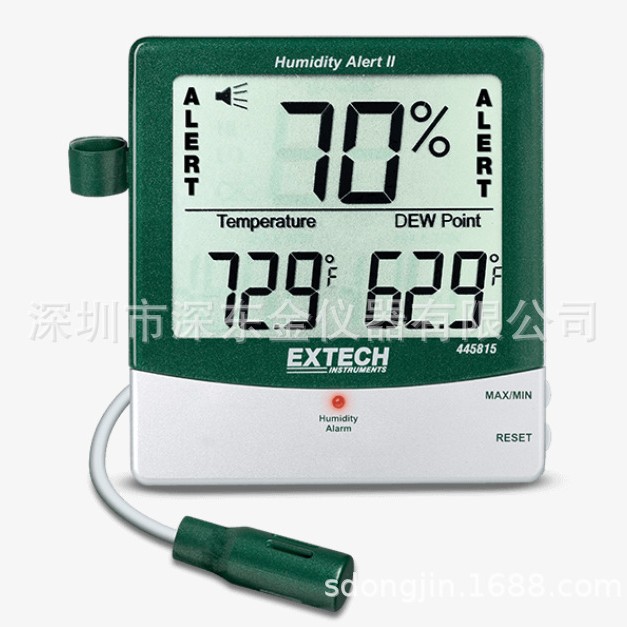这款湿度计带有报警和远程探头,具有相对湿度、温度和露点的大型三重显示。内置支架可放置在桌子上,但也可以使用附带的支架安装在墙上。视觉和听觉报警会在湿度水平高于或低于可调设定点时发出警告。该仪器还存储最大和最小读数。远程探头可延长18英寸,用于测量墙壁后面。非常适合在可能发生霉菌的潮湿环境中使用。附带内置支架、墙装支架和2节AAA电池。