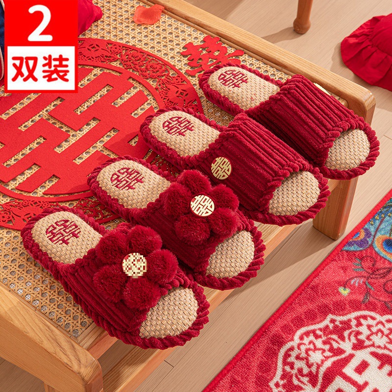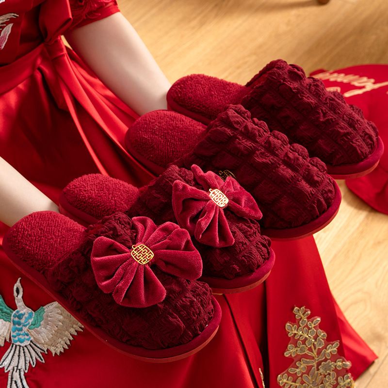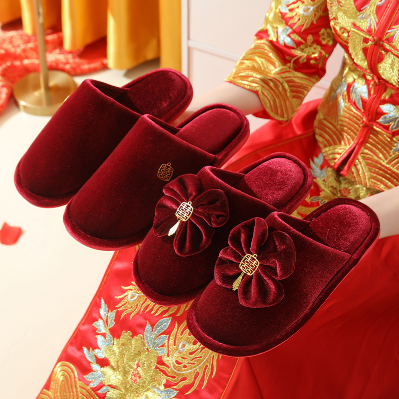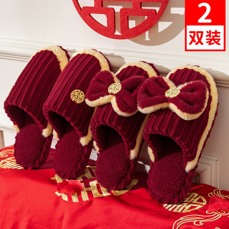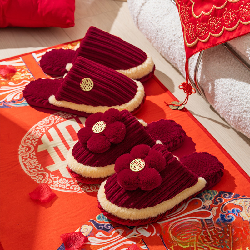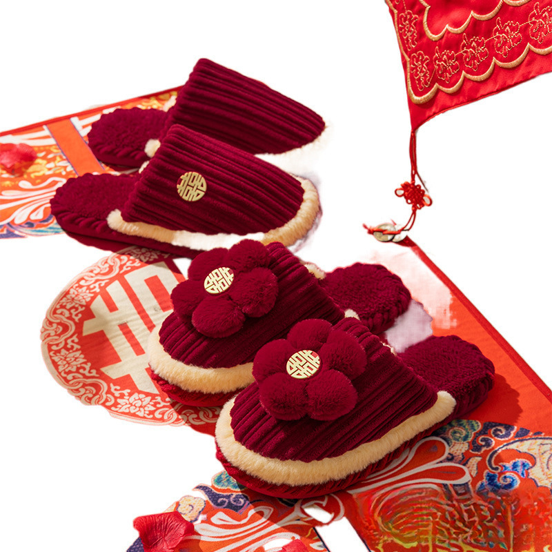 Свадебные тапочки 2024 новые праздничные красные пара для молодоженов нарядные меховые тапочки доступная роскошь толстая подошва зима