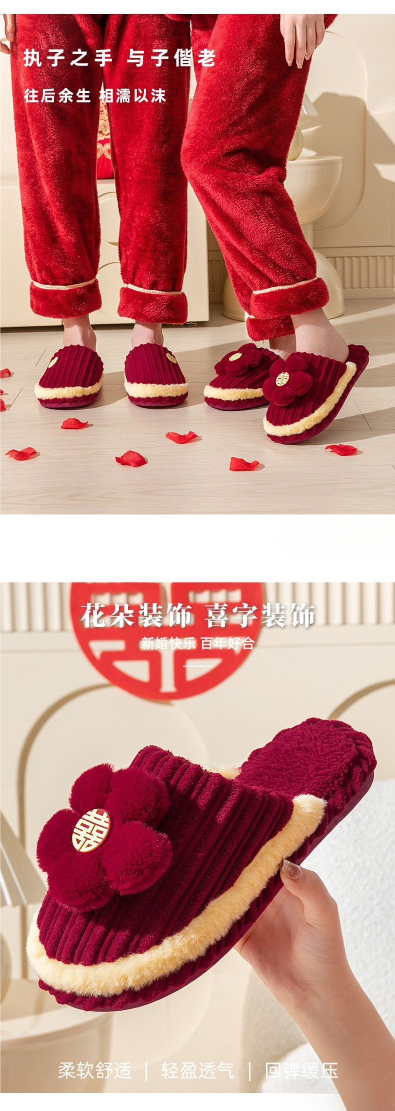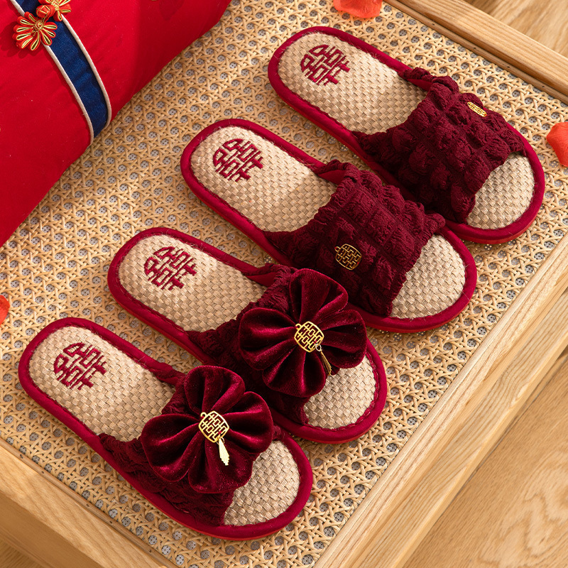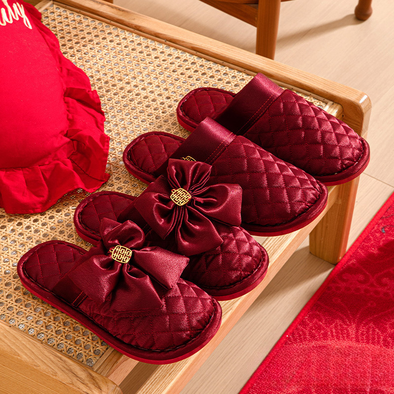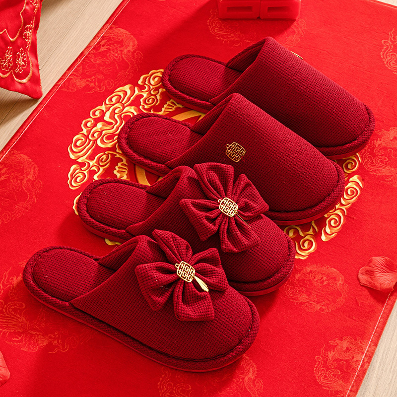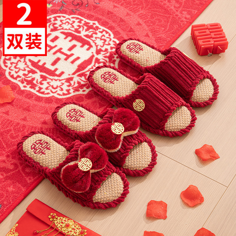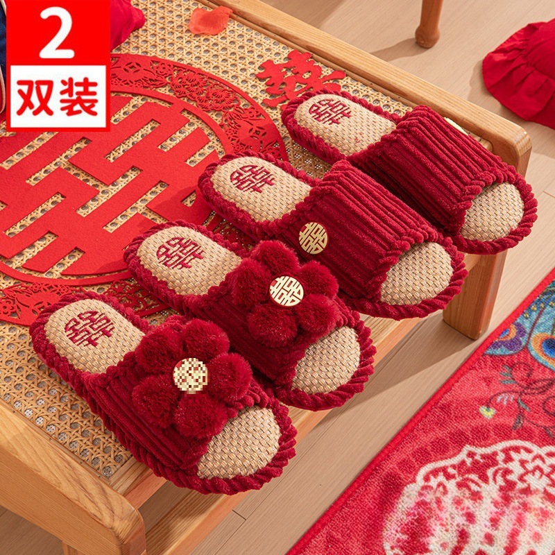 Свадебные тапочки 2024 новые праздничные красные пара для молодоженов нарядные меховые тапочки доступная роскошь толстая подошва зима