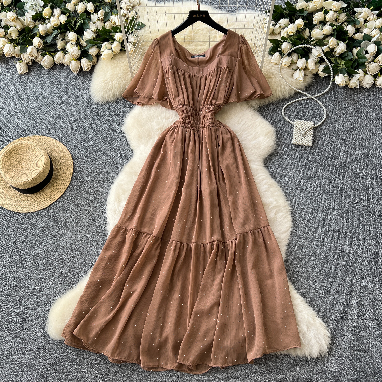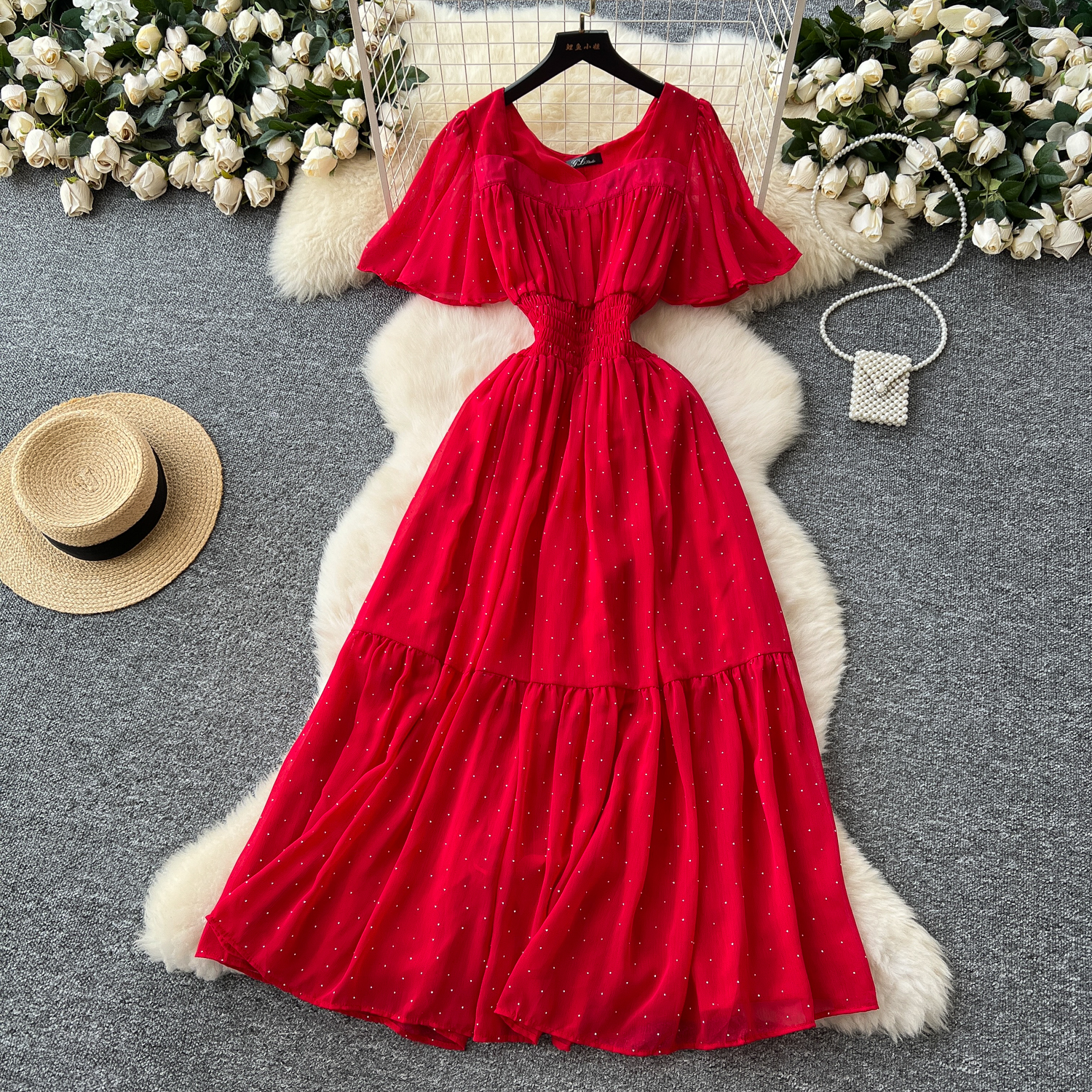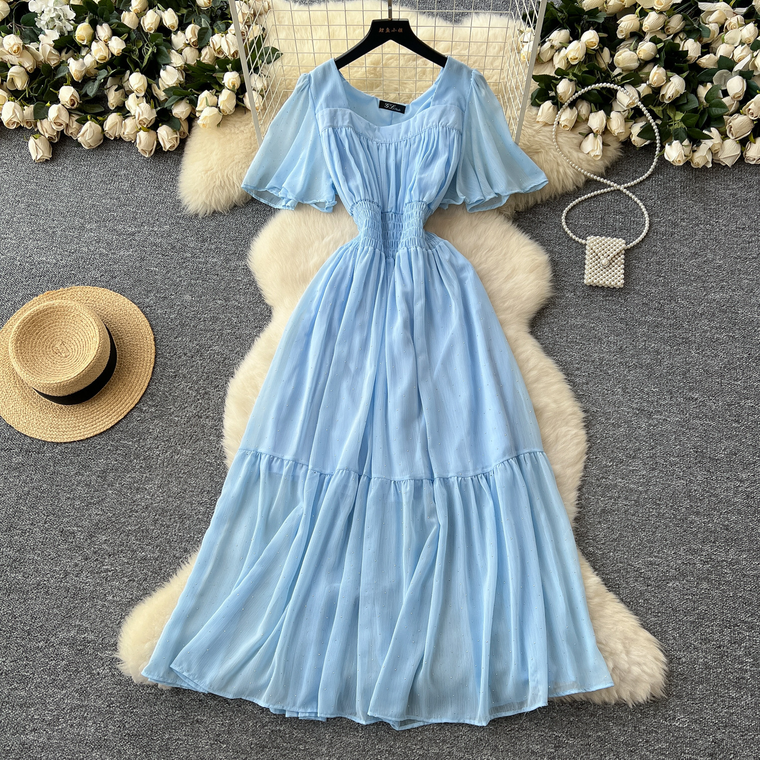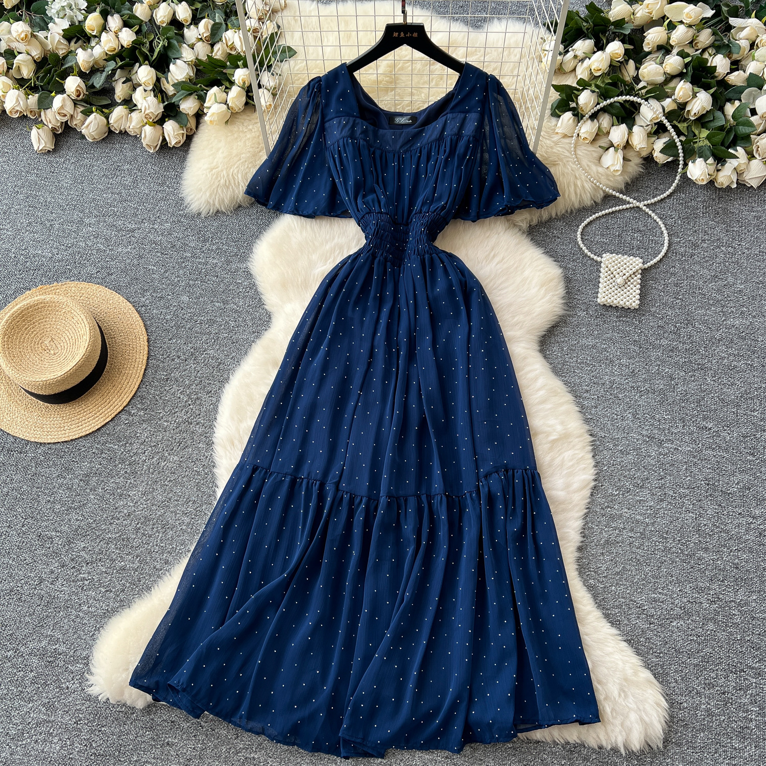 Французское ретро с квадратным воротником маленький летающий рукав с талией Горячими бриллиантами шифоновое платье женская летняя тонкая темпераментная длинная юбка